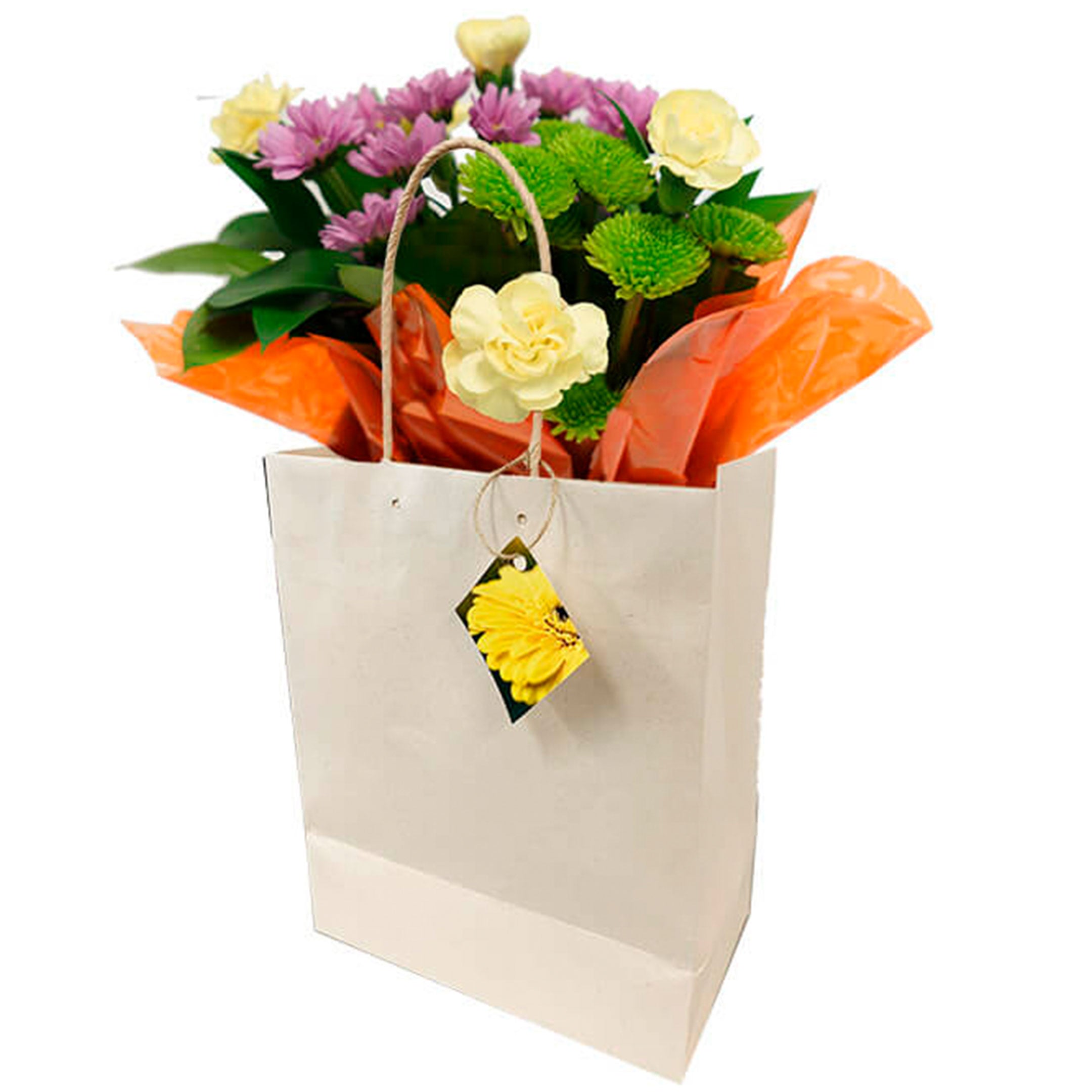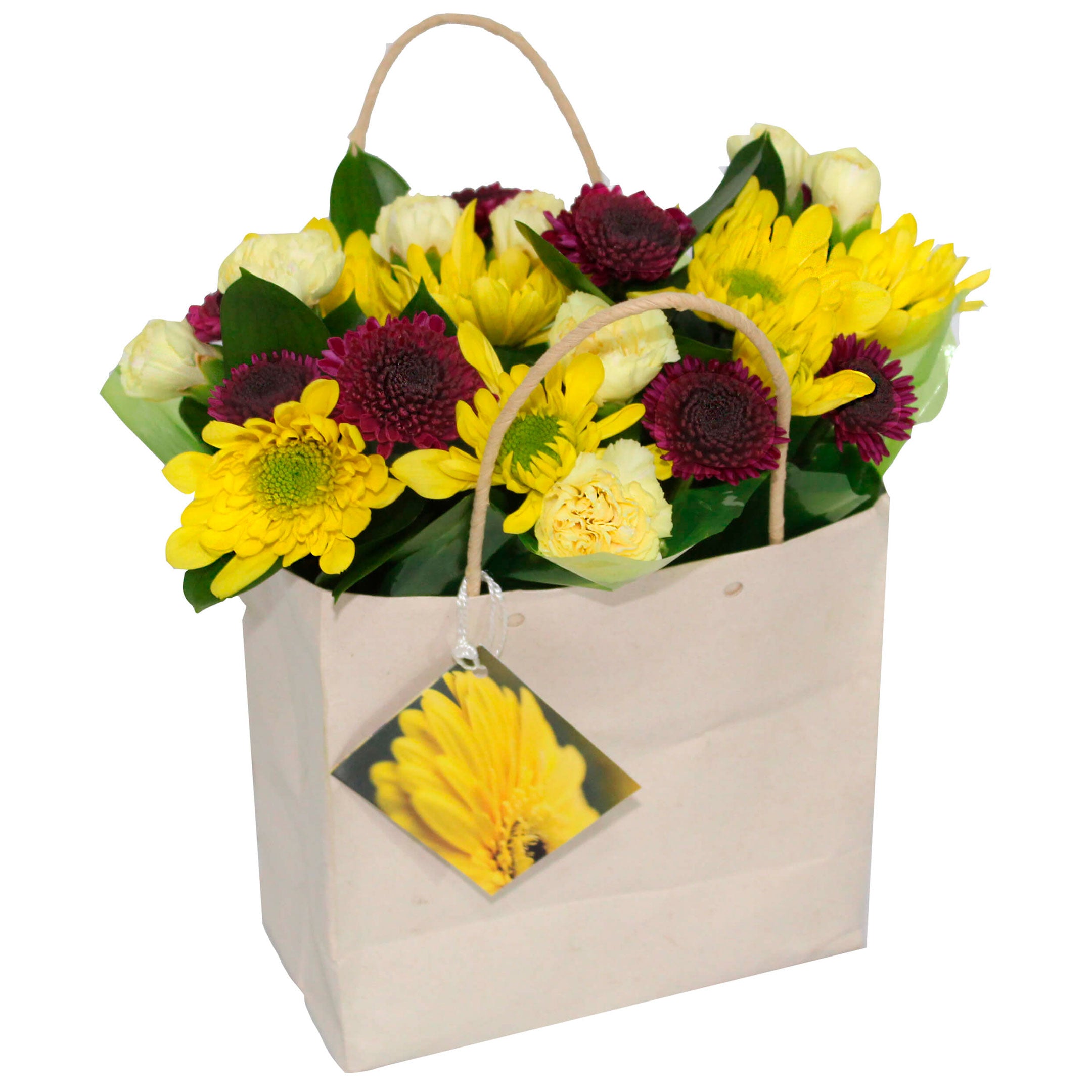 2 stems Micropoms/Novelty Poms, 1 Stem Button Poms, 3 Stems Mini Carnation, 2,5 Stems Ruscus, Paper Bag with Cellophane Decorations in a seasonal color, 1 special decorative card, liner.
