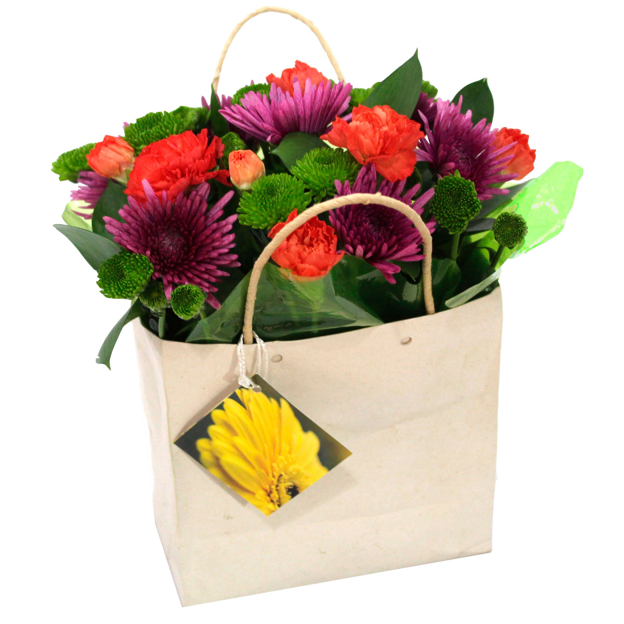 2 stems Micropoms/Novelty Poms, 1 Stem Button Poms, 3 Stems Mini Carnation, 2,5 Stems Ruscus, Paper Bag with Cellophane Decorations in a seasonal color, 1 special decorative card, liner.