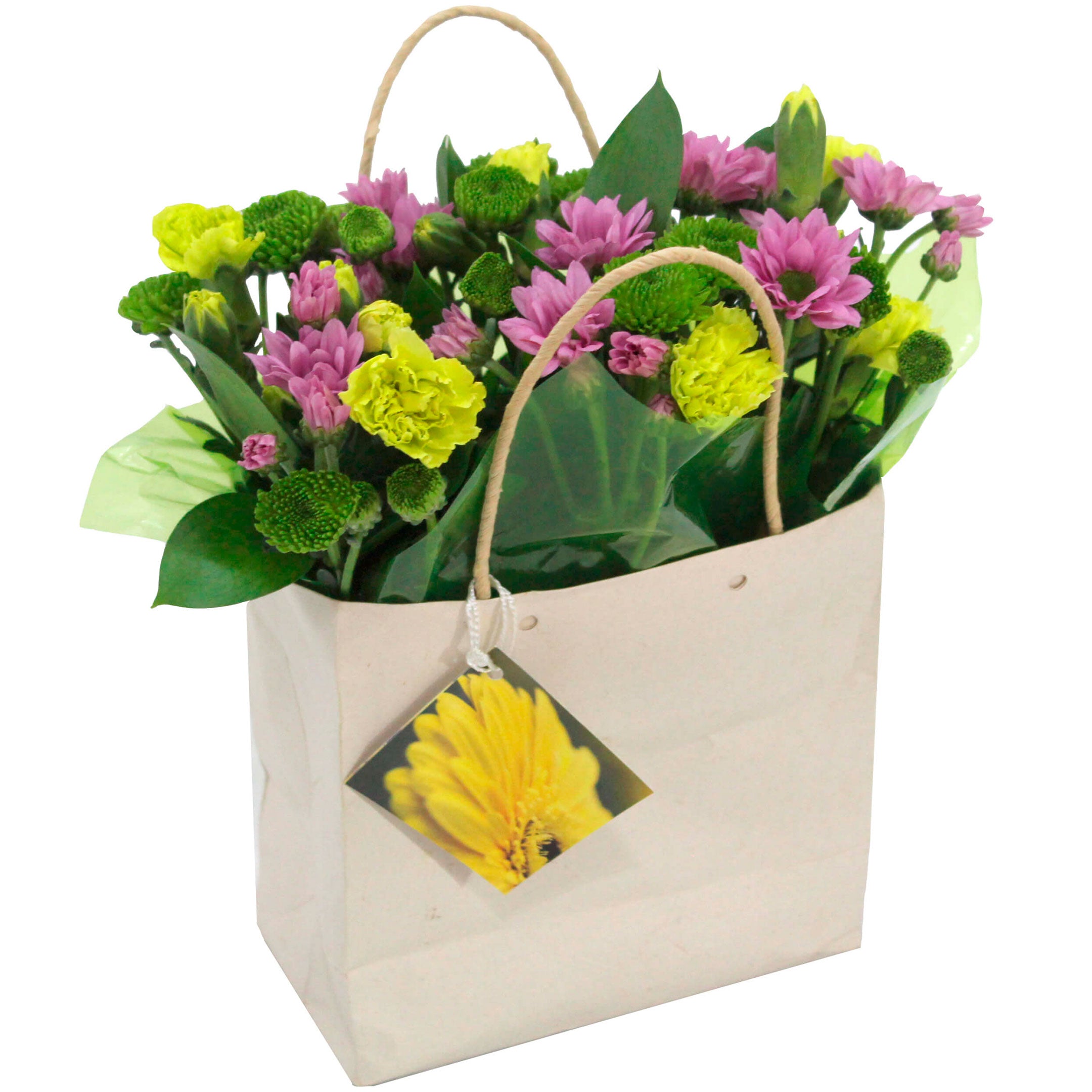 2 stems Micropoms/Novelty Poms, 1 Stem Button Poms, 3 Stems Mini Carnation, 2,5 Stems Ruscus, Paper Bag with Cellophane Decorations in a seasonal color, 1 special decorative card, liner.