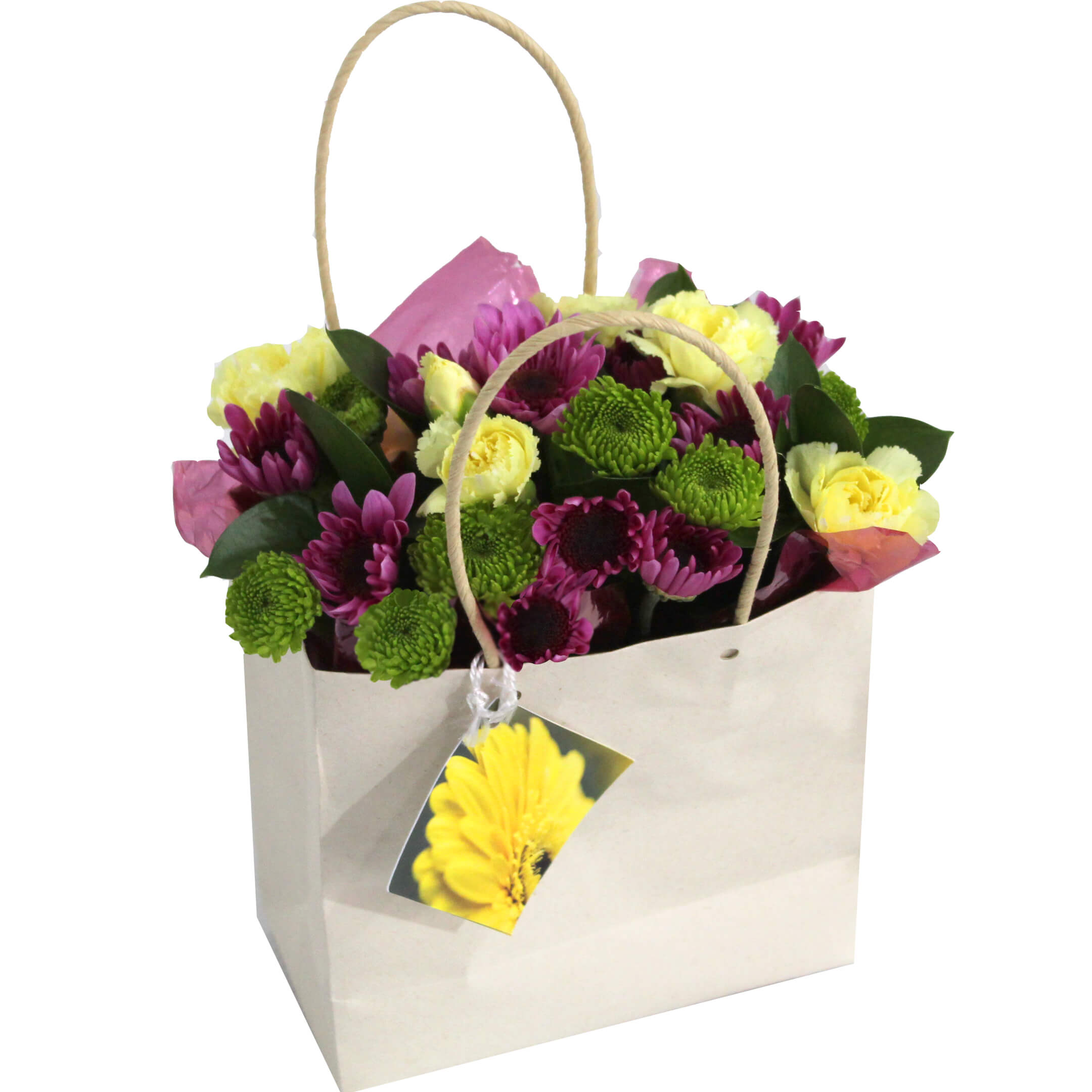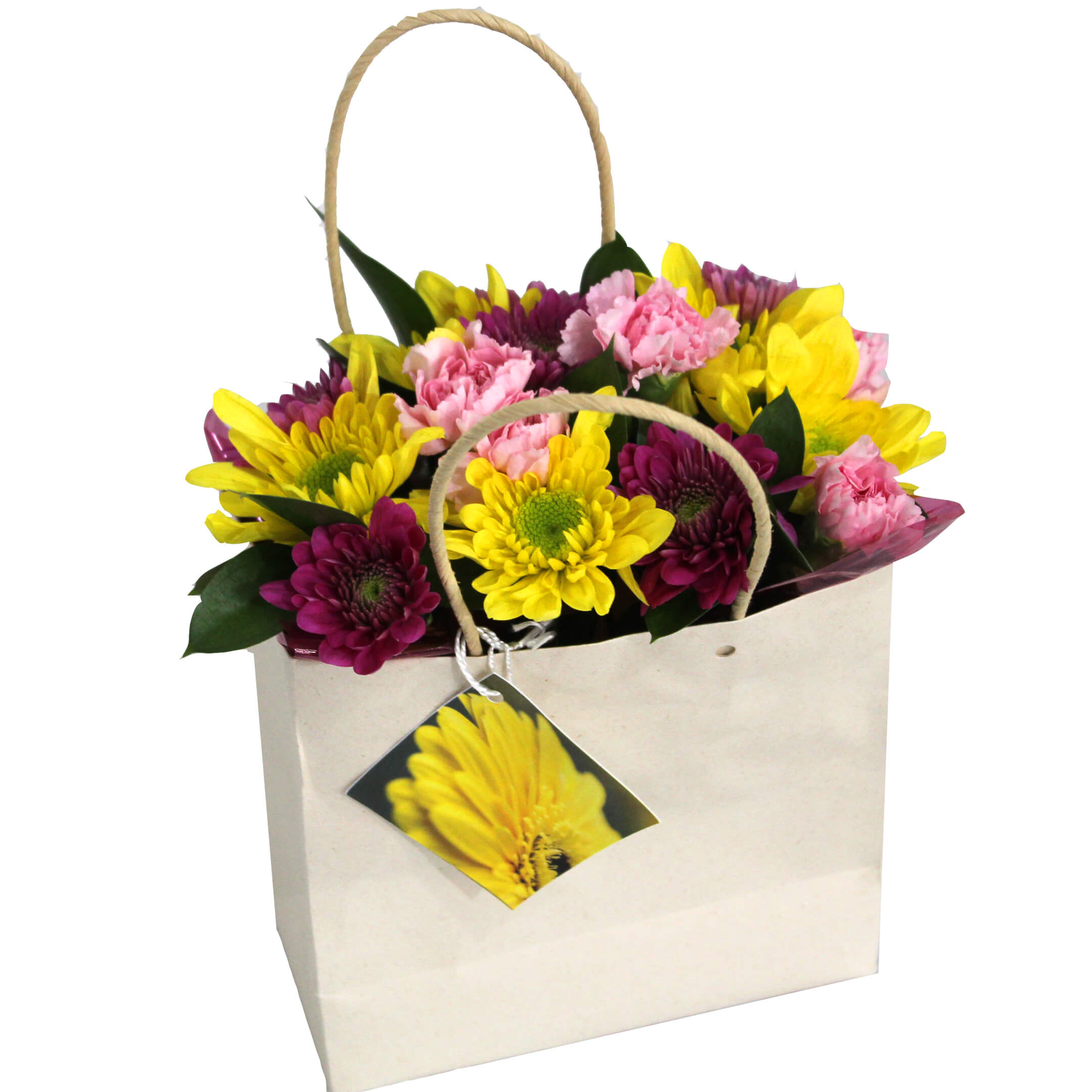 2 stems Micropoms/Novelty Poms, 1 Stem Button Poms, 3 Stems Mini Carnation, 2,5 Stems Ruscus, Paper Bag with Cellophane Decorations in a seasonal color, 1 special decorative card, liner.