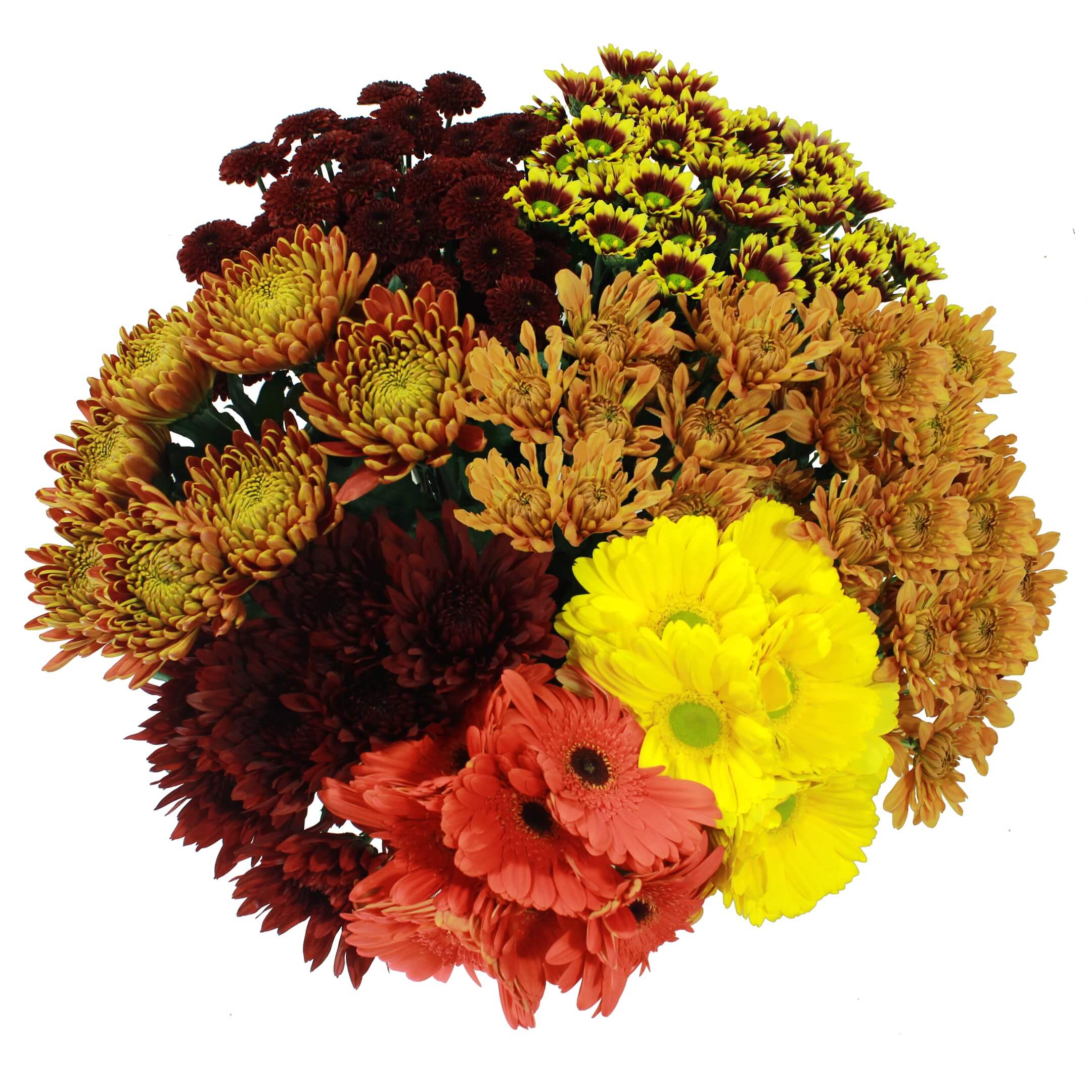 All Bunches 7 stems/Clear sleeve/Flower Food/UPC, 1 Bunch Cushion, 1 Bunch Daisy, 1 Bunch Novelty/Micropoms/Button Poms, 2 Bunch Disbud, 2 Bunches Gerberas.