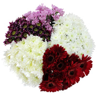 All Bunches 7 stems/Clear sleeve/Flower Food/UPC, 1 Bunch Cushion, 1 Bunch Daisy, 1 Bunch Novelty/Micropoms/Button Poms, 2 Bunch Disbud, 2 Bunches Gerberas.