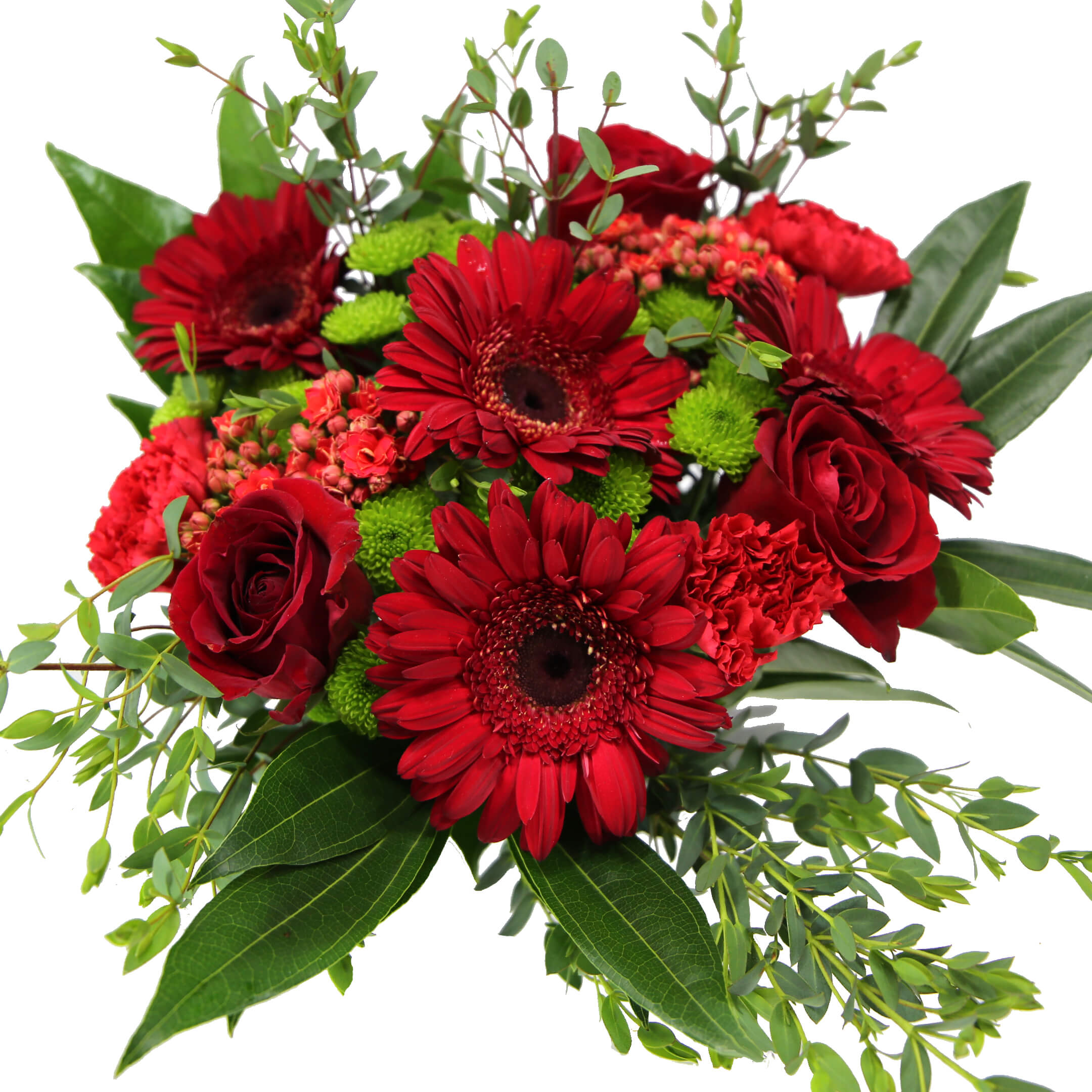 Beautiful mix of: 3 Roses, 4 Gerberas, 5 Spray Rose/Dianthus/Green Ball/Petite Sunflower/Hypericum/Eryngium/Kalanchoe(3), 5 Eucalyptus Silver Dollar/Boxwood/Baby Blue/Liligrass (5 tips)/Brillantina/Others, 3 Cocculus, 5 Novelty/Buttons/Micropoms, 3 Carnation/Mini Carnation/Alstroemeria, Clear Sleeve 21"+Flower Food+UPC