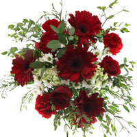 Beautiful mix of: 3 Roses, 4 Gerberas, 5 Spray Rose/Dianthus/Green Ball/Petite Sunflower/Hypericum/Eryngium/Kalanchoe(3), 5 Eucalyptus Silver Dollar/Boxwood/Baby Blue/Liligrass (5 tips)/Brillantina/Others, 3 Cocculus, 5 Novelty/Buttons/Micropoms, 3 Carnation/Mini Carnation/Alstroemeria, Clear Sleeve 21"+Flower Food+UPC