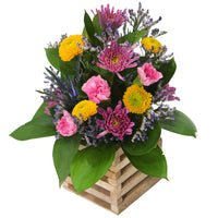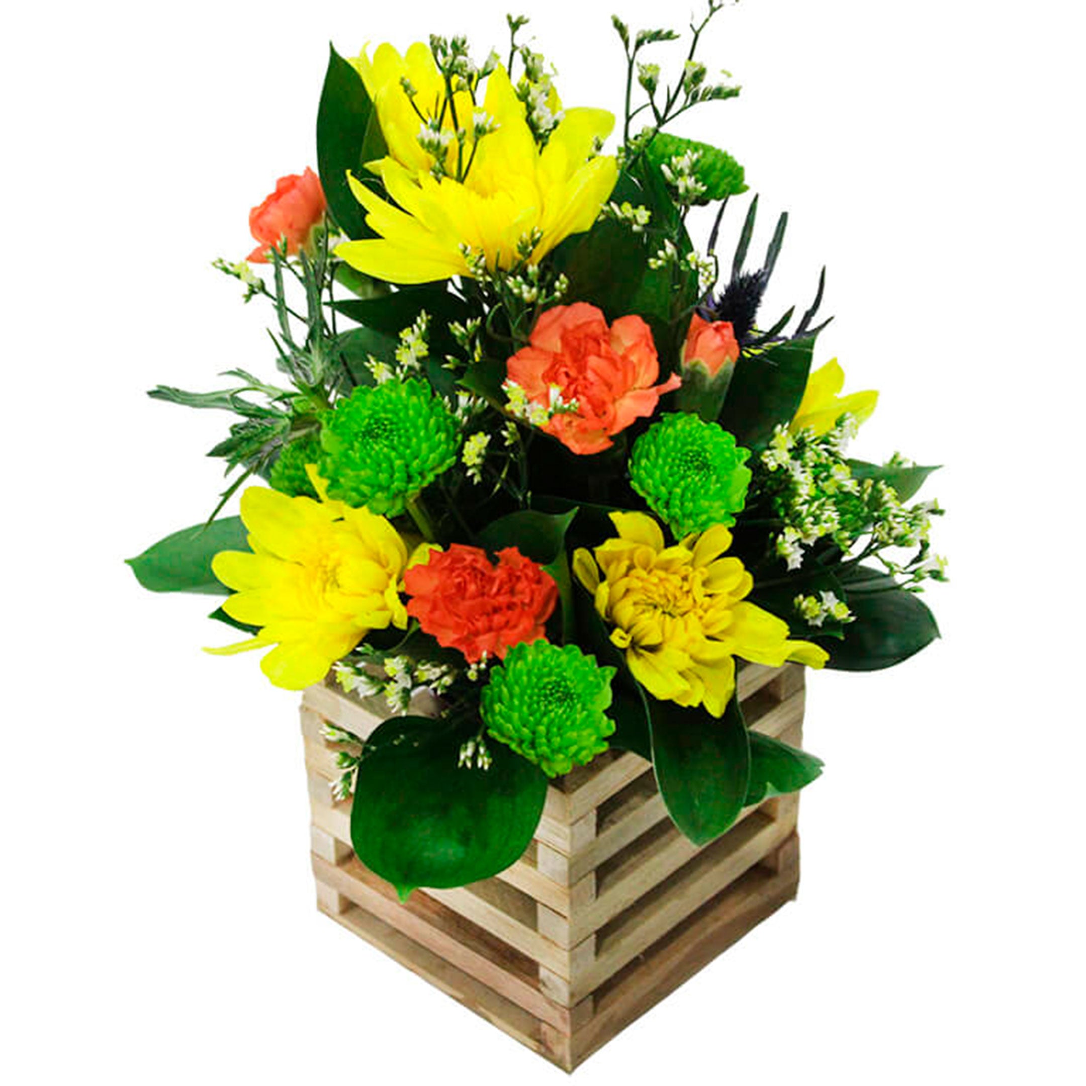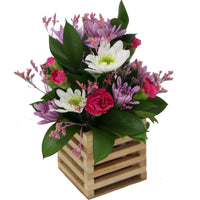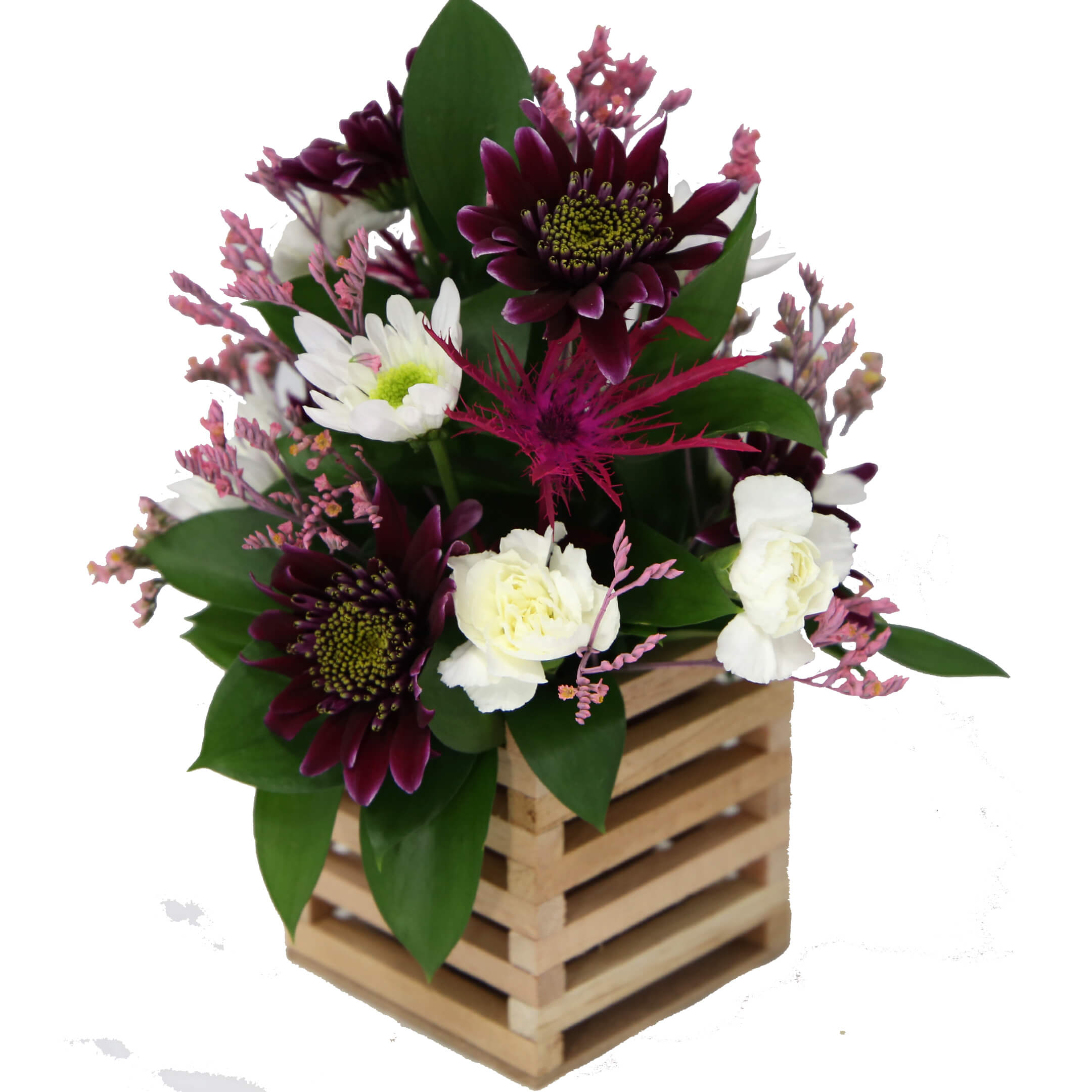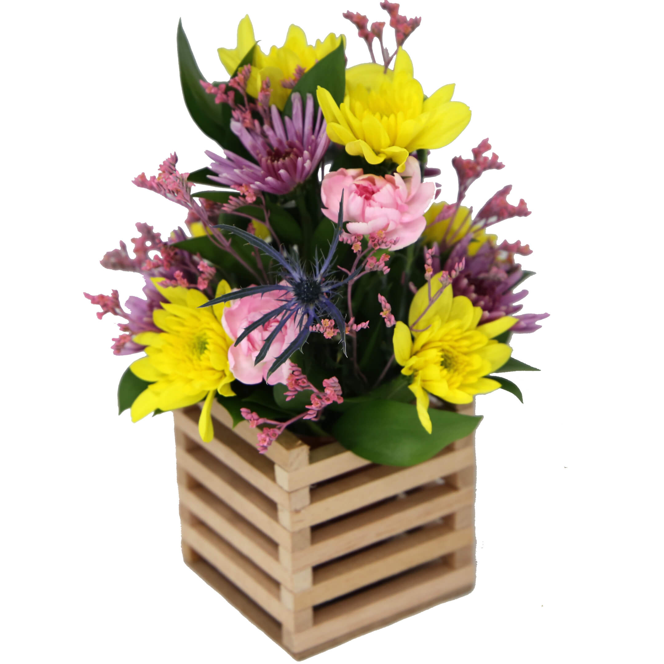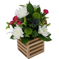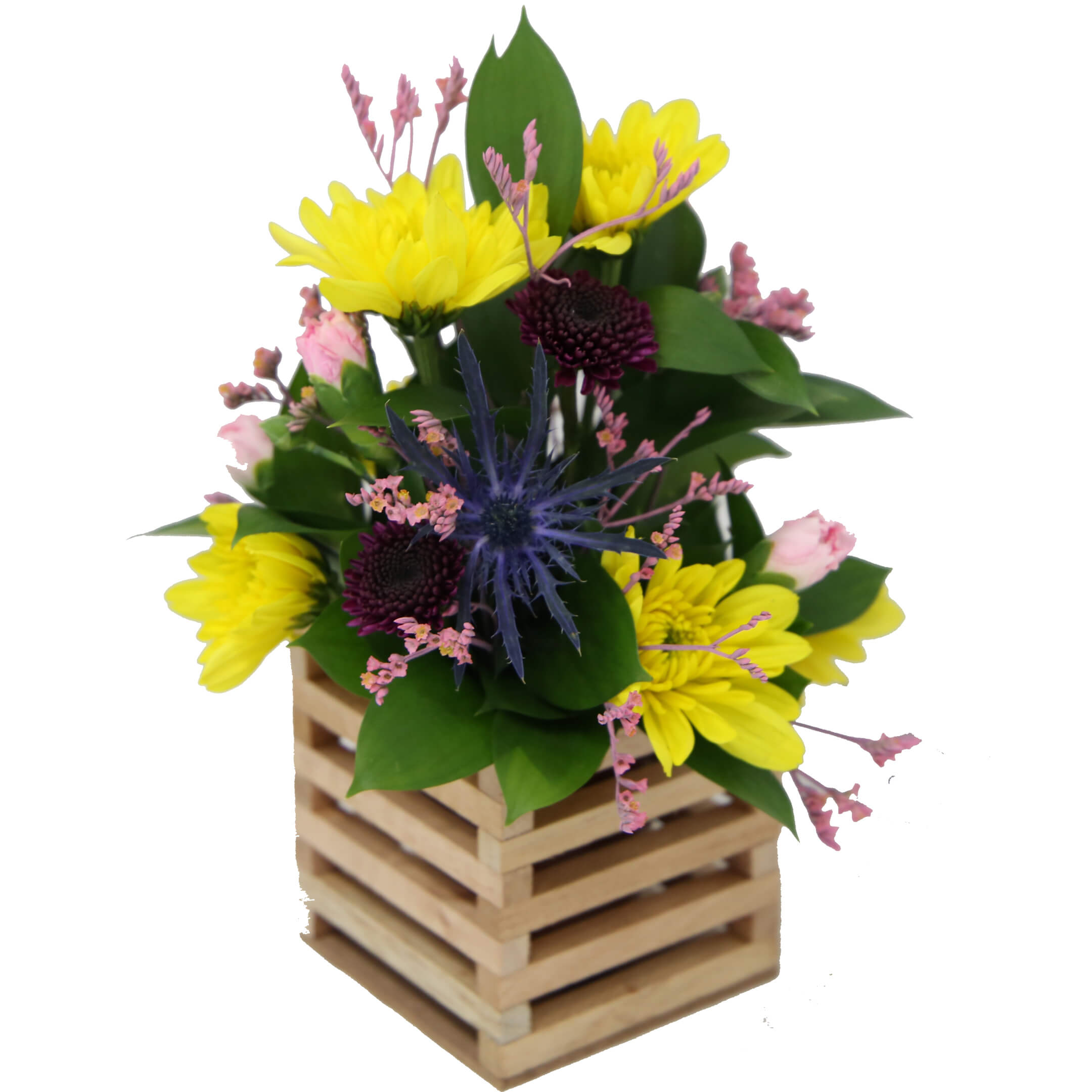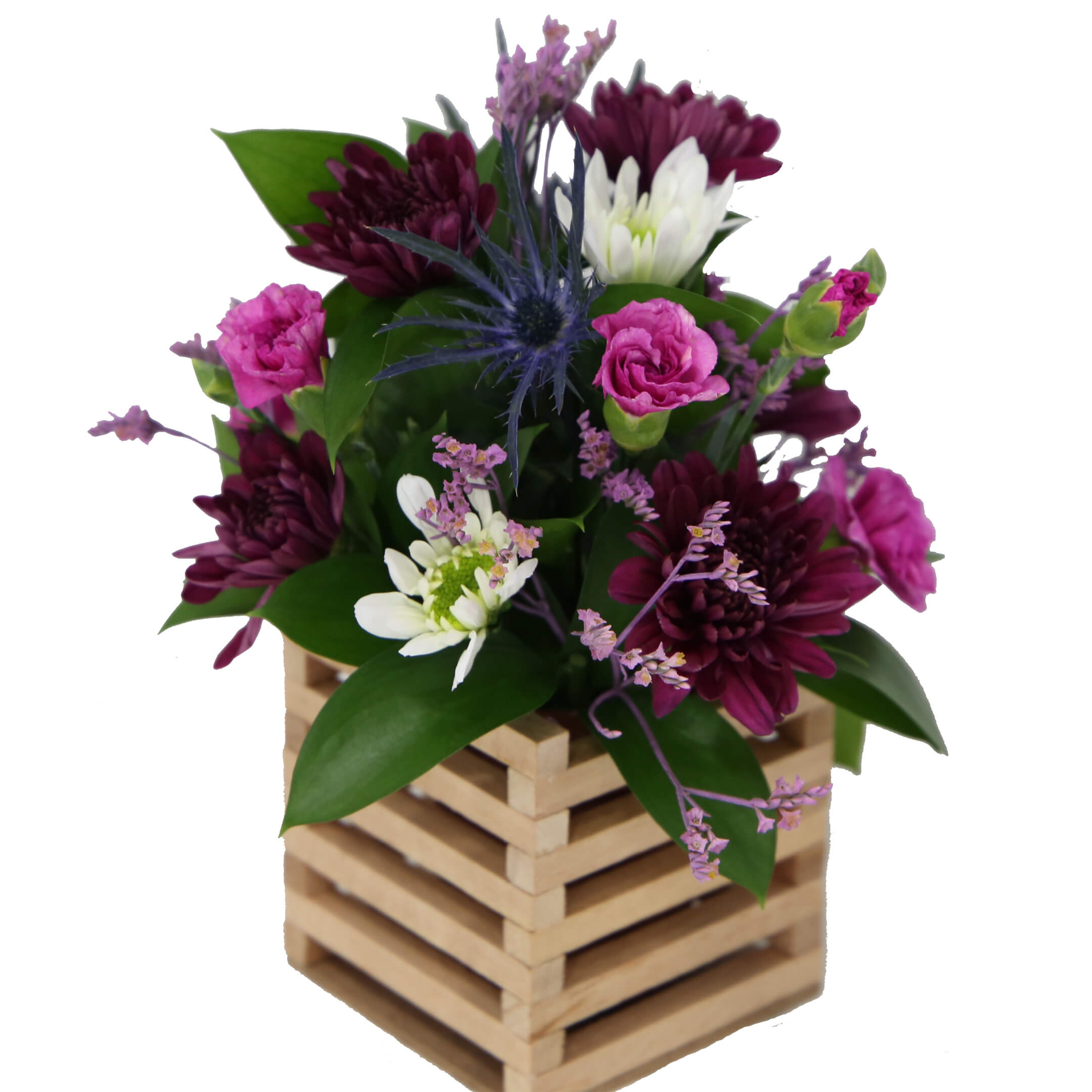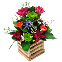 6 Laterals Cushion, 4 Laterals Novelty or Button Poms, 4 Laterals Mini Carnation, 2 Laterals Eryngium or Small Green Ball, 7 Laterals Limonium, 12 Laterals Ruscus, Vintage Wood Container.