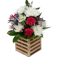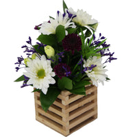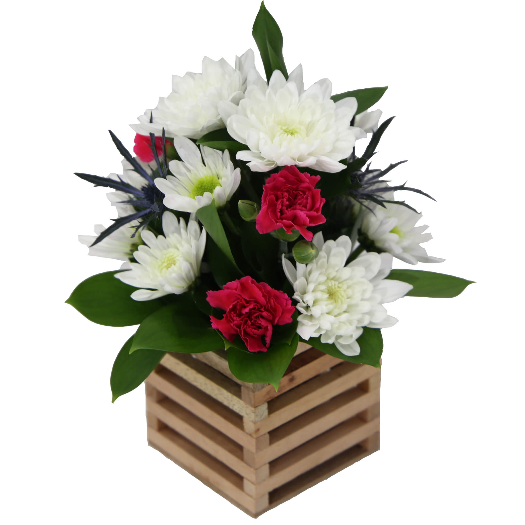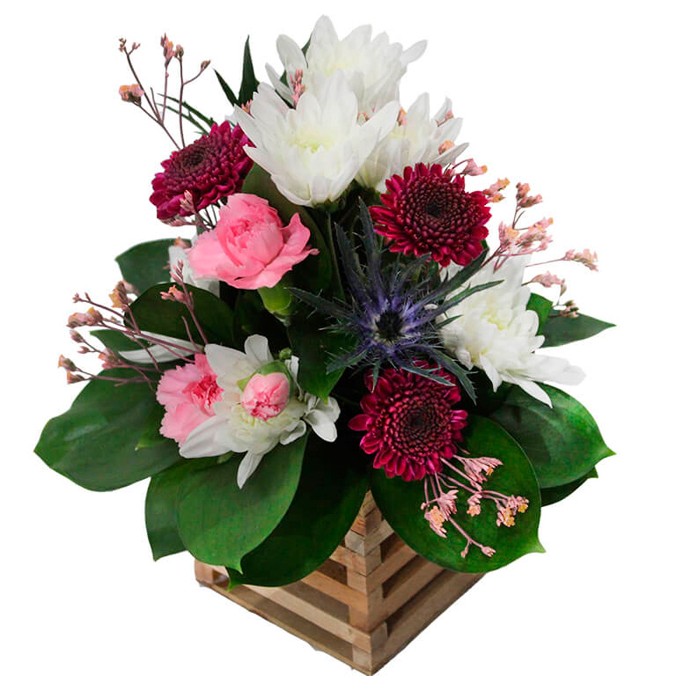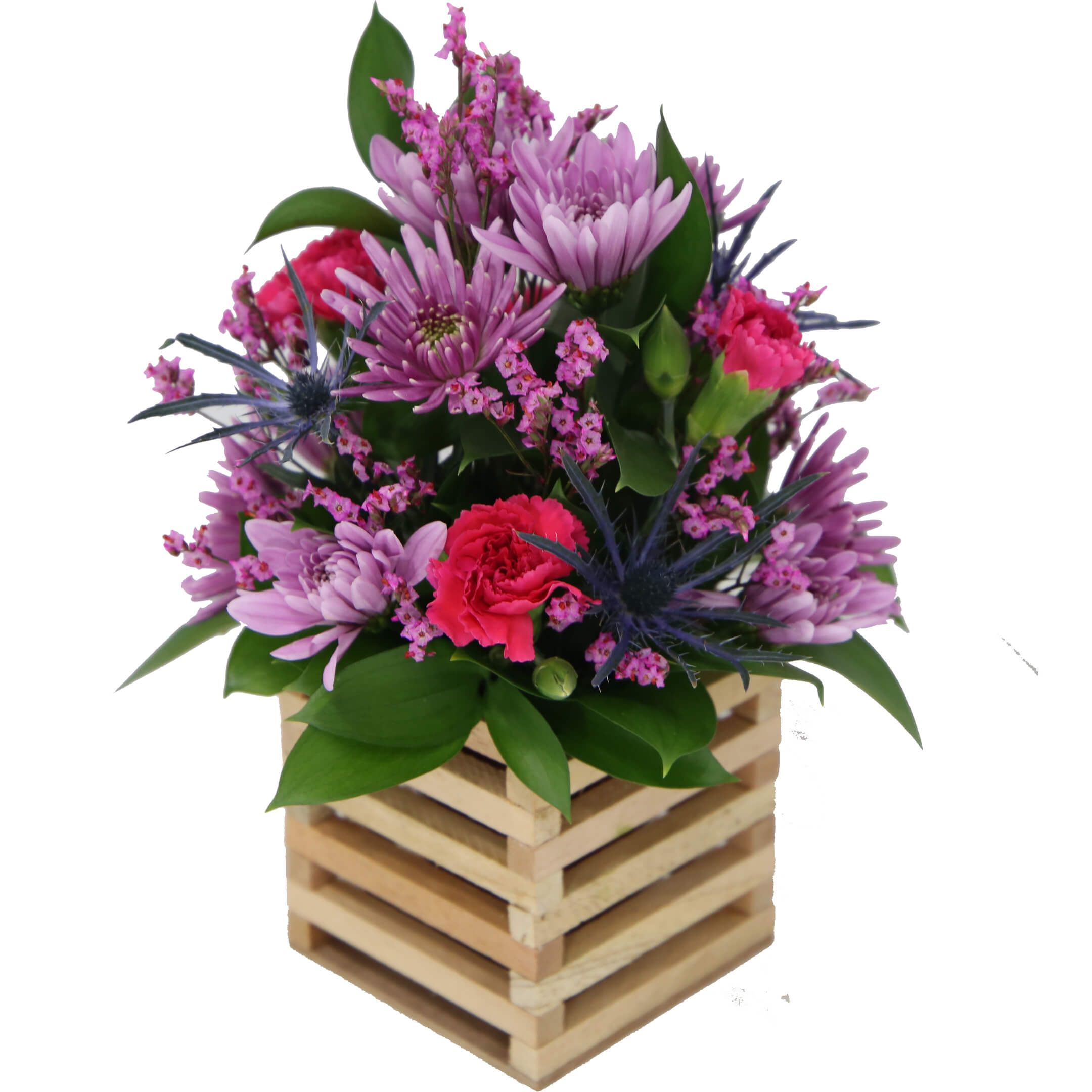 6 Laterals Cushion, 4 Laterals Novelty or Button Poms, 4 Laterals Mini Carnation, 2 Laterals Eryngium or Small Green Ball, 7 Laterals Limonium, 12 Laterals Ruscus, Vintage Wood Container.