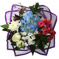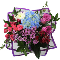 Beautiful mix of: 1 Kale/Hydrangea/Lilies, 2 Roses, 2 Spray Roses, 1 Disbud, 3 Micropoms/Button Poms, 2 Alstroemeria/Matsumoto, 2 Premium Green, 3 Ruscus, 2 Cocculus, Clear sleeve+Wrap+UPC+Flower Food