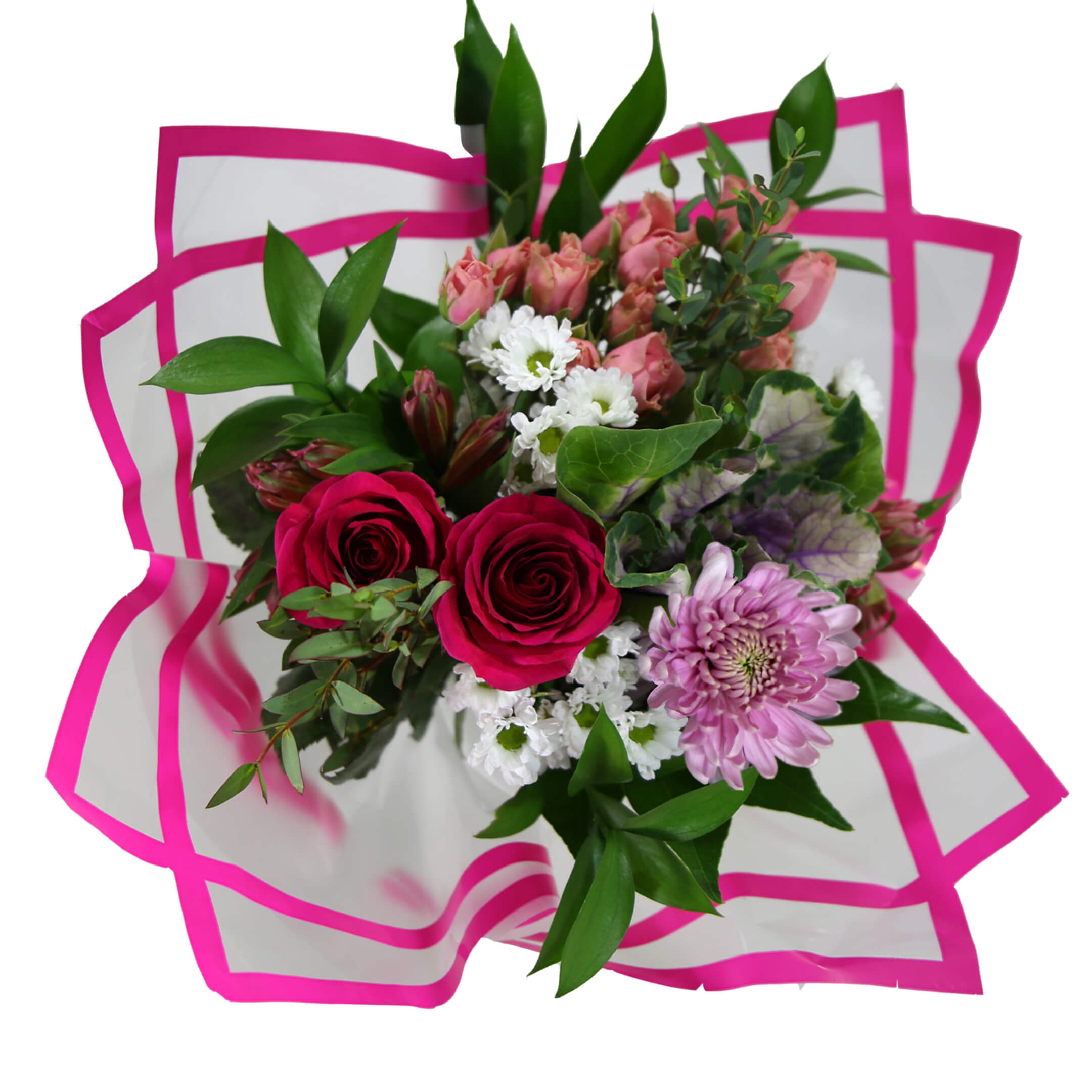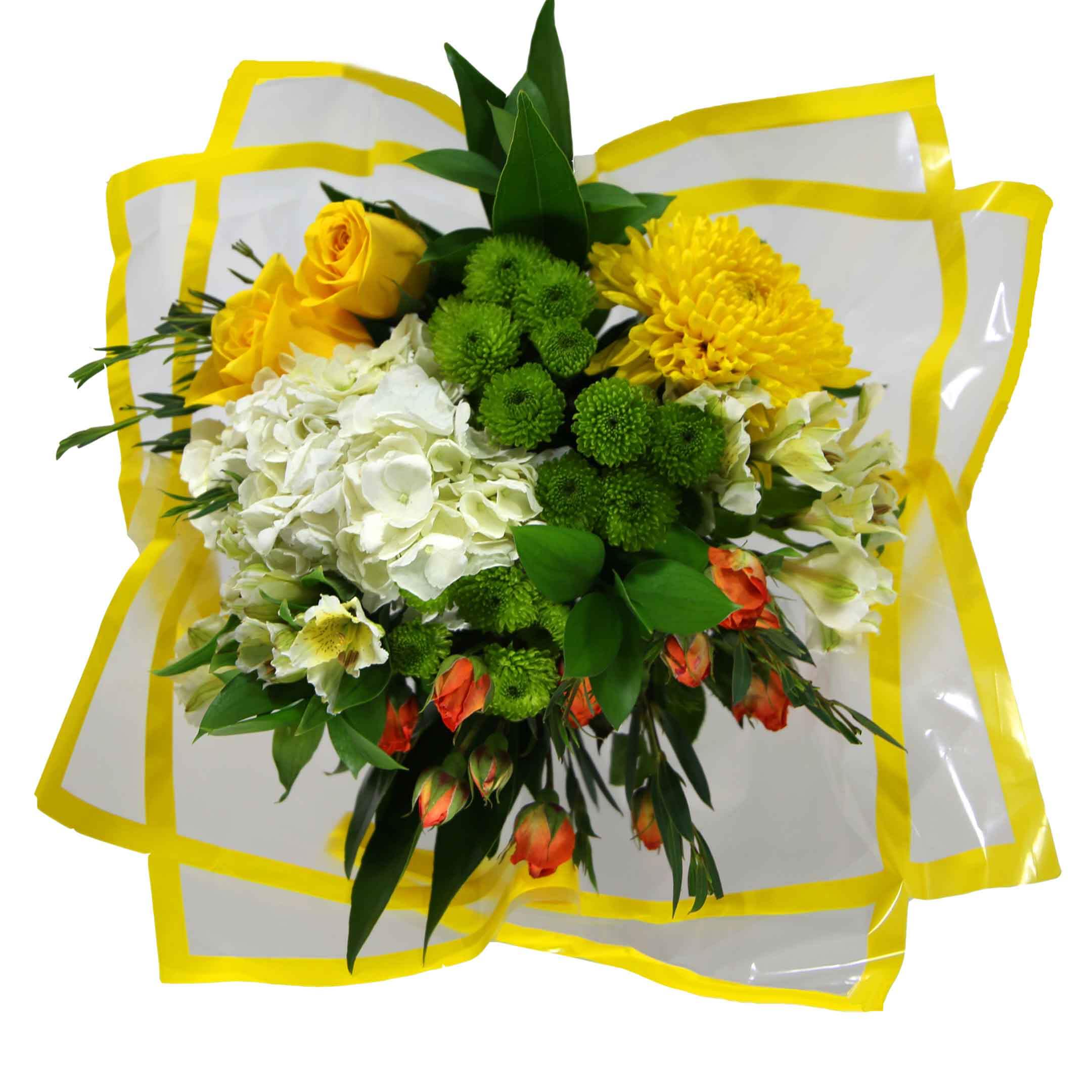 Beautiful mix of: 1 Kale/Hydrangea/Lilies, 2 Roses, 2 Spray Roses, 1 Disbud, 3 Micropoms/Button Poms, 2 Alstroemeria/Matsumoto, 2 Premium Green, 3 Ruscus, 2 Cocculus, Clear sleeve+Wrap+UPC+Flower Food