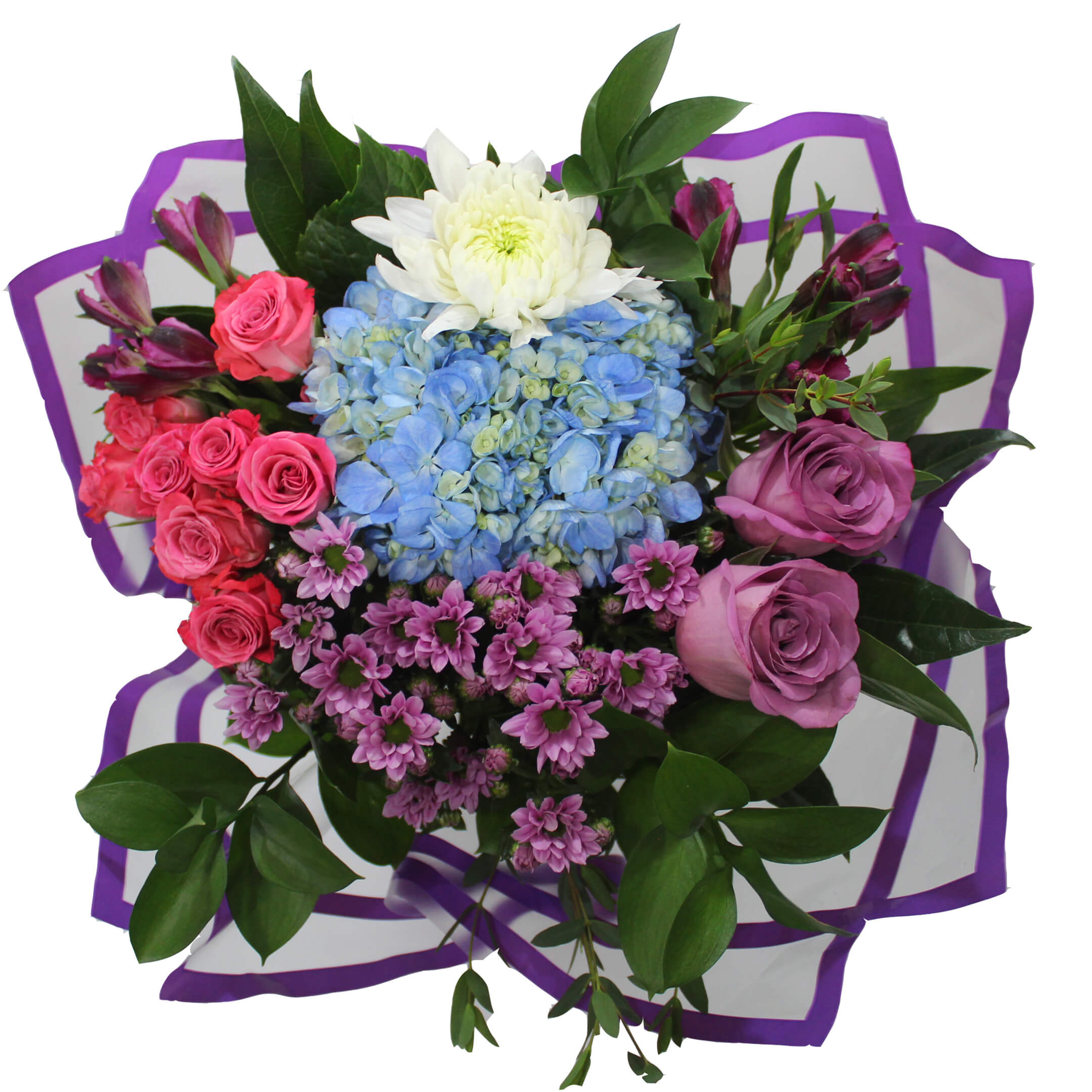 Beautiful mix of: 1 Kale/Hydrangea/Lilies, 2 Roses, 2 Spray Roses, 1 Disbud, 3 Micropoms/Button Poms, 2 Alstroemeria/Matsumoto, 2 Premium Green, 3 Ruscus, 2 Cocculus, Clear sleeve+Wrap+UPC+Flower Food