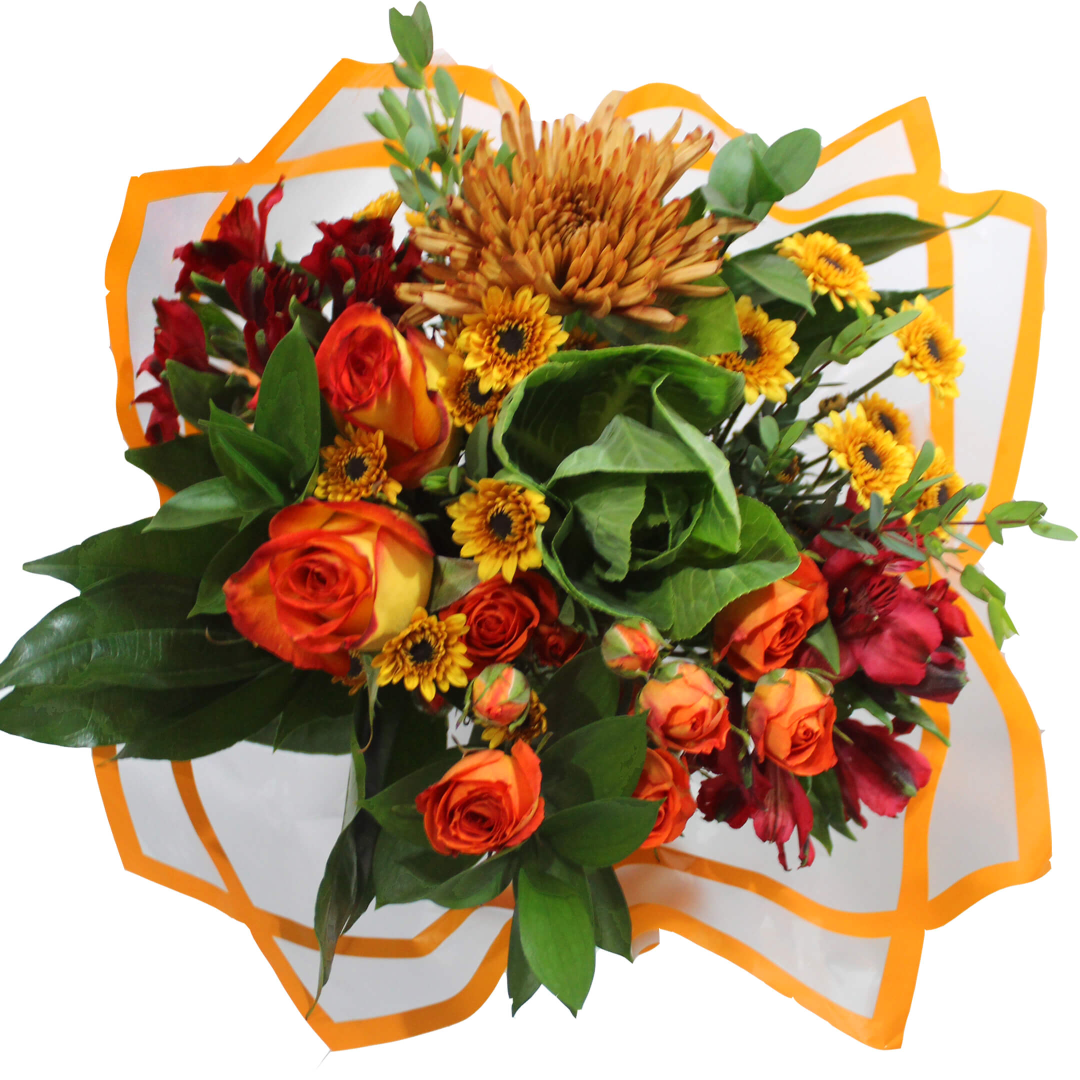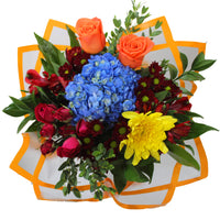 Beautiful mix of: 1 Kale/Hydrangea/Lilies, 2 Roses, 2 Spray Roses, 1 Disbud, 3 Micropoms/Button Poms, 2 Alstroemeria/Matsumoto, 2 Premium Green, 3 Ruscus, 2 Cocculus, Clear sleeve+Wrap+UPC+Flower Food