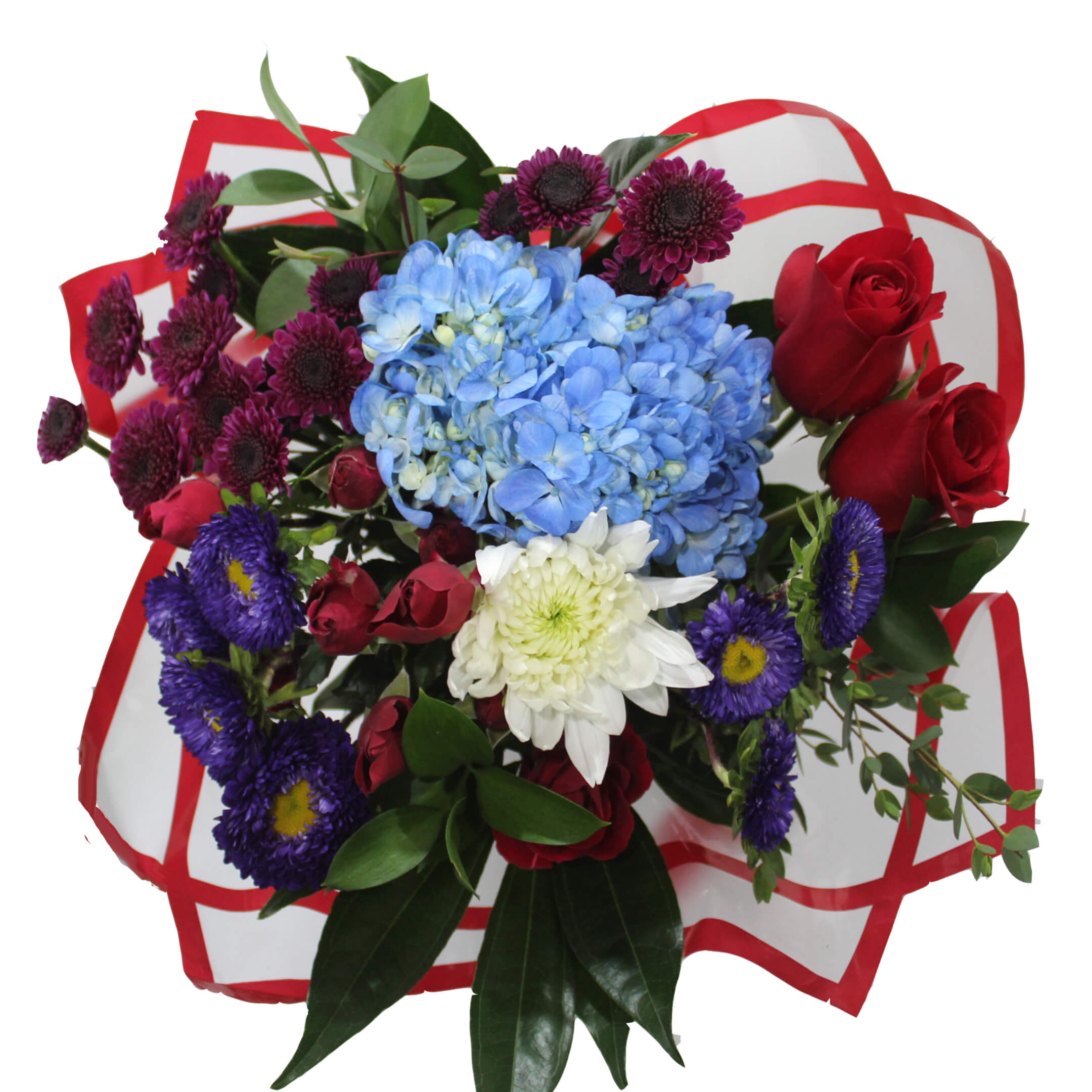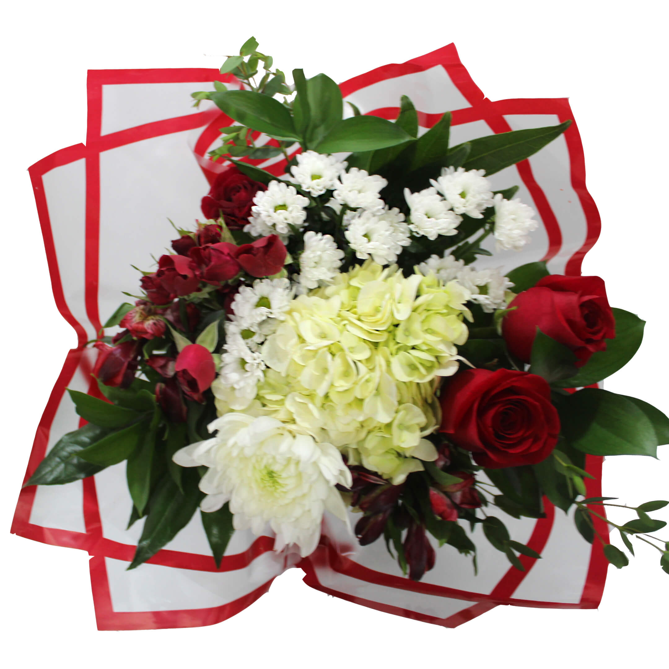 Beautiful mix of: 1 Kale/Hydrangea/Lilies, 2 Roses, 2 Spray Roses, 1 Disbud, 3 Micropoms/Button Poms, 2 Alstroemeria/Matsumoto, 2 Premium Green, 3 Ruscus, 2 Cocculus, Clear sleeve+Wrap+UPC+Flower Food