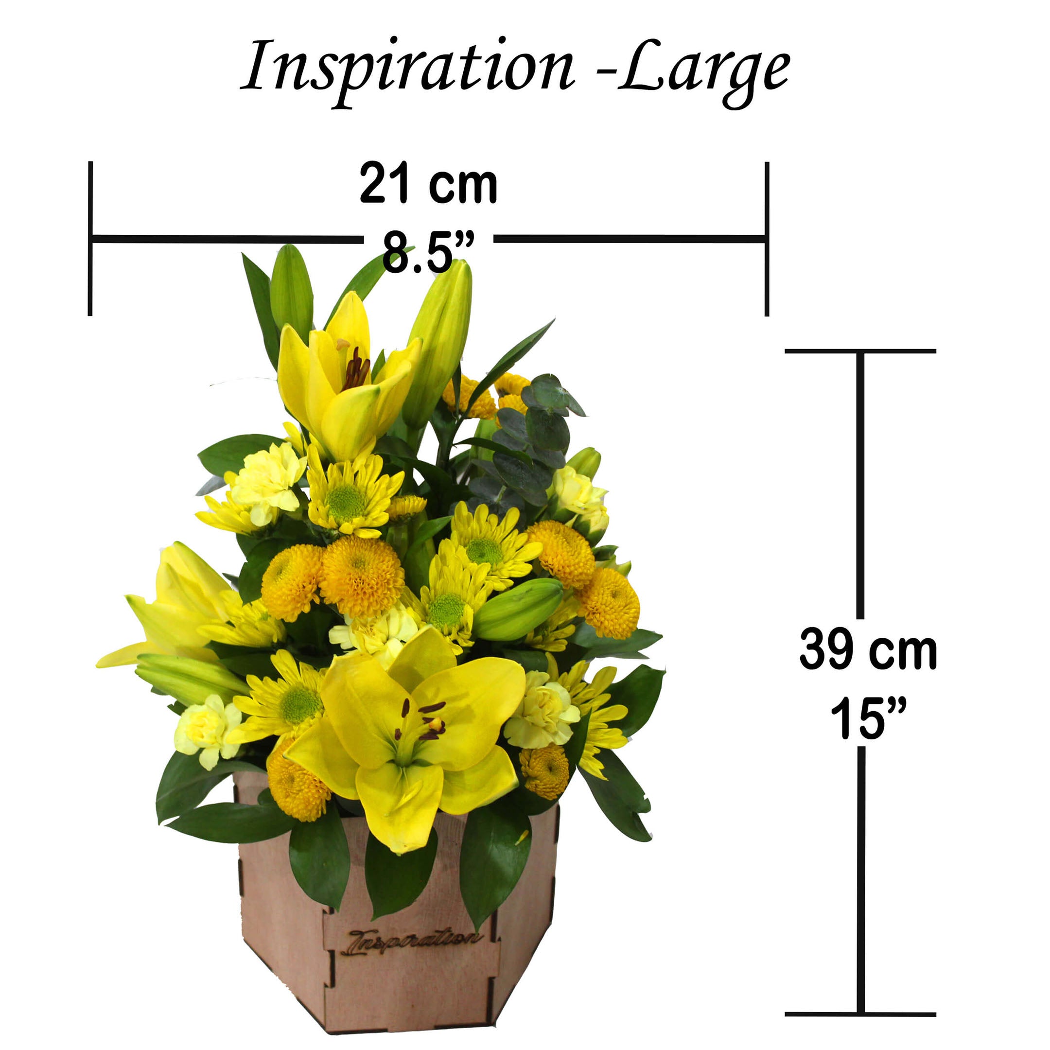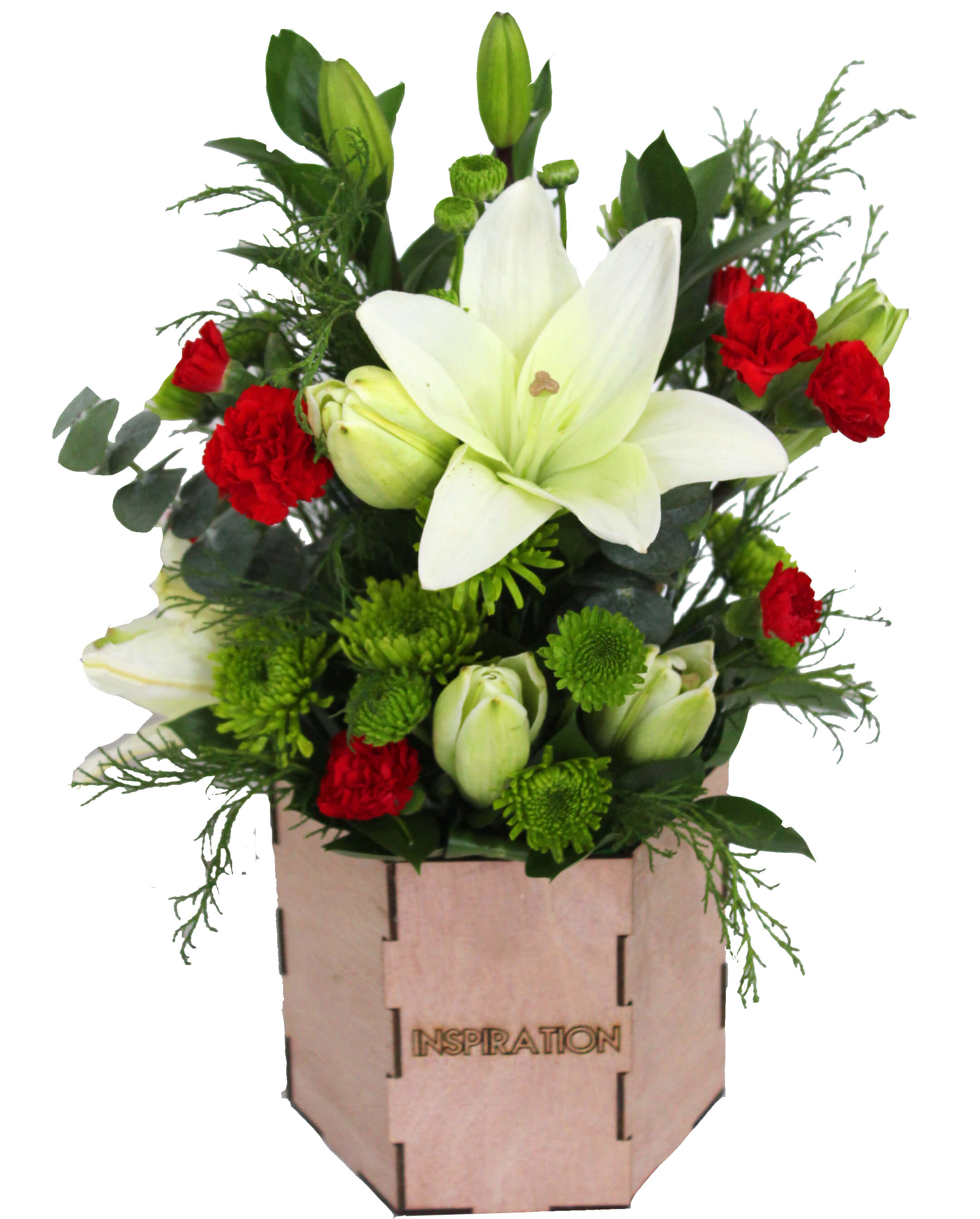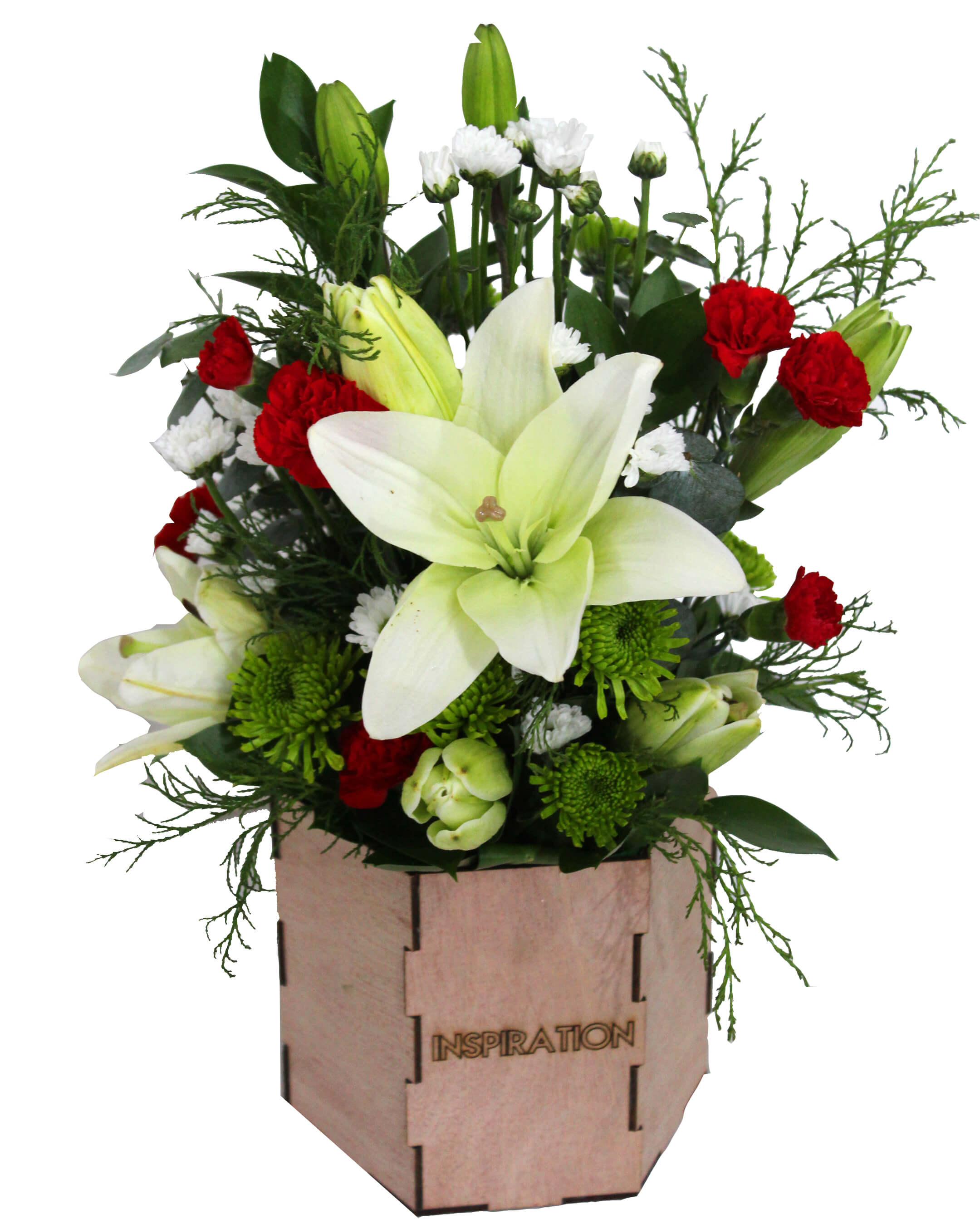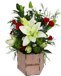 2 Star gazer/Oriental Lily/3 Asiatic Lily, 10 Laterals Novelty Poms, 10 Laterals Button Poms, 12 Laterals Mini Carnation or 3 stems Carnation, 20 Laterals Ruscus, 8 parts of Baby Blue Eucalyptus or other small green for texture, Special Design Wood Container with Liner.