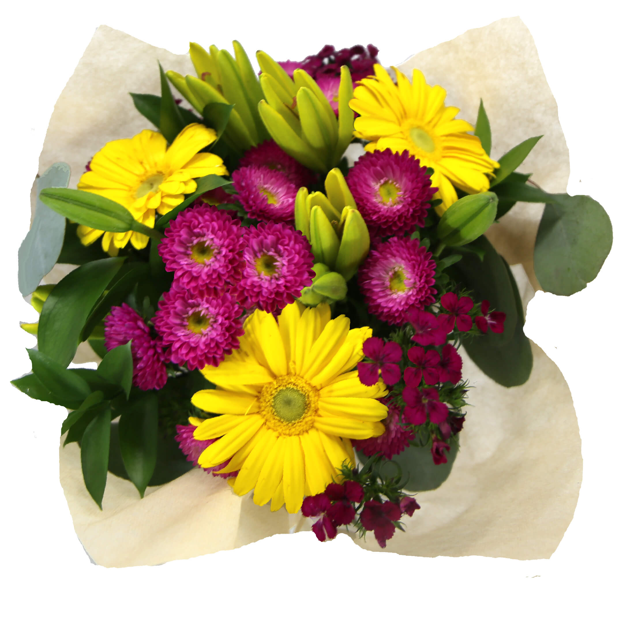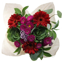 Beautiful mix of: 3 Gerberas, 2 Lilies/Hydrangeas, 4 Matsumoto/Statice/Hypericum/Eryngium,4 Ruscus, 2 Eucalyptus, 2 Dianthus/Rafines/Spray Rose/Green Ball, Clear sleeve+Wrap+Flower food+UPC