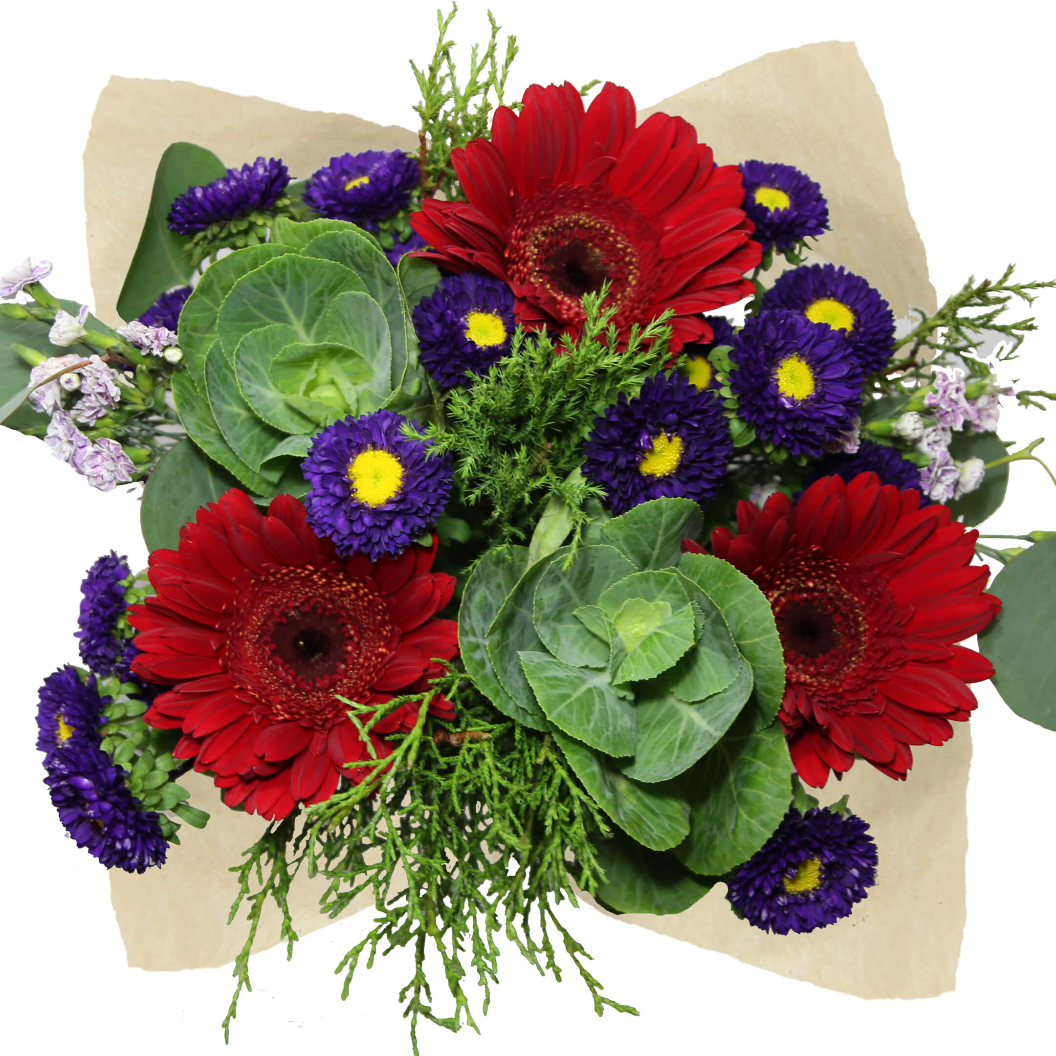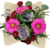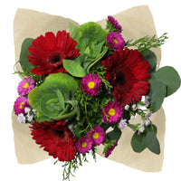 Beautiful mix of: 3 Gerberas, 2 Lilies/Hydrangeas, 4 Matsumoto/Statice/Hypericum/Eryngium,4 Ruscus, 2 Eucalyptus, 2 Dianthus/Rafines/Spray Rose/Green Ball, Clear sleeve+Wrap+Flower food+UPC