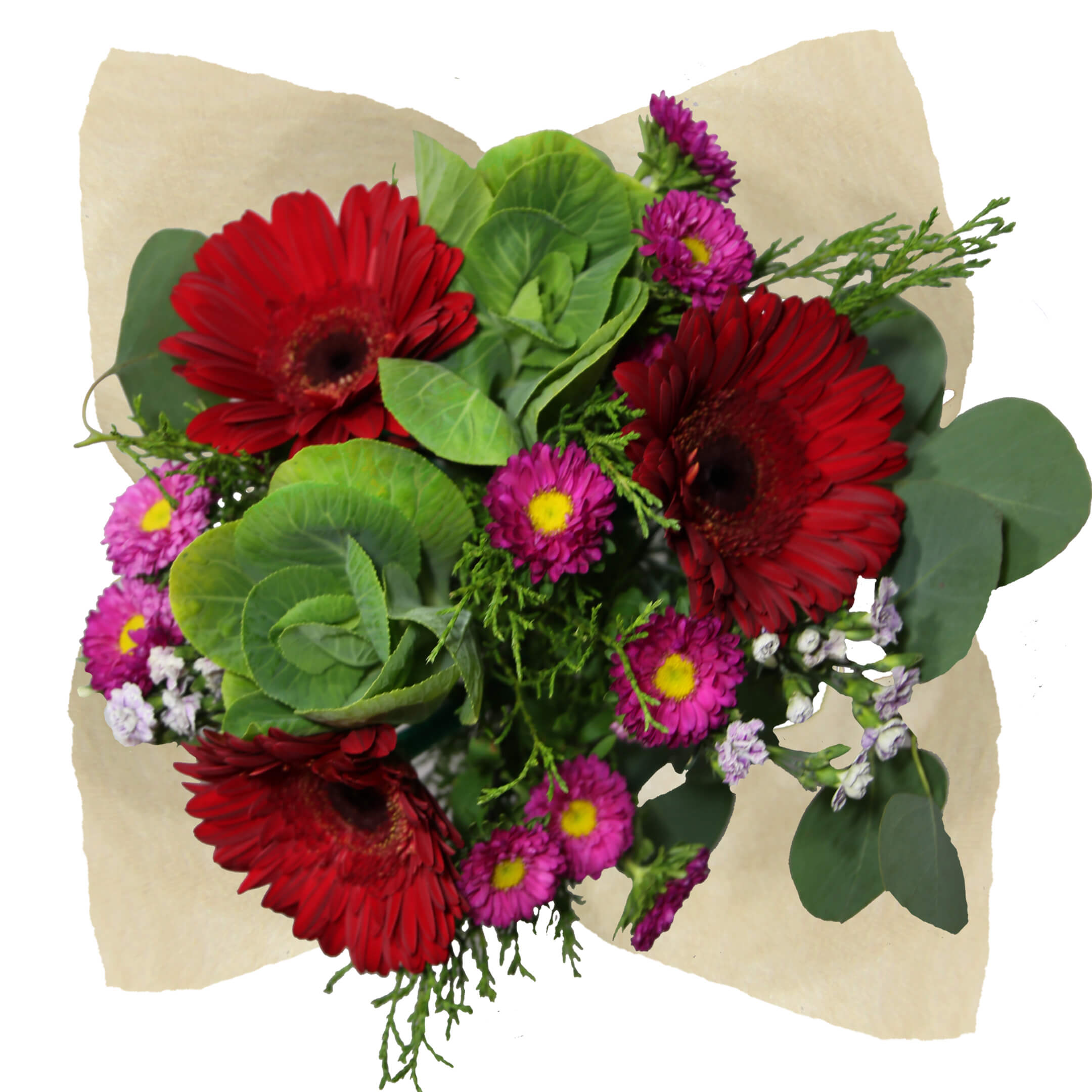 Beautiful mix of: 3 Gerberas, 2 Lilies/Hydrangeas, 4 Matsumoto/Statice/Hypericum/Eryngium,4 Ruscus, 2 Eucalyptus, 2 Dianthus/Rafines/Spray Rose/Green Ball, Clear sleeve+Wrap+Flower food+UPC