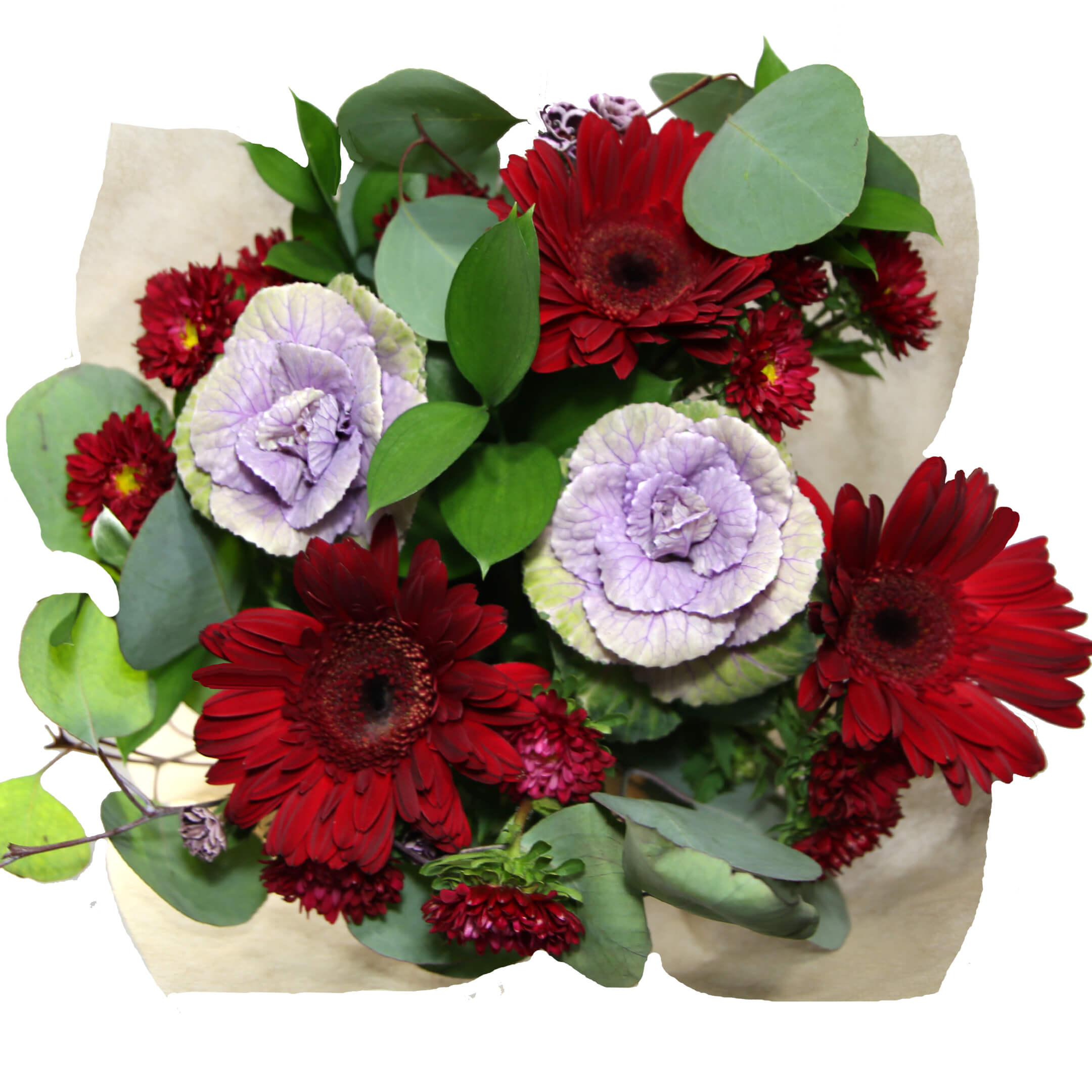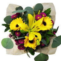 Beautiful mix of: 3 Gerberas, 2 Lilies/Hydrangeas, 4 Matsumoto/Statice/Hypericum/Eryngium,4 Ruscus, 2 Eucalyptus, 2 Dianthus/Rafines/Spray Rose/Green Ball, Clear sleeve+Wrap+Flower food+UPC