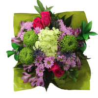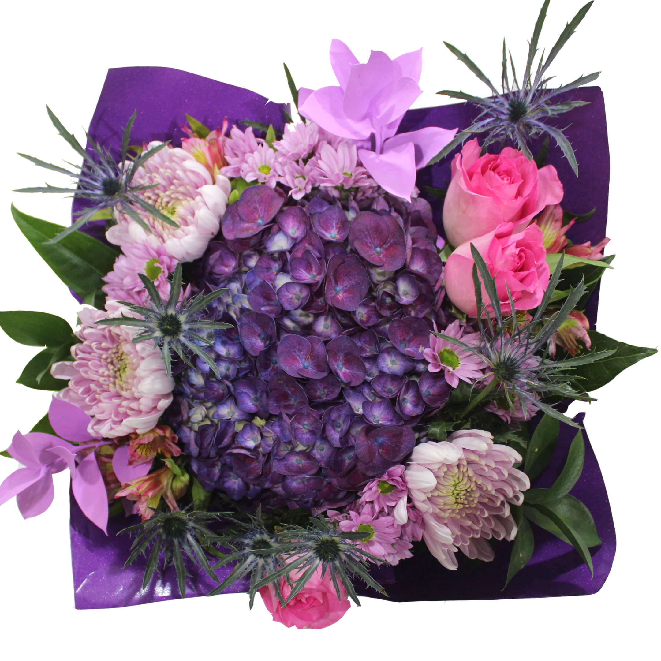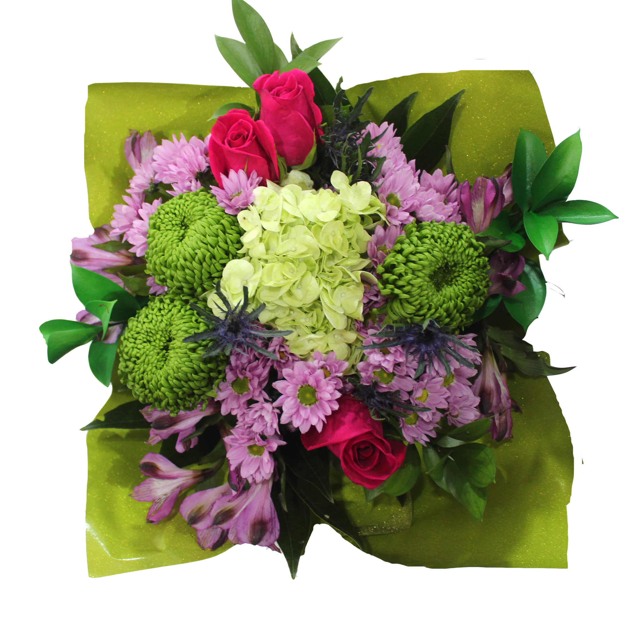 Beautiful mix of: 1 Special Hydrangea, 3 Roses, 3 Alstroemeria, 2 Eryngium, 2 Ruscus, 2 Cocculus, 2 Painted Ruscus, 4 Novelty/Micropoms, 3 Disbuds, Wrap+Clear sleeve+UPC+Flower Food