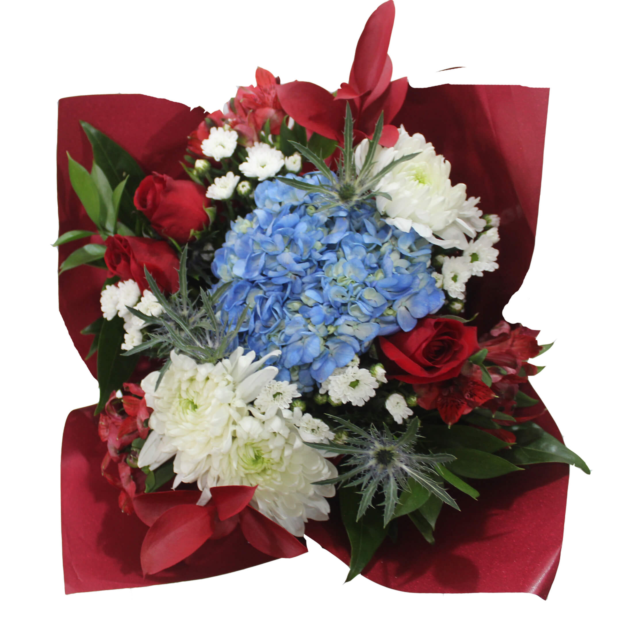Beautiful mix of: 1 Special Hydrangea, 3 Roses, 3 Alstroemeria, 2 Eryngium, 2 Ruscus, 2 Cocculus, 2 Painted Ruscus, 4 Novelty/Micropoms, 3 Disbuds, Wrap+Clear sleeve+UPC+Flower Food