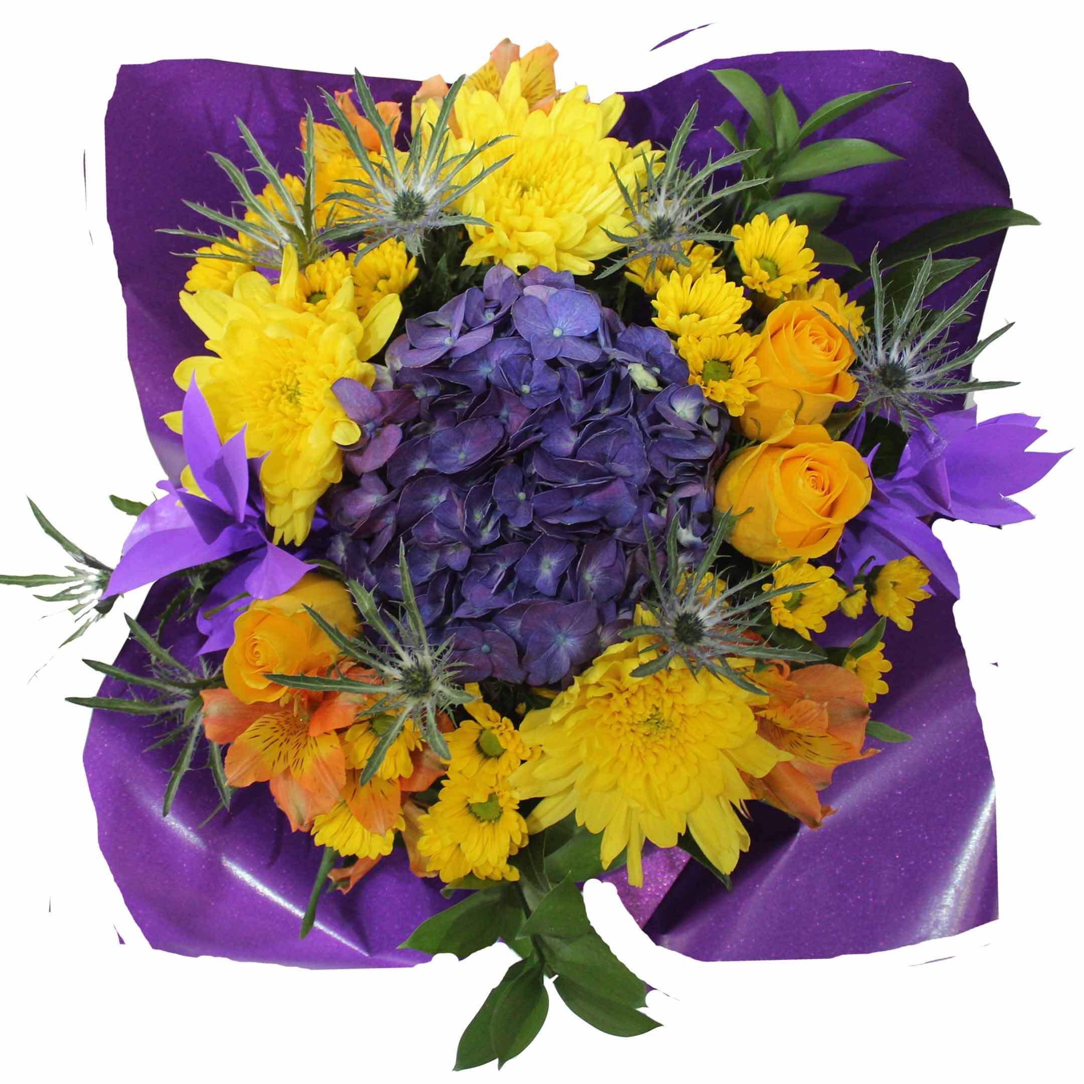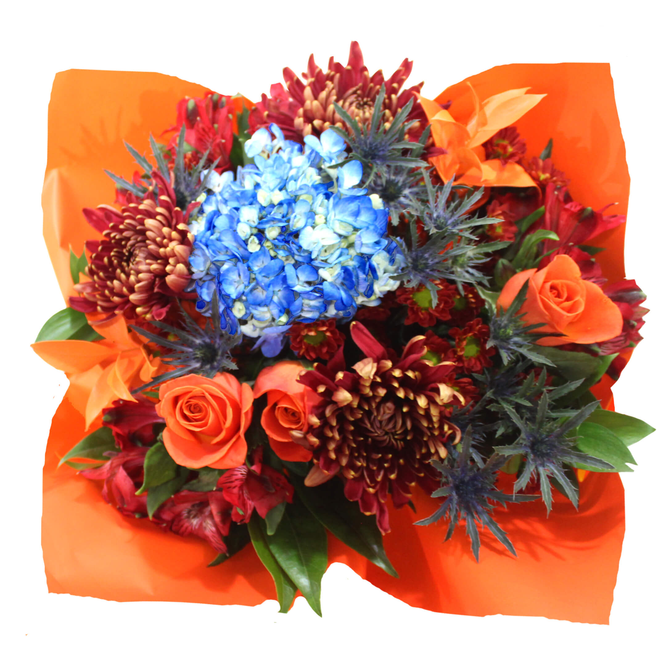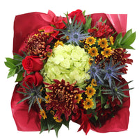 Beautiful mix of: 1 Special Hydrangea, 3 Roses, 3 Alstroemeria, 2 Eryngium, 2 Ruscus, 2 Cocculus, 2 Painted Ruscus, 4 Novelty/Micropoms, 3 Disbuds, Wrap+Clear sleeve+UPC+Flower Food