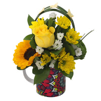 1 Mini Hydrangea/Green Ball/Sunflower/Dianthus, 1 Roses/Spray Rose, 1 Disbud/Spider, 7 Laterals Novelties/Daisies, 12 Laterals Novelties/Micro Poms/Buttons, 9 Laterals Ruscus, 5 Laterals Brillantina/Pittosporum, 1 Lily Grass (3 tips) & 3 Butterfly Touch, Ceramic Mug (Original design).