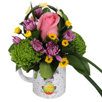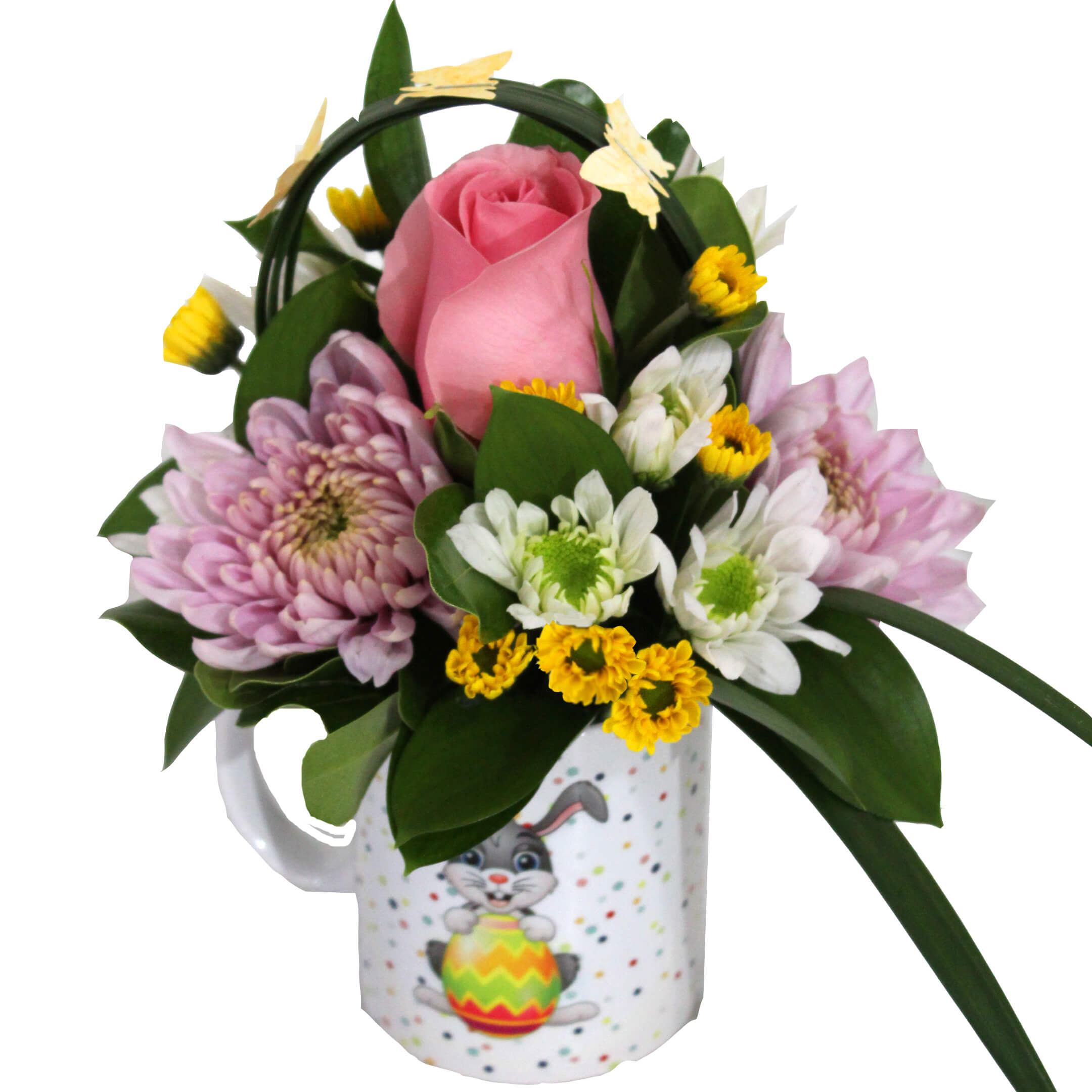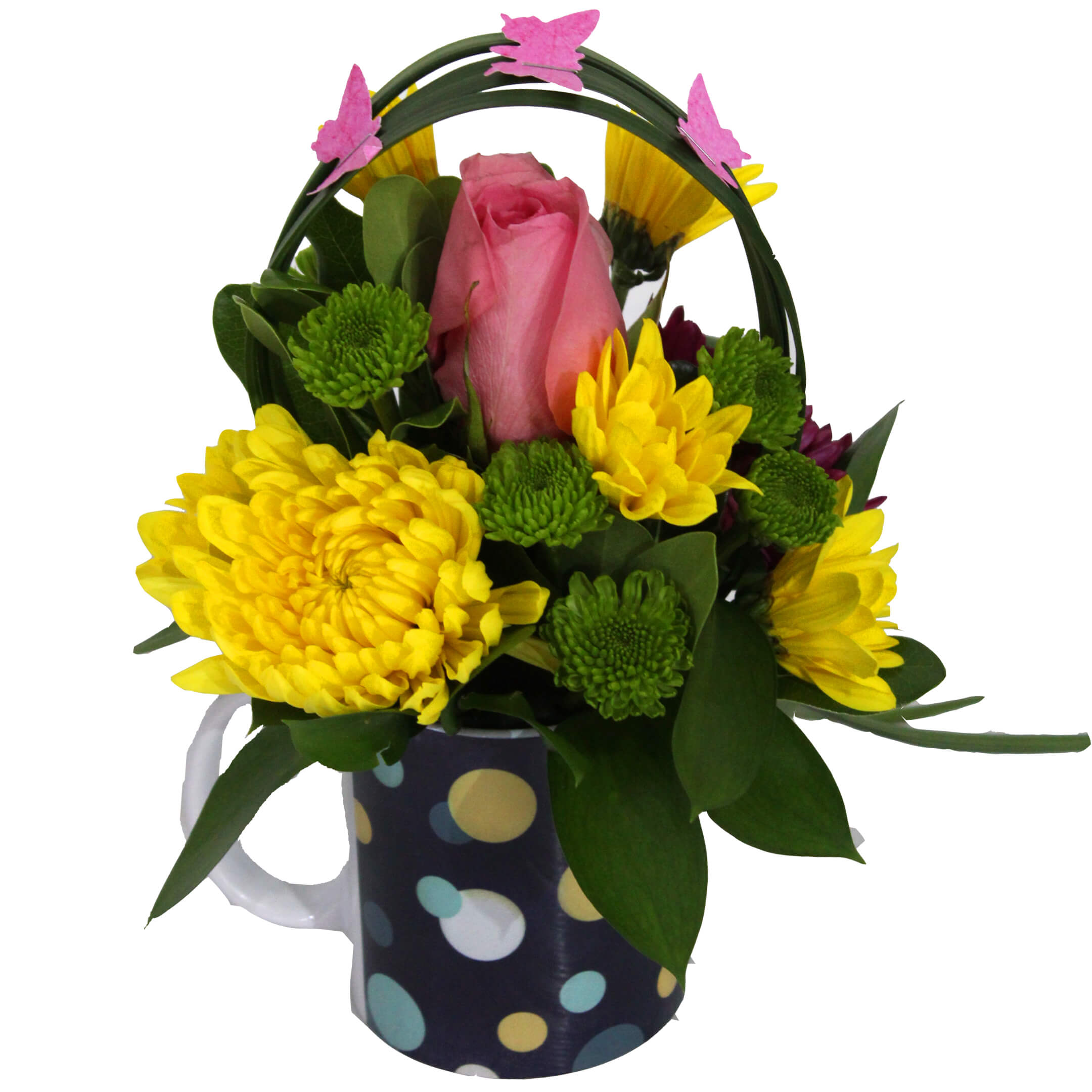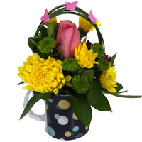 1 Mini Hydrangea/Green Ball/Sunflower/Dianthus, 1 Roses/Spray Rose, 1 Disbud/Spider, 7 Laterals Novelties/Daisies, 12 Laterals Novelties/Micro Poms/Buttons, 9 Laterals Ruscus, 5 Laterals Brillantina/Pittosporum, 1 Lily Grass (3 tips) & 3 Butterfly Touch, Ceramic Mug (Original design).