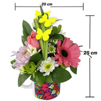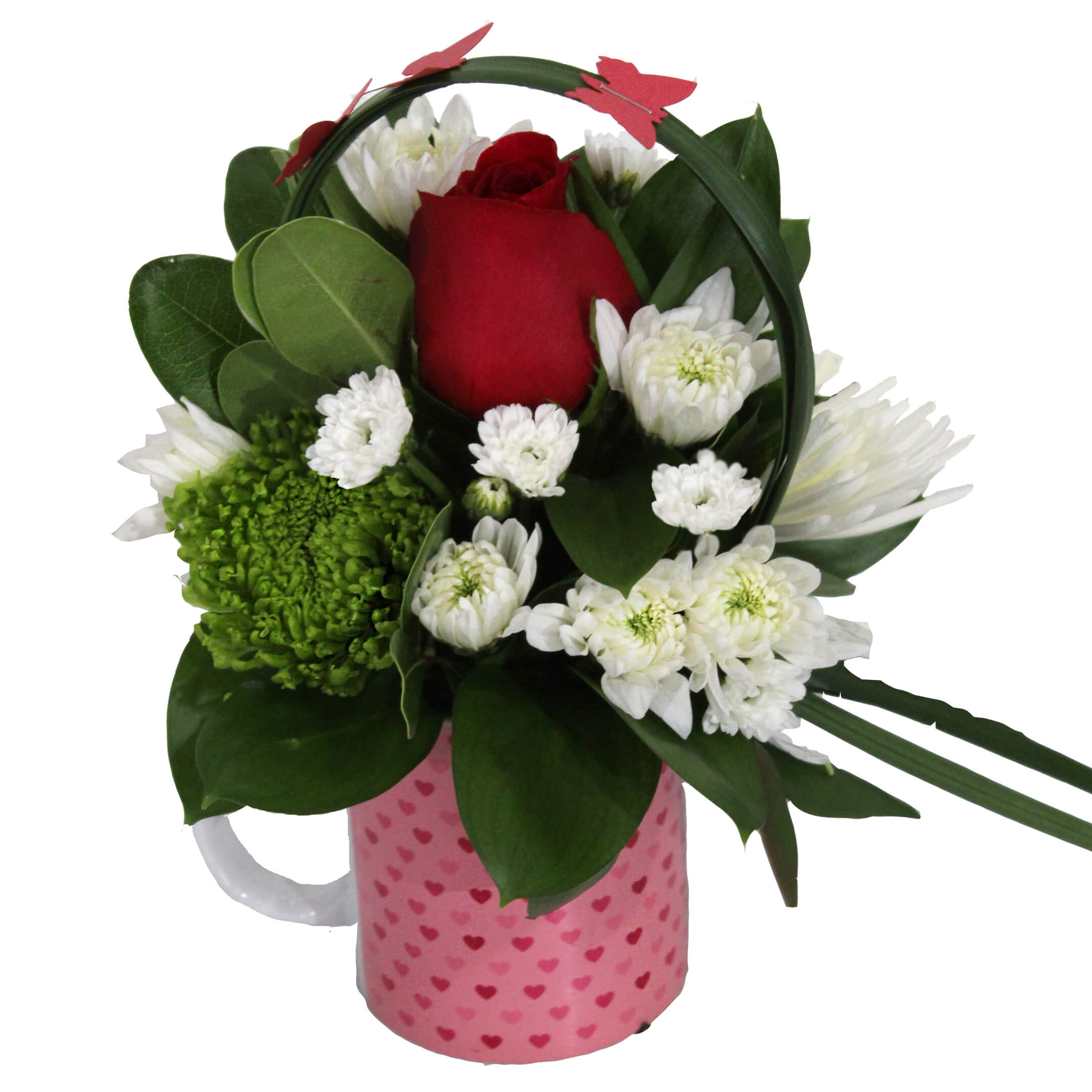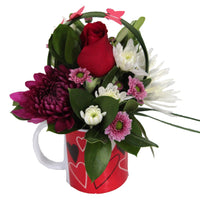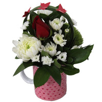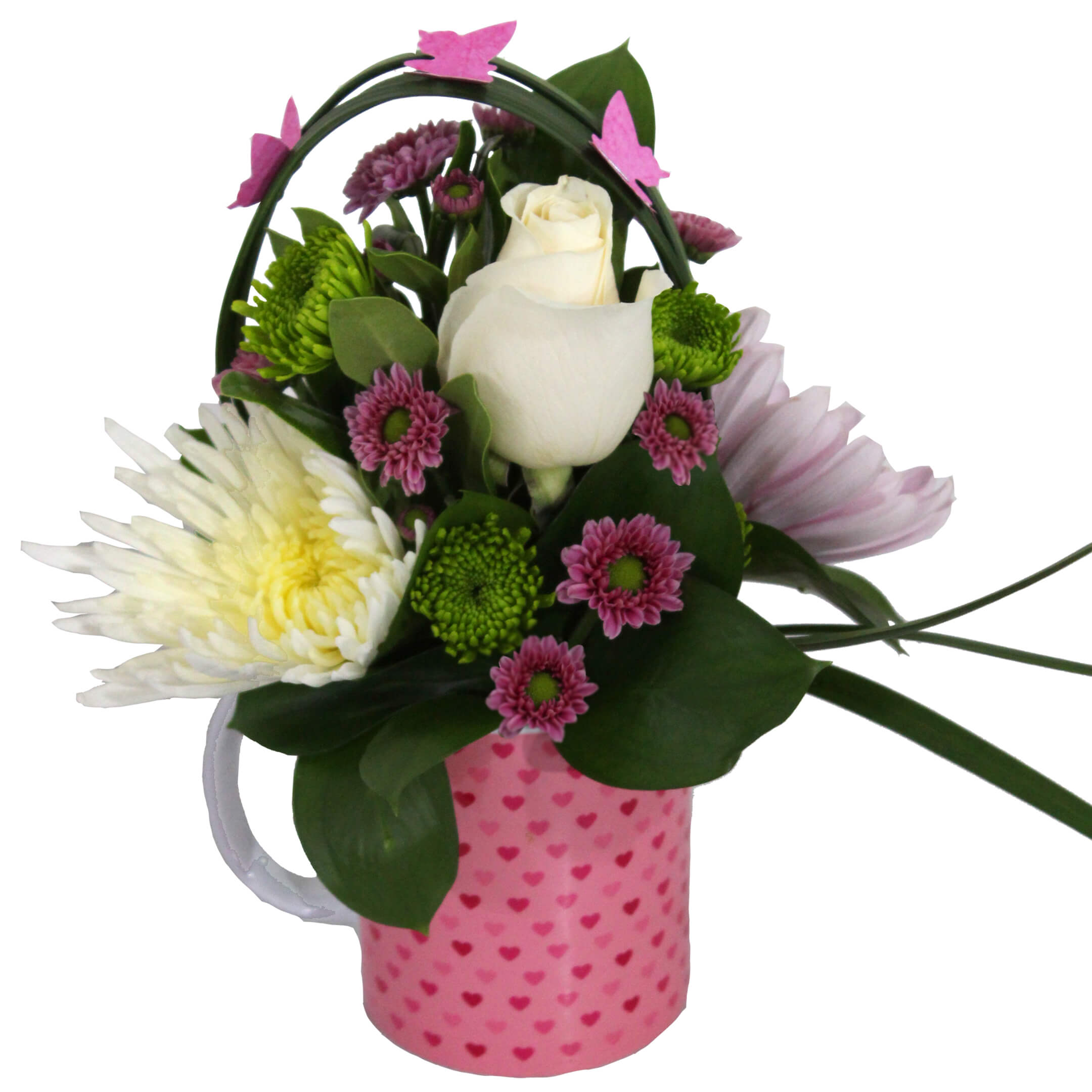 1 Mini Hydrangea/Green Ball/Sunflower/Dianthus, 1 Roses/Spray Rose, 1 Disbud/Spider, 7 Laterals Novelties/Daisies, 12 Laterals Novelties/Micro Poms/Buttons, 9 Laterals Ruscus, 5 Laterals Brillantina/Pittosporum, 1 Lily Grass (3 tips) & 3 Butterfly Touch, Ceramic Mug (Original design).
