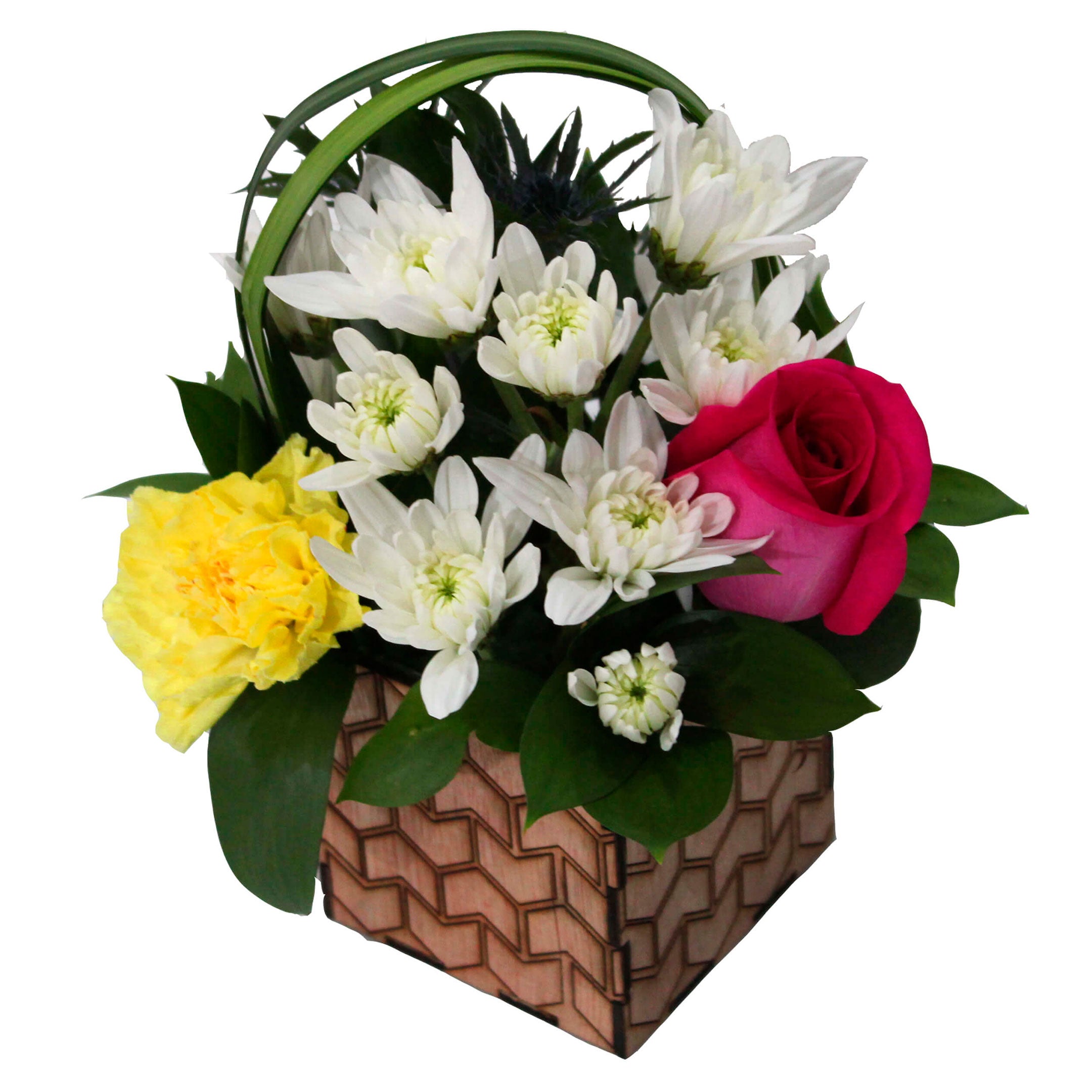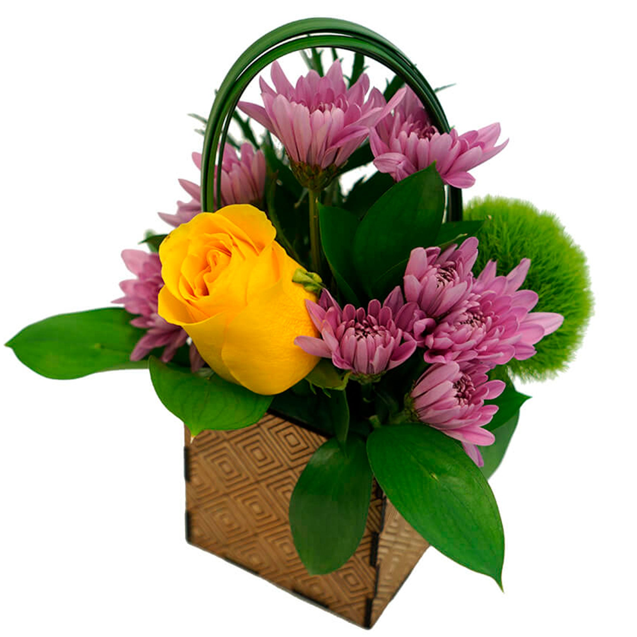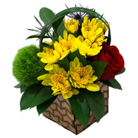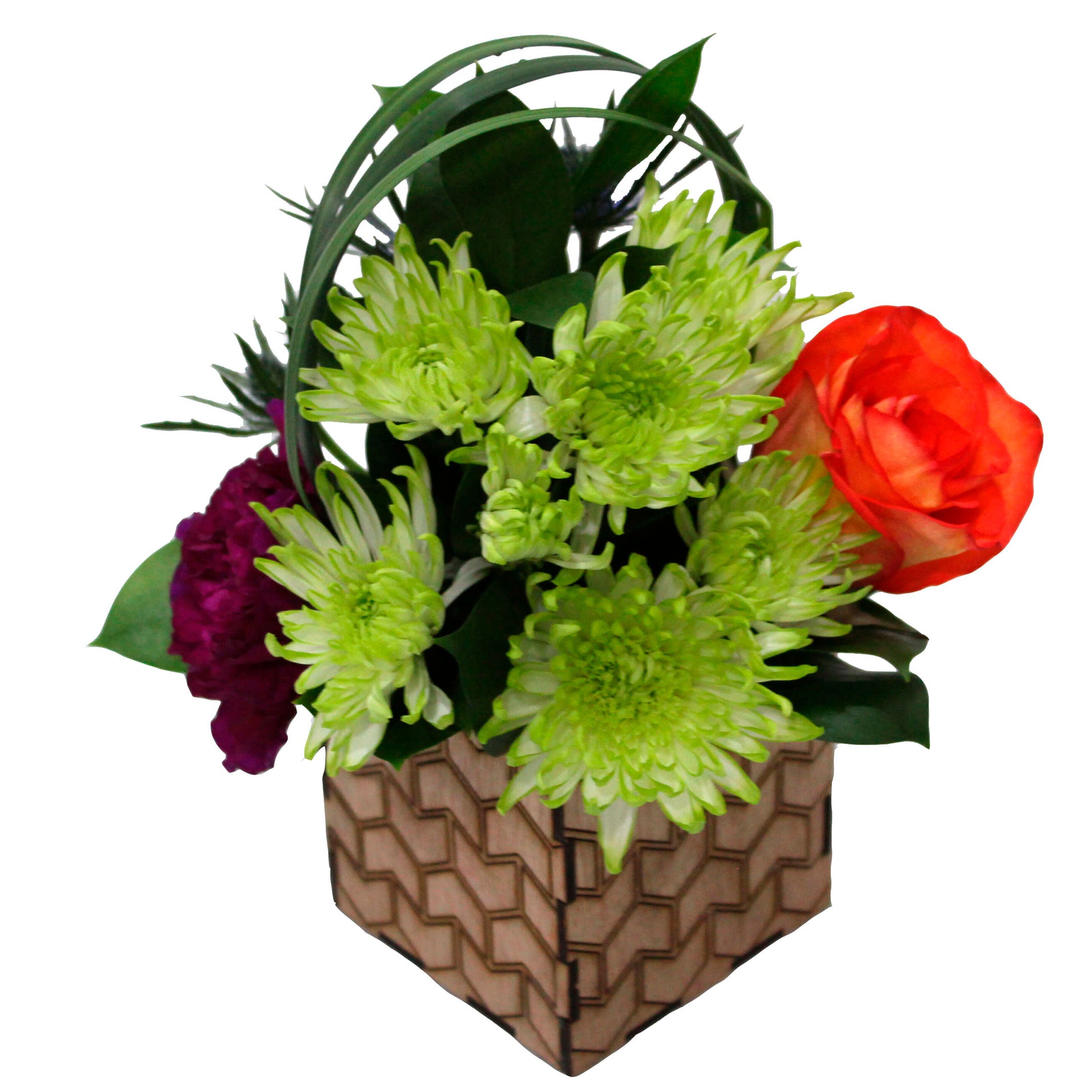 1 Rose, 1 Green Ball/Carnation/Dianthus, 10 Novelty/Button/Micropoms, 1 Liligrass (3 tips), 3 Eryngium, 5 Ruscus, Wood Artisan Container (Geometric form).
