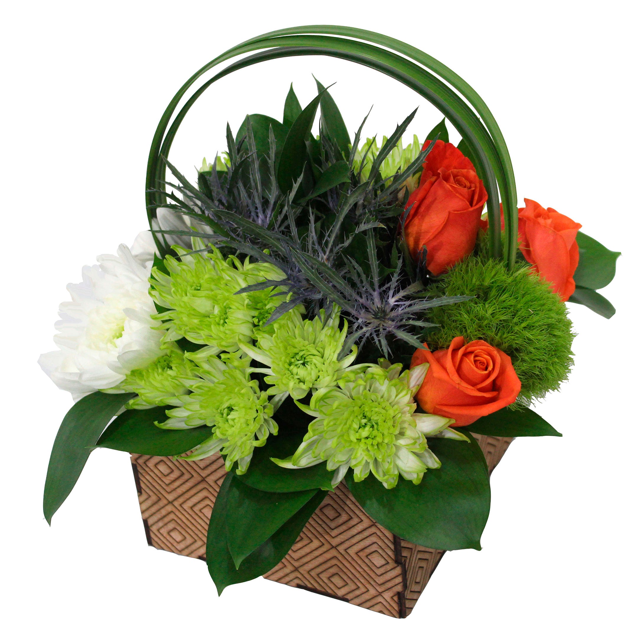 3 Roses, 2 Mini Disbuds, 5 Eryngium,1 2 Novelty/Button Poms, 1 Green Ball/Mini Hydrangea, 1 Liligrass (3 tips), 14 Ruscus, Special Artisan Container with Geometric Form, Liner.