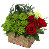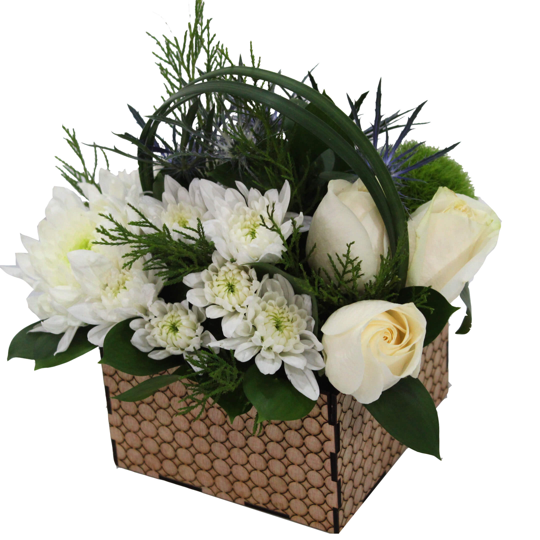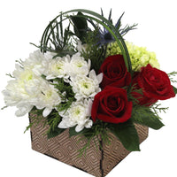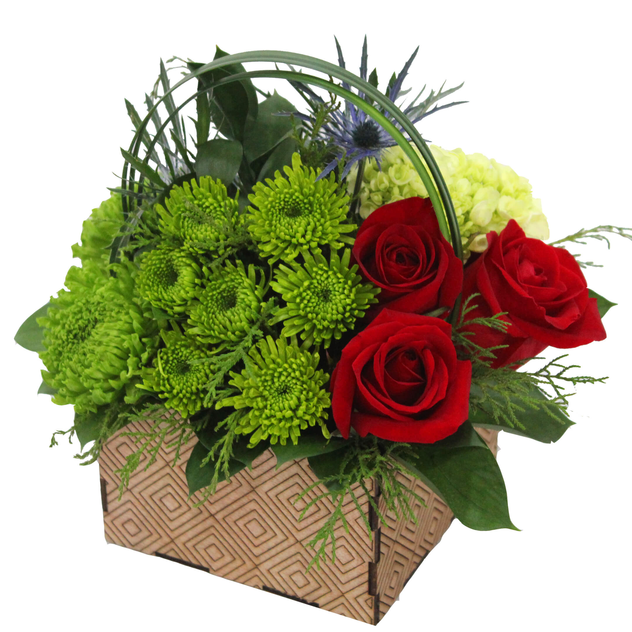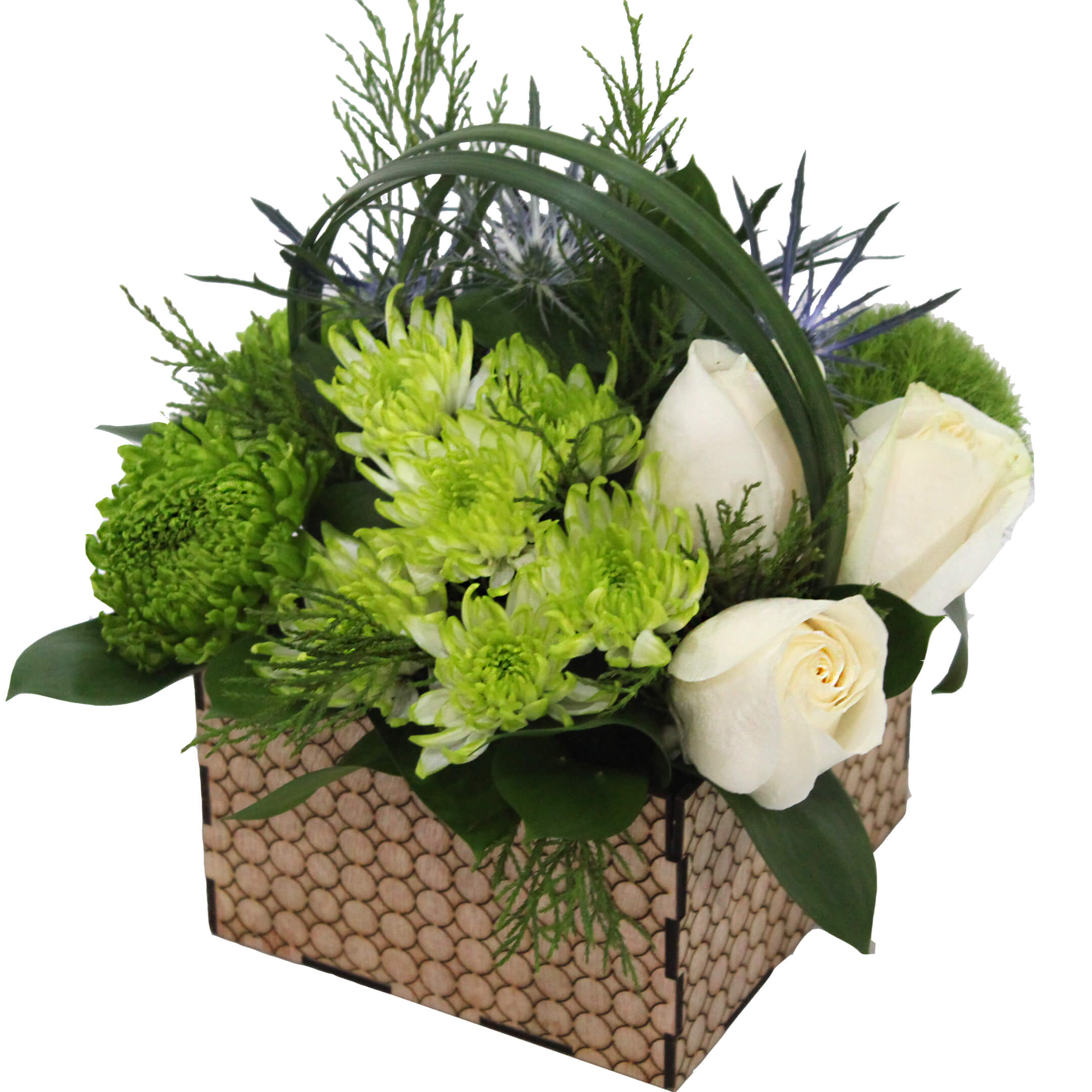 3 Roses, 2 Mini Disbuds, 5 Eryngium,1 2 Novelty/Button Poms, 1 Green Ball/Mini Hydrangea, 1 Liligrass (3 tips), 14 Ruscus, Special Artisan Container with Geometric Form, Liner.