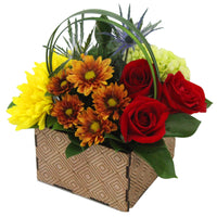 3 Roses, 2 Mini Disbuds, 5 Eryngium,1 2 Novelty/Button Poms, 1 Green Ball/Mini Hydrangea, 1 Liligrass (3 tips), 14 Ruscus, Special Artisan Container with Geometric Form, Liner.