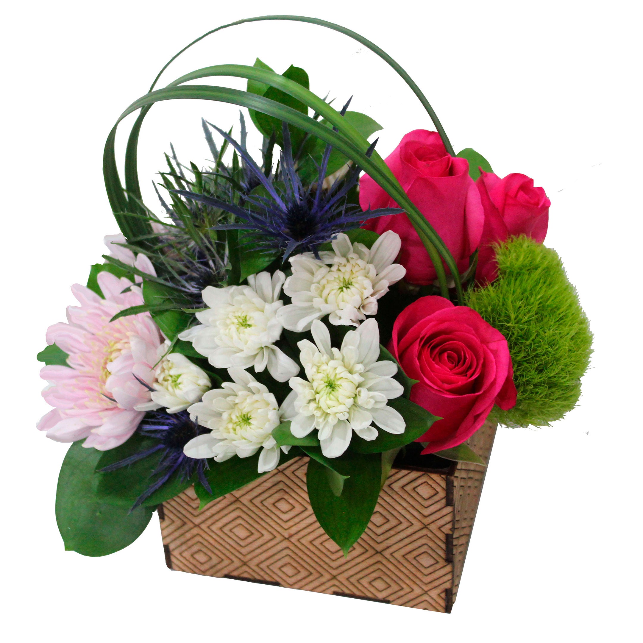 3 Roses, 2 Mini Disbuds, 5 Eryngium,1 2 Novelty/Button Poms, 1 Green Ball/Mini Hydrangea, 1 Liligrass (3 tips), 14 Ruscus, Special Artisan Container with Geometric Form, Liner.