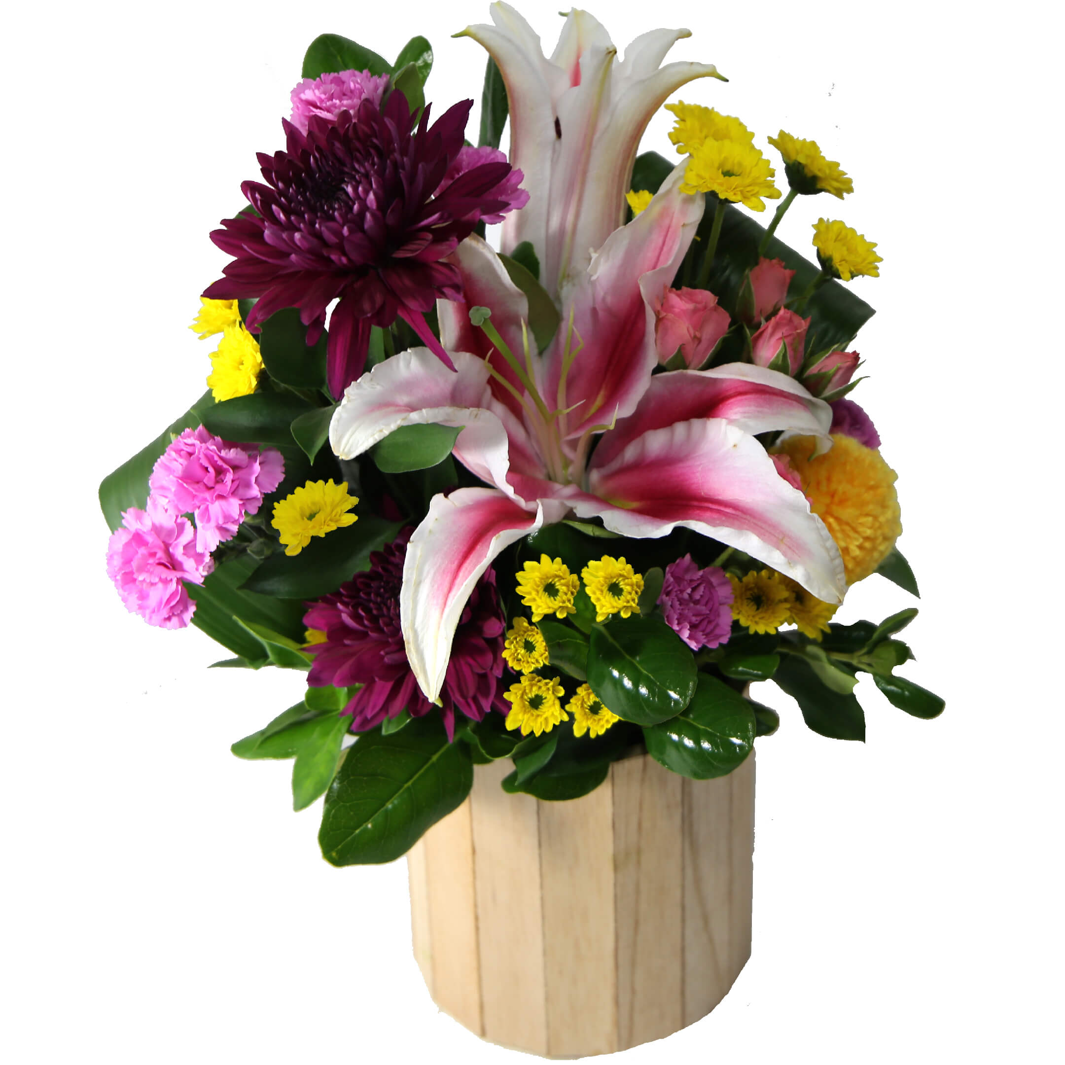 2 Lily Oriental/Asiatic, 2 Spray Rose, 3 Disbud, 8 Micropoms/Titac/Buttons, 5 Mini Carnation, 10 Brillantina, 2 Aspidistra(forms), 7 Ruscus, 1 Wool Pick, wood container, liner.