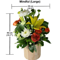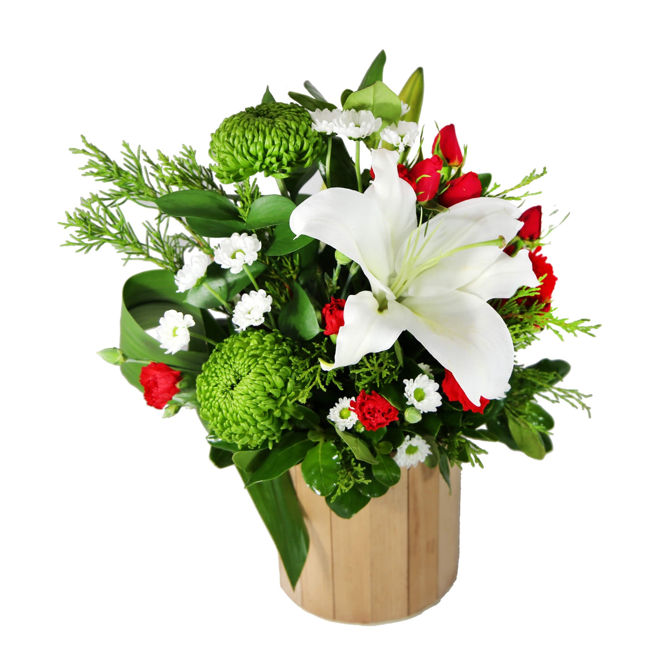 2 Lily Oriental/Asiatic, 2 Spray Rose, 3 Disbud, 8 Micropoms/Titac/Buttons, 5 Mini Carnation, 10 Brillantina, 2 Aspidistra(forms), 7 Ruscus, 1 Wool Pick, wood container, liner.