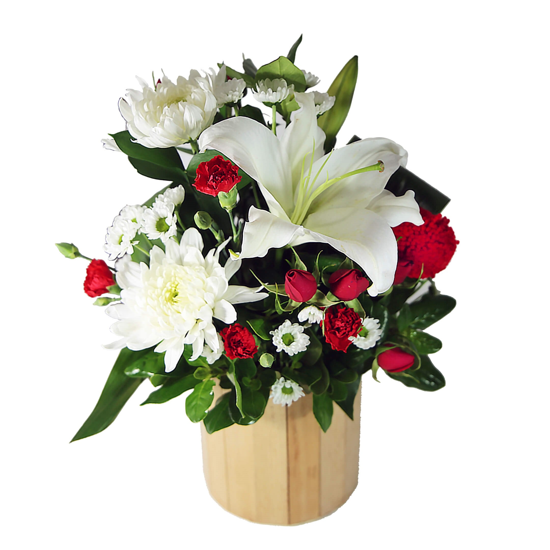 2 Lily Oriental/Asiatic, 2 Spray Rose, 3 Disbud, 8 Micropoms/Titac/Buttons, 5 Mini Carnation, 10 Brillantina, 2 Aspidistra(forms), 7 Ruscus, 1 Wool Pick, wood container, liner.