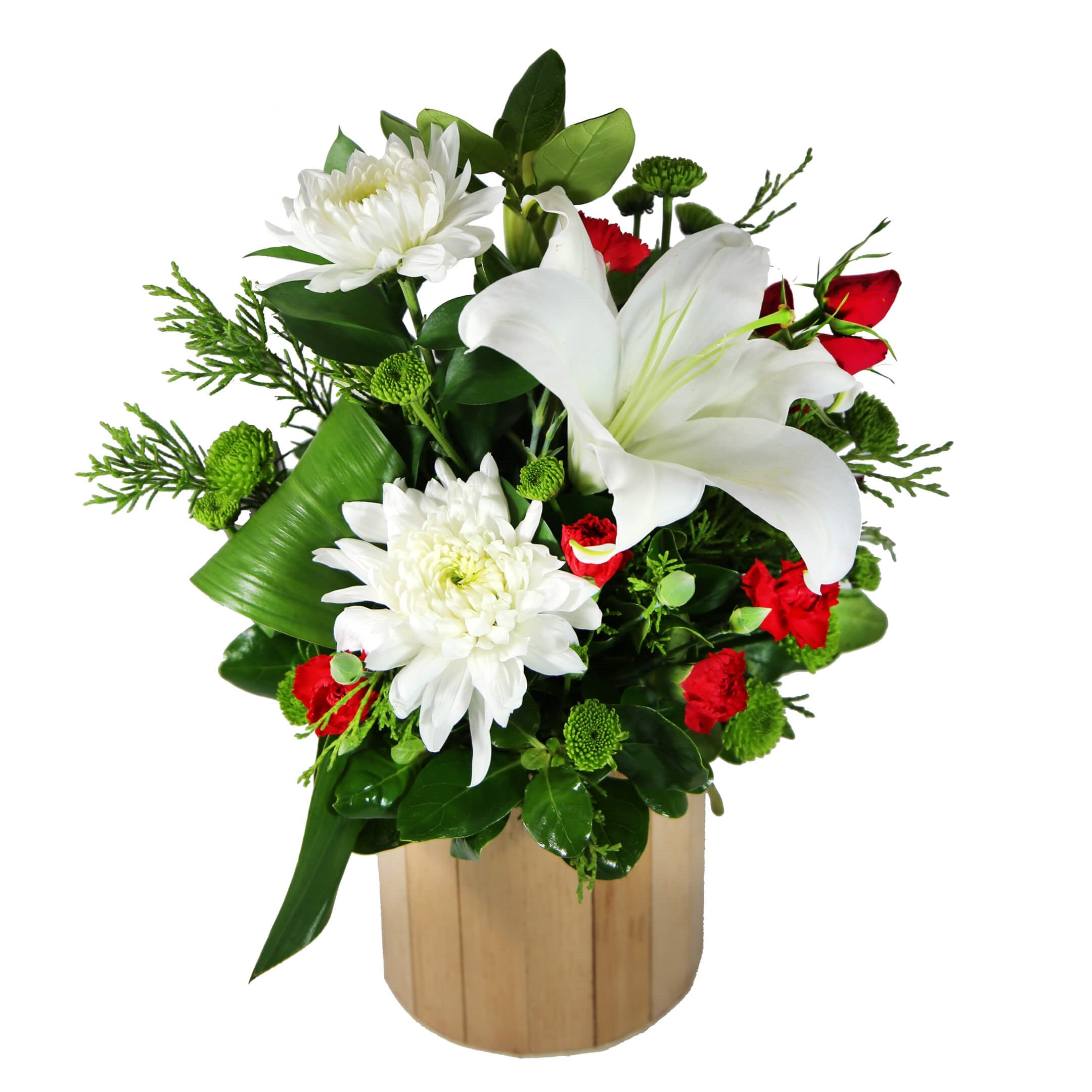 2 Lily Oriental/Asiatic, 2 Spray Rose, 3 Disbud, 8 Micropoms/Titac/Buttons, 5 Mini Carnation, 10 Brillantina, 2 Aspidistra(forms), 7 Ruscus, 1 Wool Pick, wood container, liner.