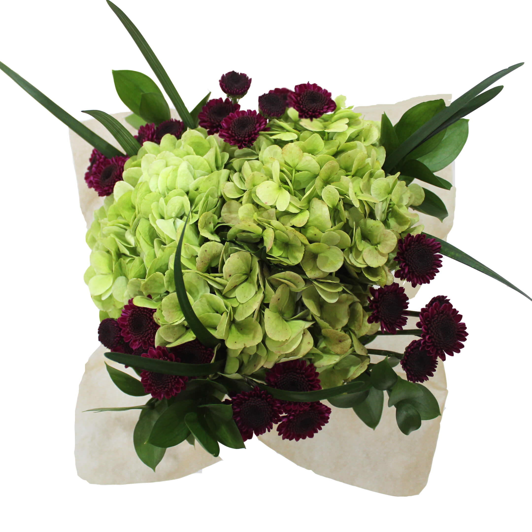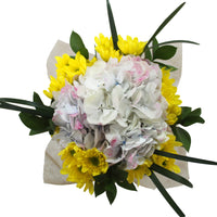 3 Special Hydrangeas, 7 Novelty/Button/Micropoms, 4 Ruscus, 3 Liligrass (3 tips) , Clear sleeve+Wrap+UPC+Flower Food+rope