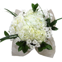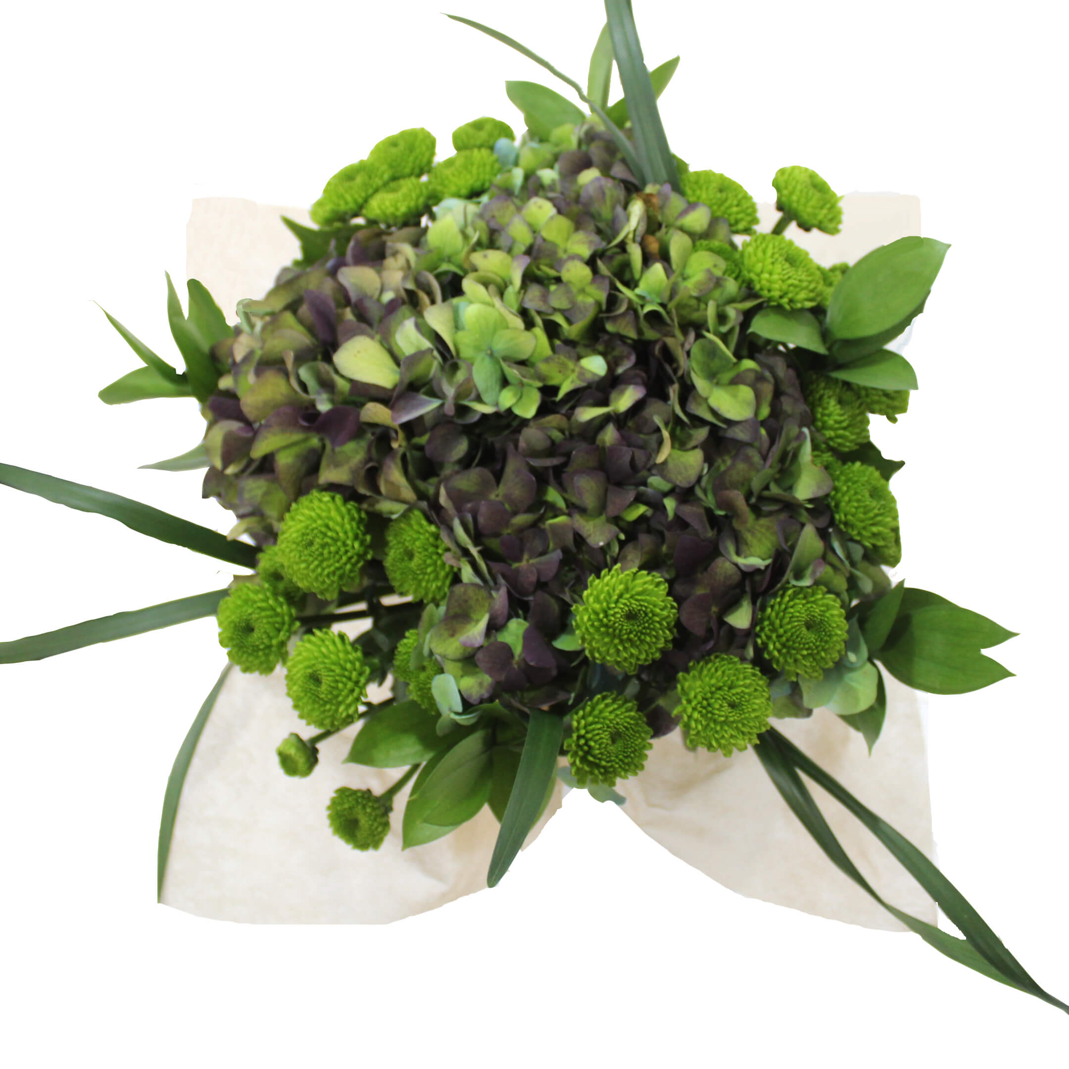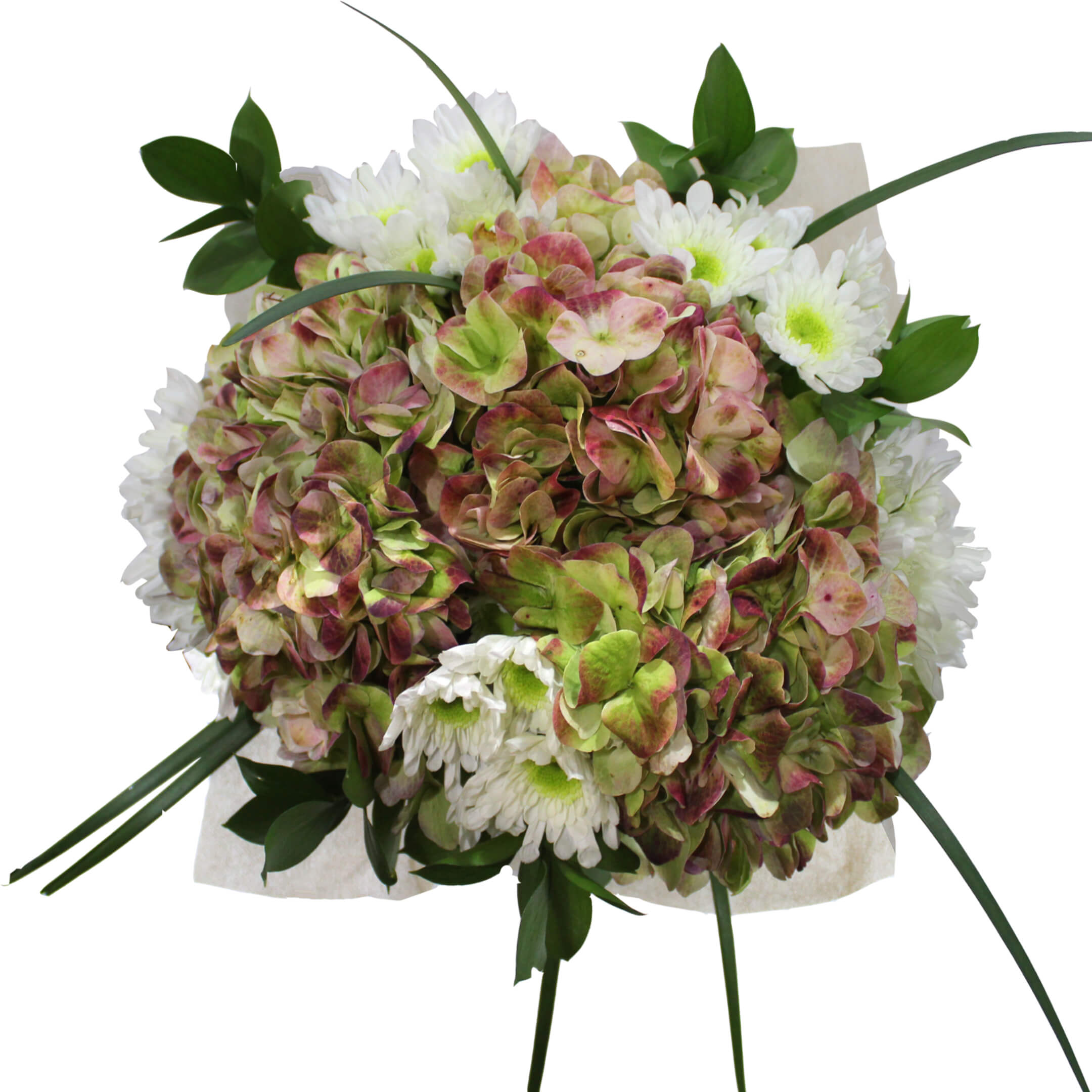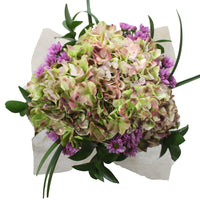 3 Special Hydrangeas, 7 Novelty/Button/Micropoms, 4 Ruscus, 3 Liligrass (3 tips) , Clear sleeve+Wrap+UPC+Flower Food+rope