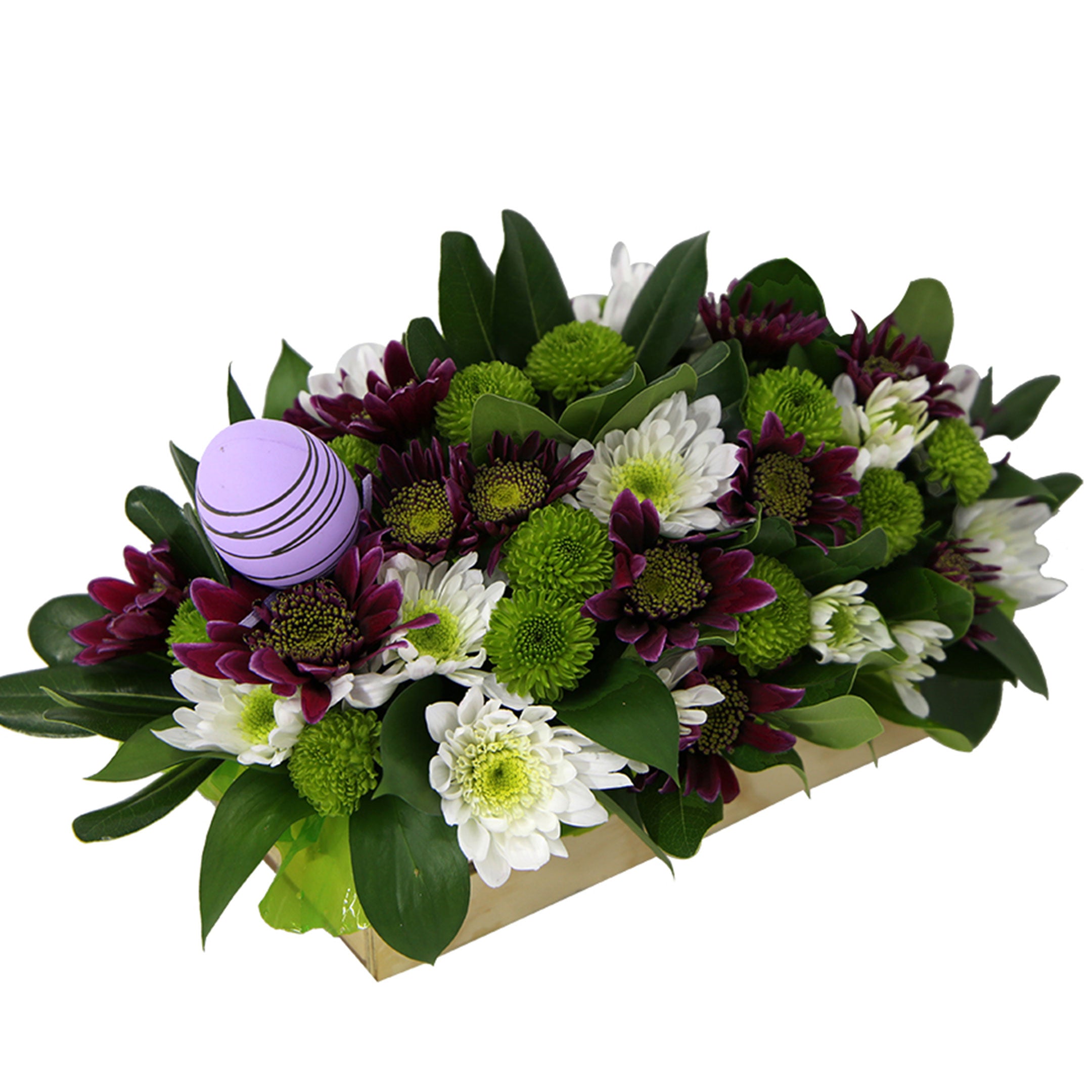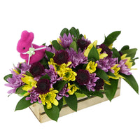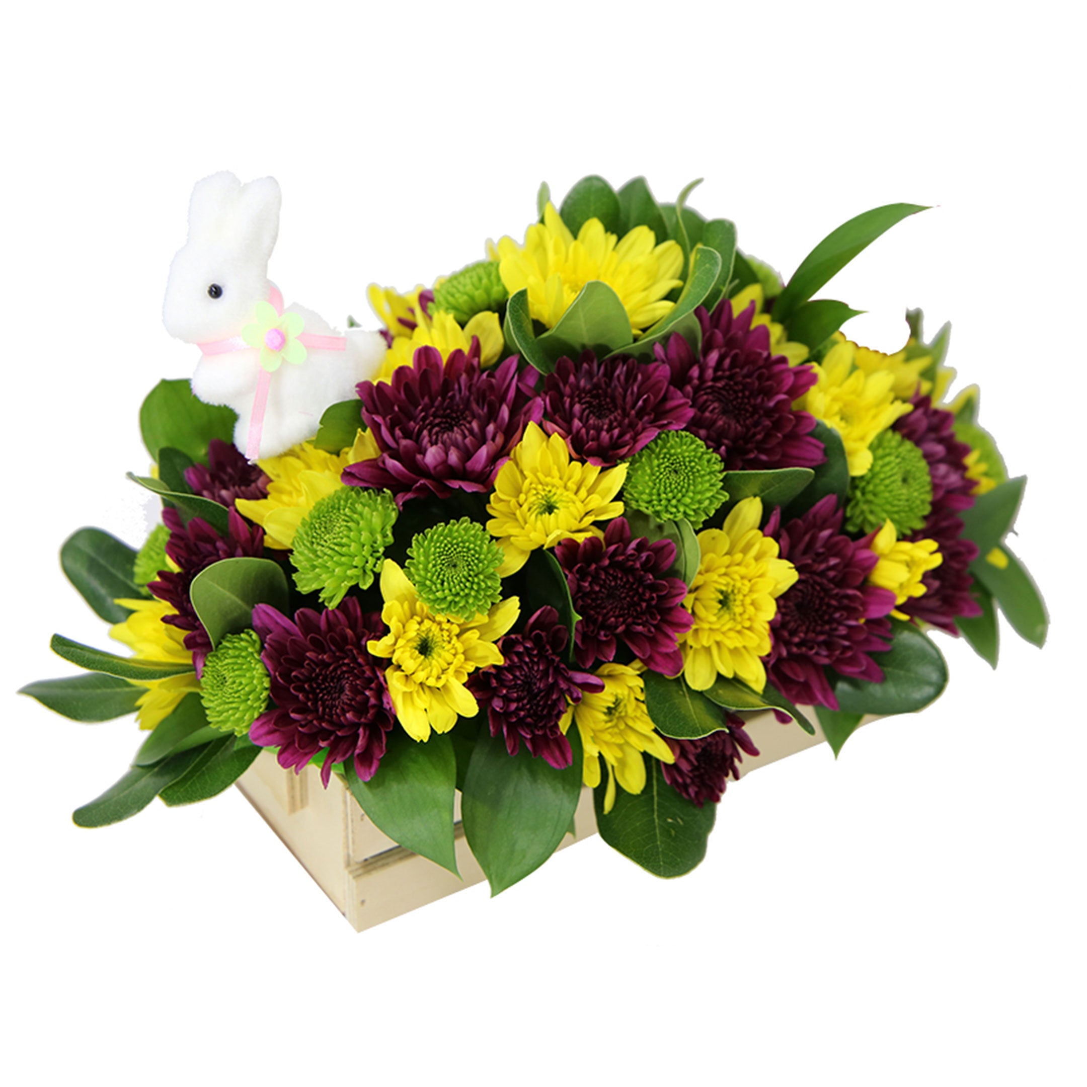 12 Cushion/Daisy/12 Novelty Poms/12 Novelty/Micro/Button Poms, 1 Seasonal Pick, 20 Ruscus, Special Artisan Wood Container, Green Plastic Wrap.