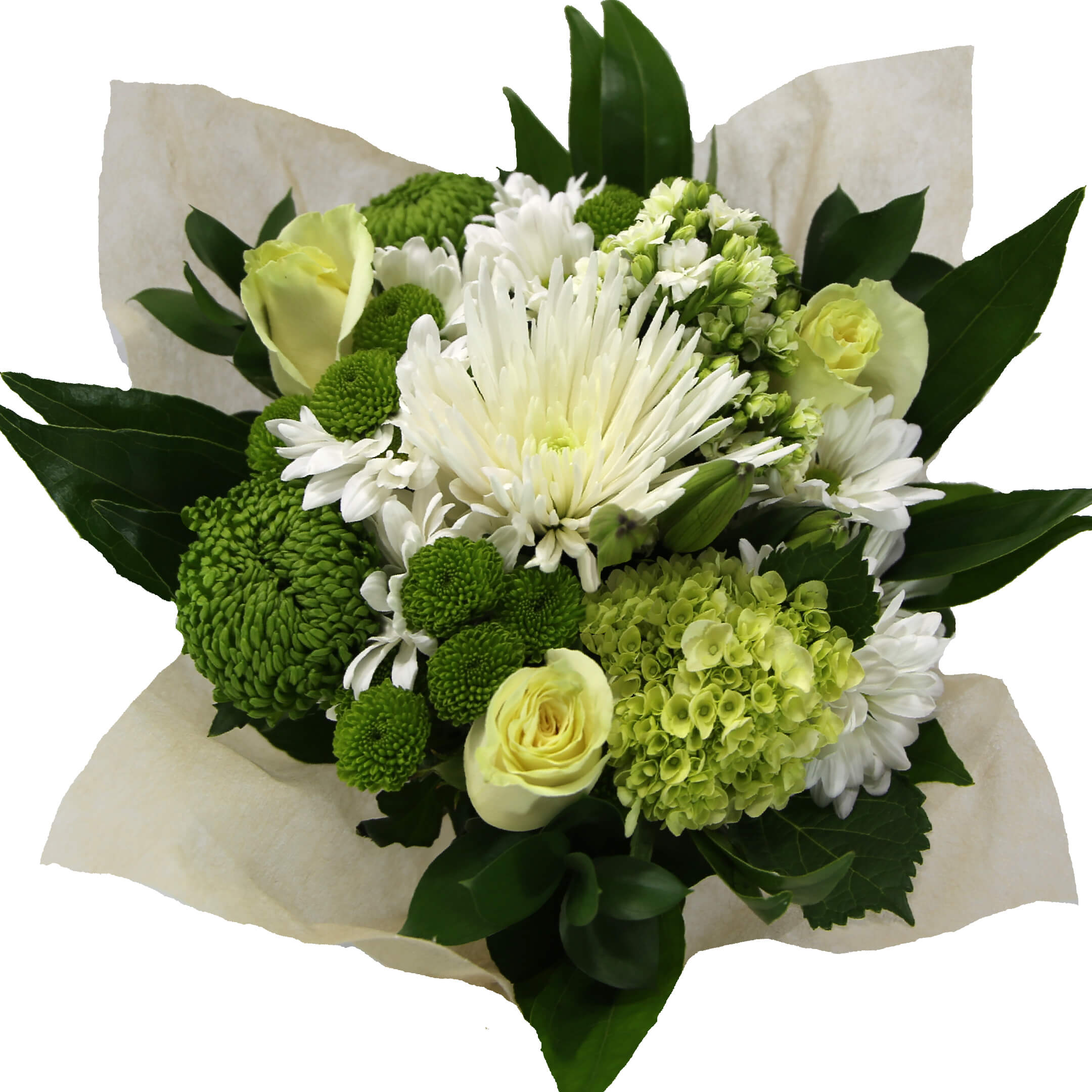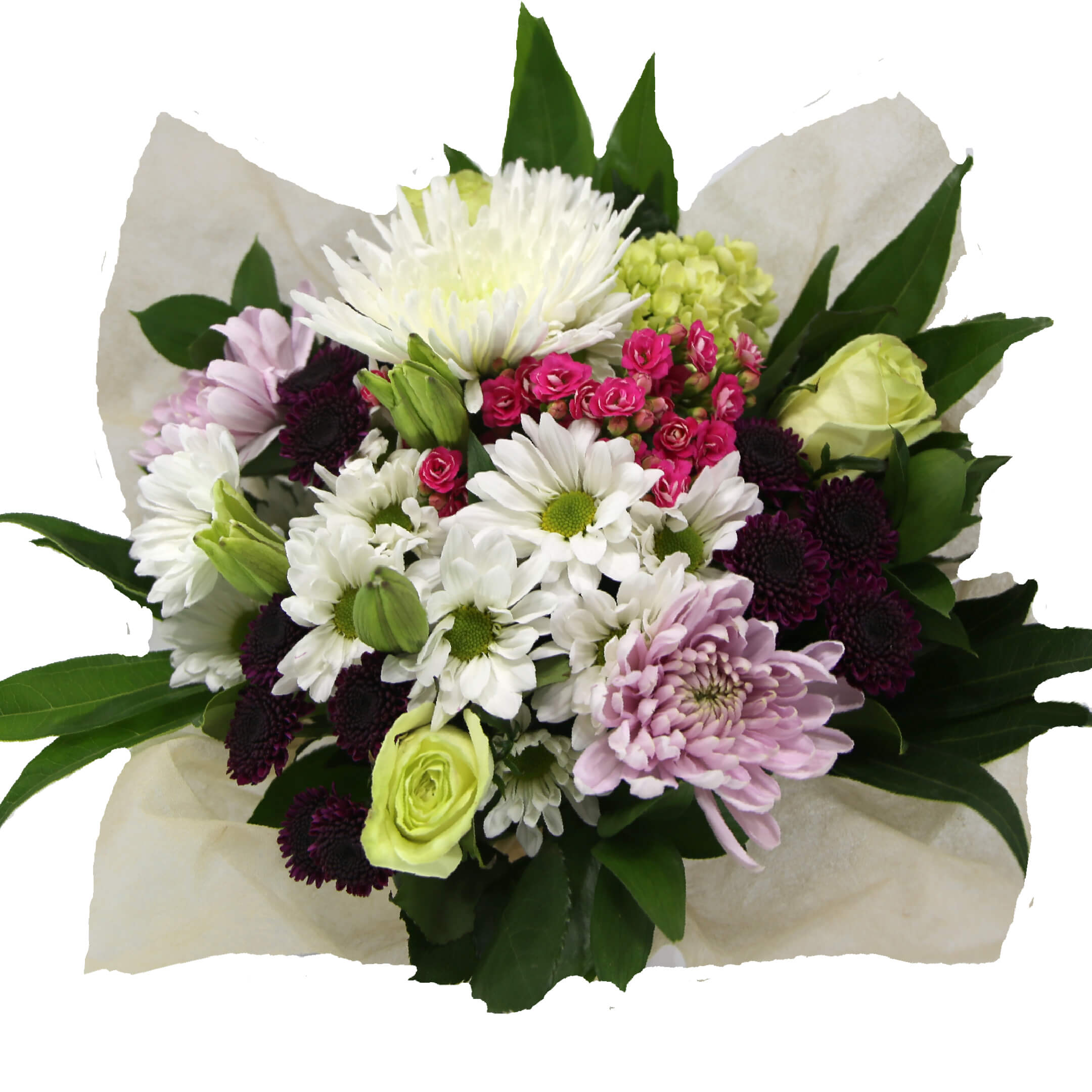 Beautiful mix of: 2 Disbud/Spider, 1 Lily, 2 Roses, 1 Mini Hydrangea, 3 Ruscus, 1 Spider, 3 Daisy, 3 Novelty/Micropoms, 4 Cocculus, 2 Spray Rose/Dianthus/Phlox/Stock/Snapdragon/Hypericum/Eryngium or 1 Kalanchoe, Clear sleeve+Wrap+UPC+Flower food