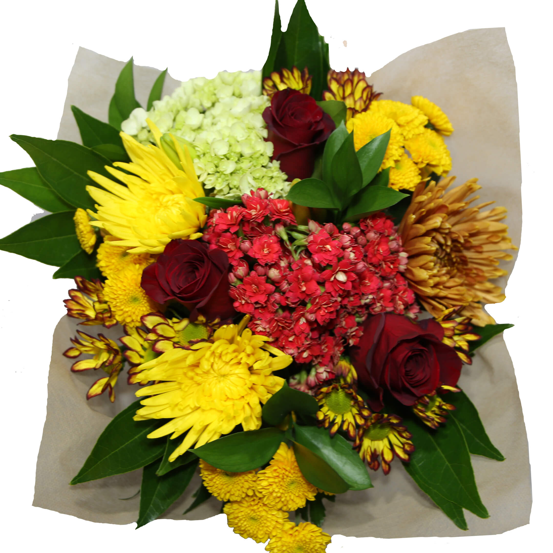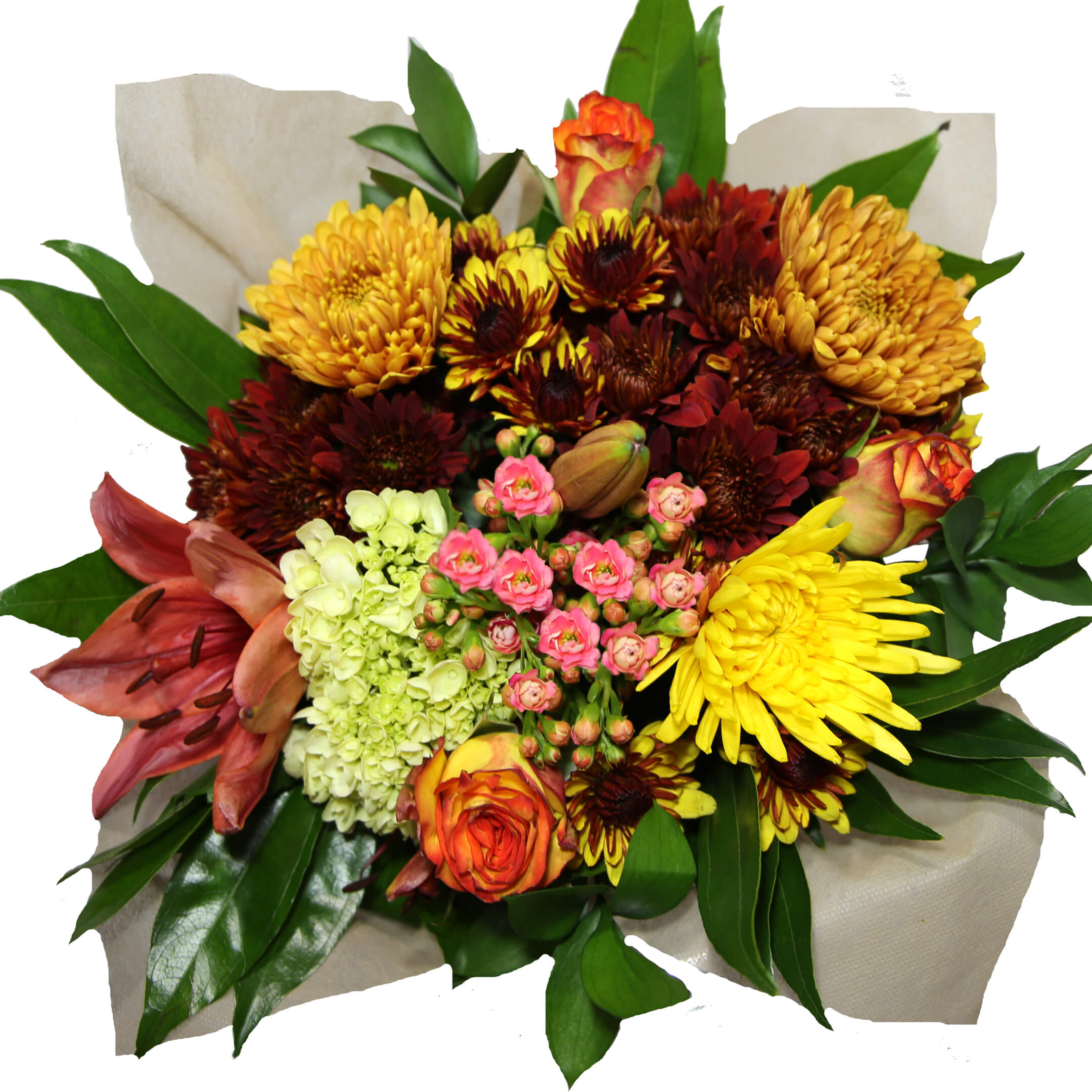 Beautiful mix of: 2 Disbud/Spider, 1 Lily, 2 Roses, 1 Mini Hydrangea, 3 Ruscus, 1 Spider, 3 Daisy, 3 Novelty/Micropoms, 4 Cocculus, 2 Spray Rose/Dianthus/Phlox/Stock/Snapdragon/Hypericum/Eryngium or 1 Kalanchoe, Clear sleeve+Wrap+UPC+Flower food