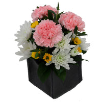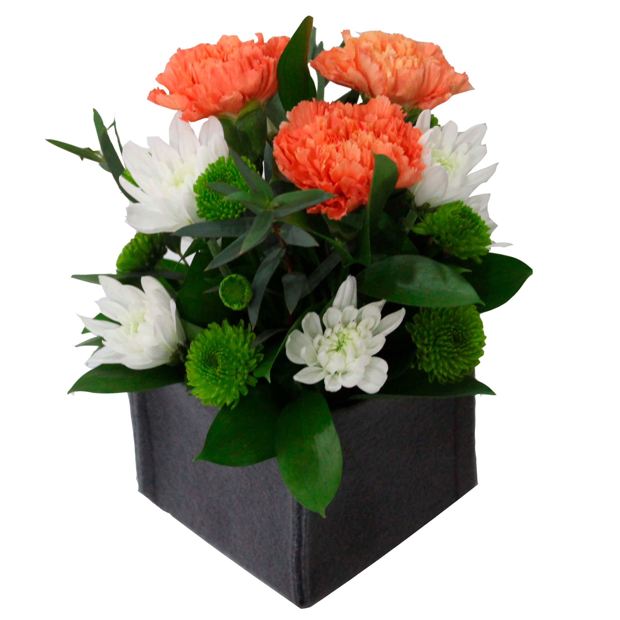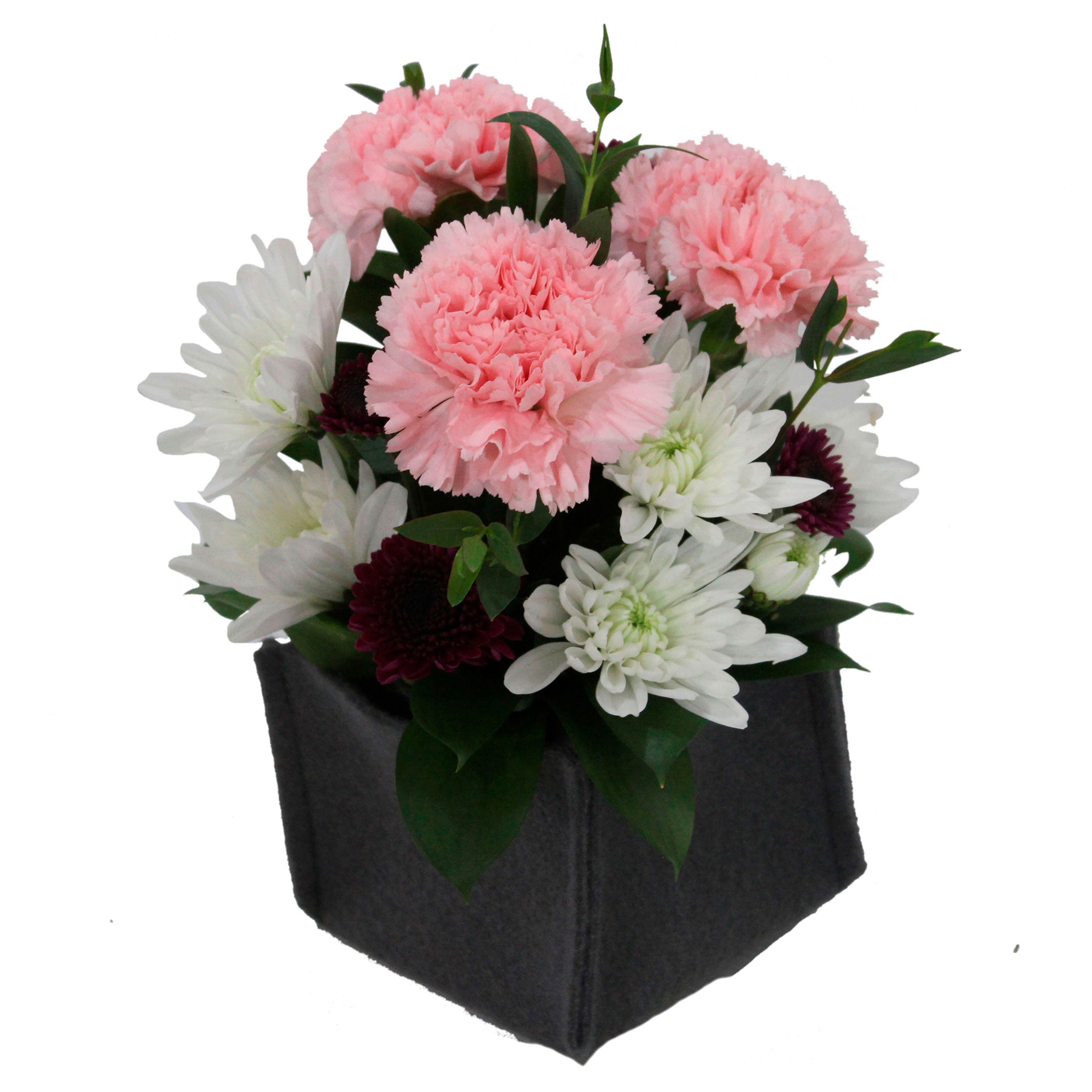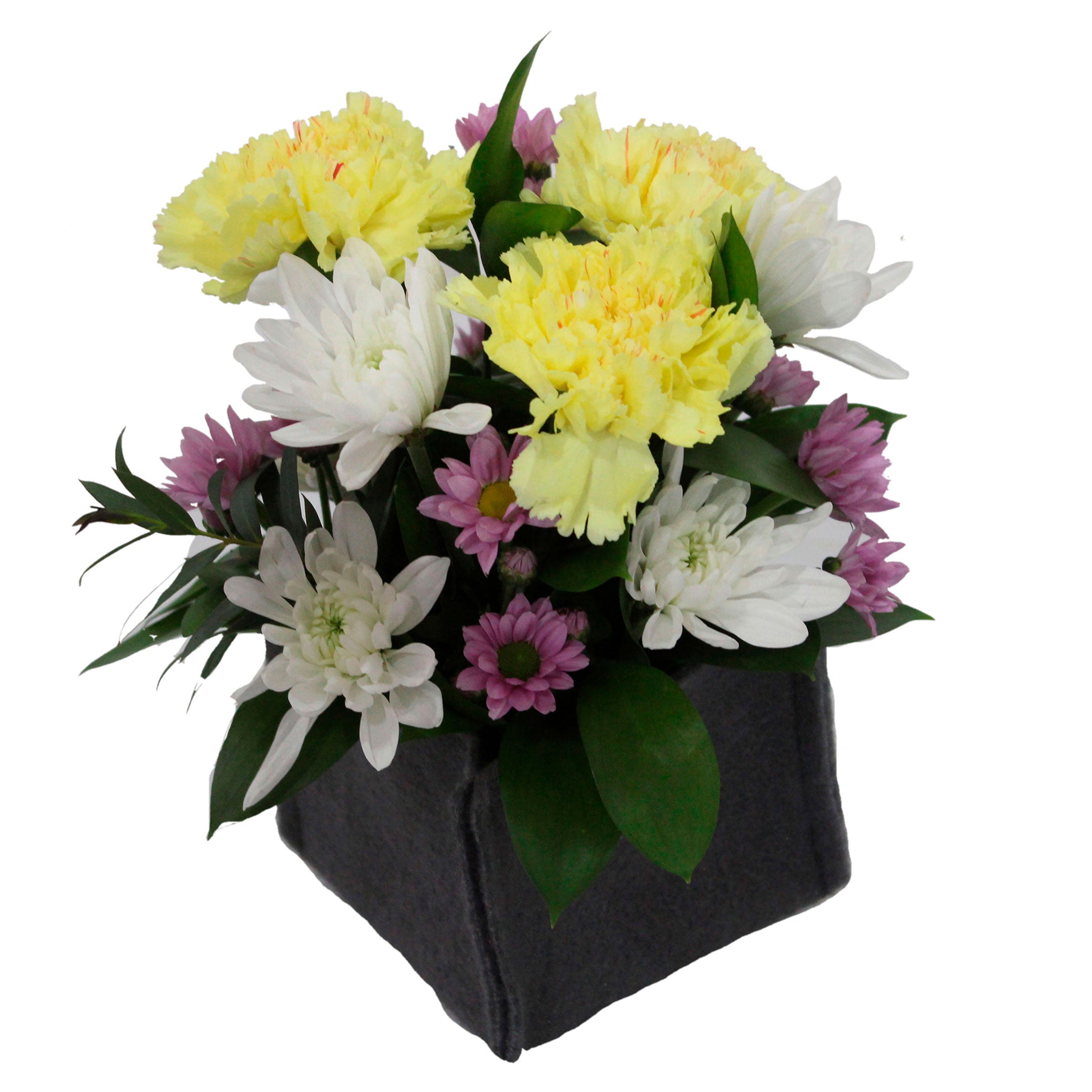 3 Carnation, 6 Cushion/Daisy, 10 Novelty/Button/Micropoms, 8 Ruscus, 3 Small Foliage, Gray Cloth Container.