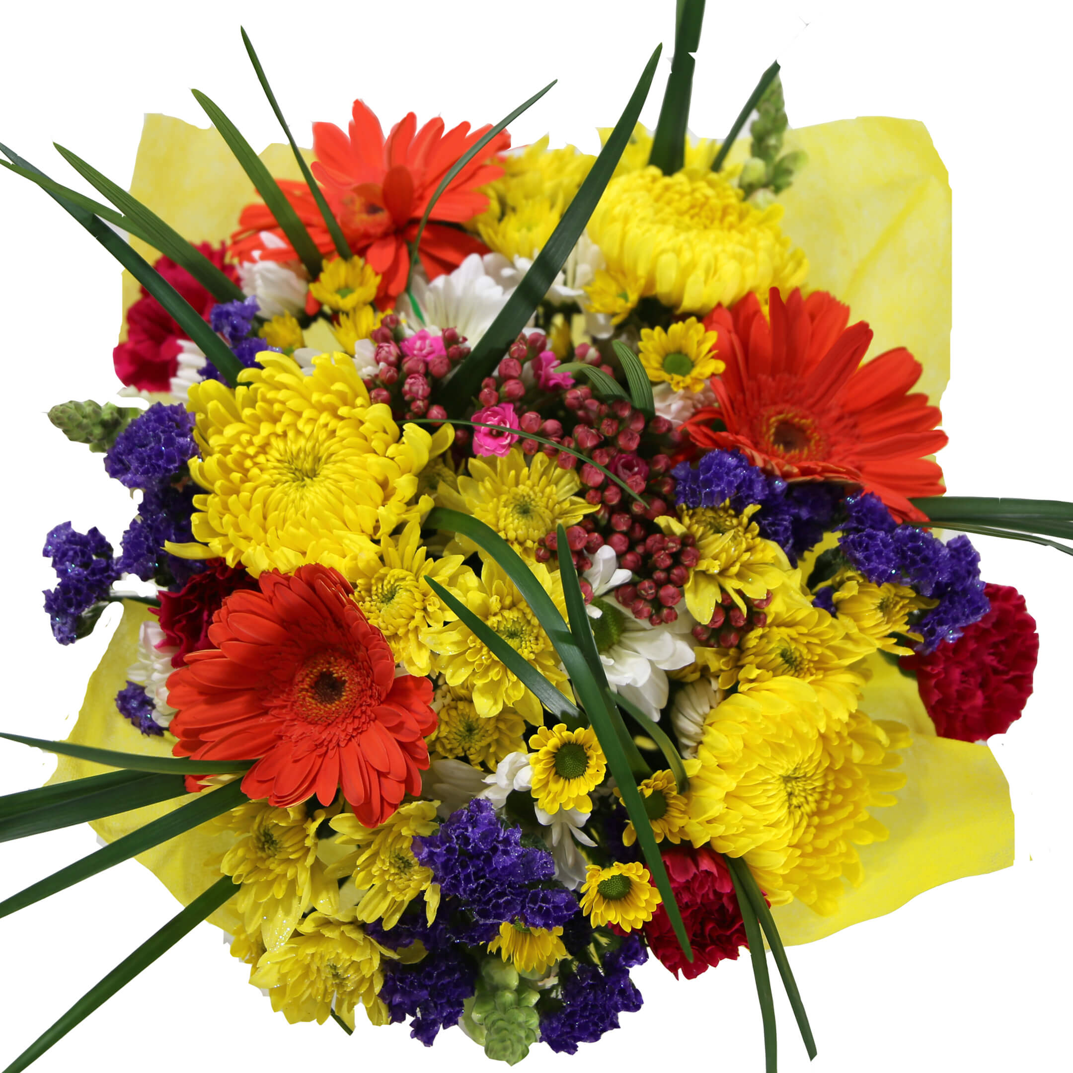 4 Cushion with Murano, 4 Daisy, 3 Novelty/Micropoms, 3 Disbud/Spider, 3 Gerberas/Sunflower/Mini Hydrangeas/Hydrangeas (Painted/Natural)/Football Mums/Roses/Spray Roses/Bells of Ireland/Callas/Pearlized Painted Disbud, 3 Matsumoto/Dianthus/Phlox/Stock/Snapdragon/Star of Bethlehem, 3 Limonium/Statice/Solidago/Gyp/Aster with Murano, 2 Roses/Kale/Lily, 4 Carnation/Mini Carnation/Alstroemeria, 6 Premium Green, Clear sleeve+wrap+UPC+Flower Food