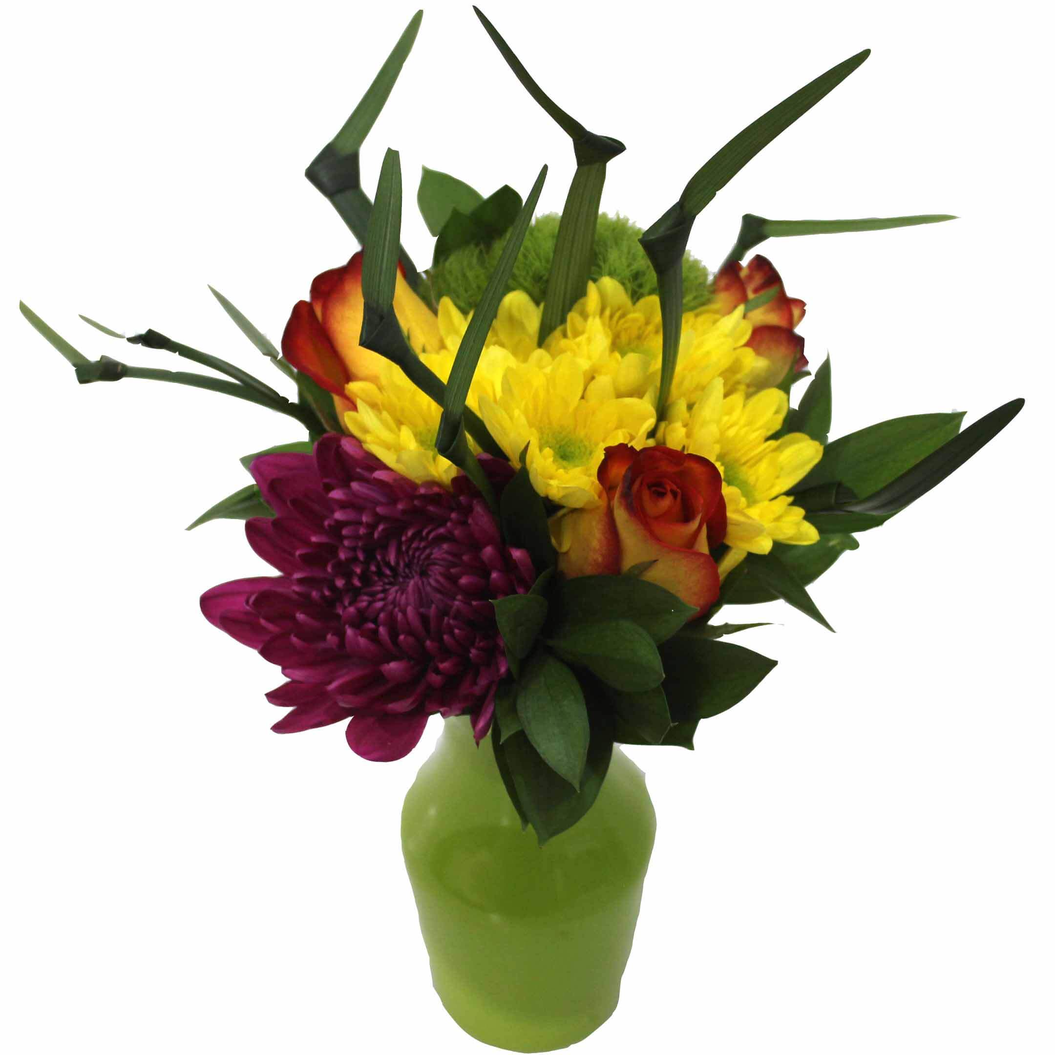 3 Roses/Spray Roses/Dianthus, 1 Disbud, 1 Carnation/Green Ball/Hypericum, 1 Novelty Poms/Cushion/Button/Micropom, 5 Petite Ruscus, 8 Liligrass with Nuts, Clear sleeve/UPC/Flower Food or Glass Container in white or basil green.