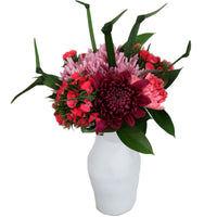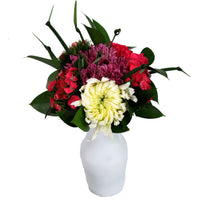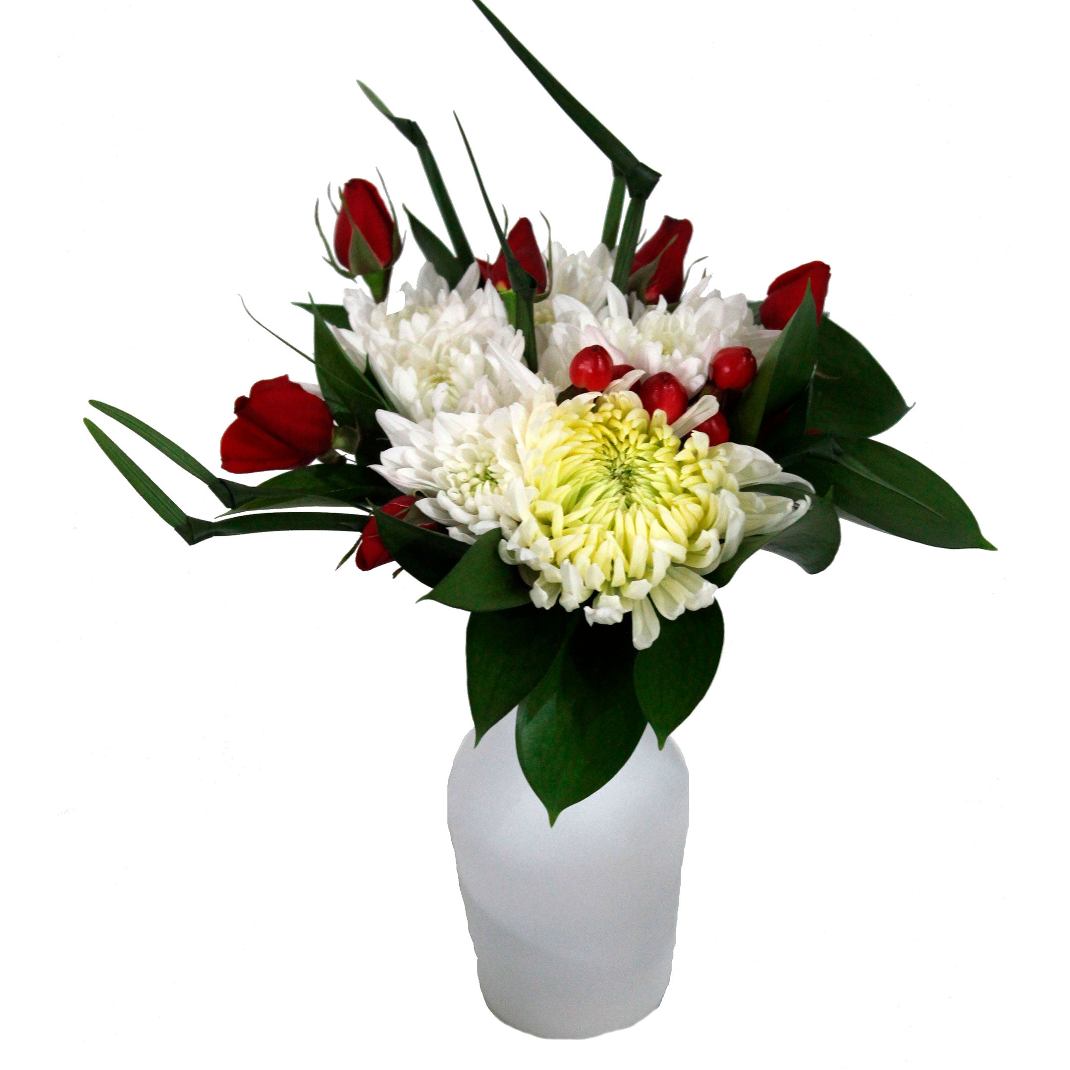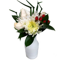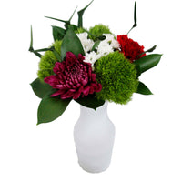 3 Roses/Spray Roses/Dianthus, 1 Disbud, 1 Carnation/Green Ball/Hypericum, 1 Novelty Poms/Cushion/Button/Micropom, 5 Petite Ruscus, 8 Liligrass with Nuts, Clear sleeve/UPC/Flower Food or Glass Container in white or basil green.