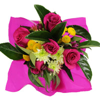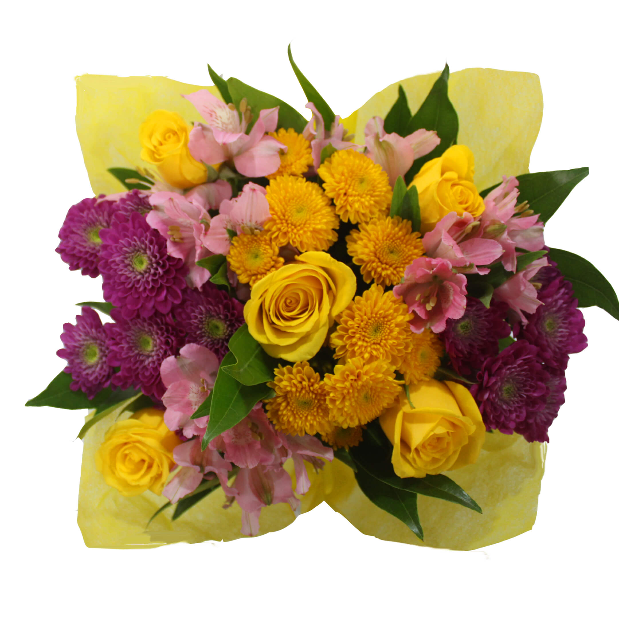 5 Roses, 2 Daisy/Cushion, 2 Novelty Poms, 3 Alstroemeria, 5 Premium Greens, Wrap+Clear sleeve+UPC+Flower Food