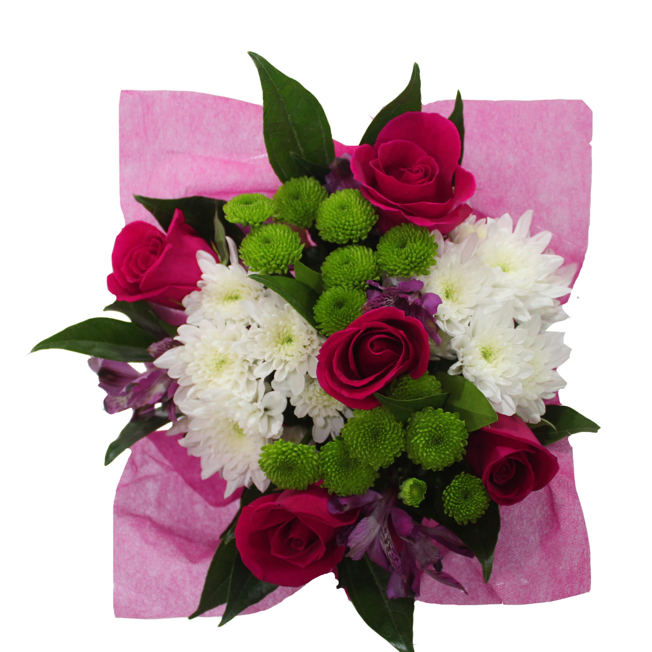 5 Roses, 2 Daisy/Cushion, 2 Novelty Poms, 3 Alstroemeria, 5 Premium Greens, Wrap+Clear sleeve+UPC+Flower Food