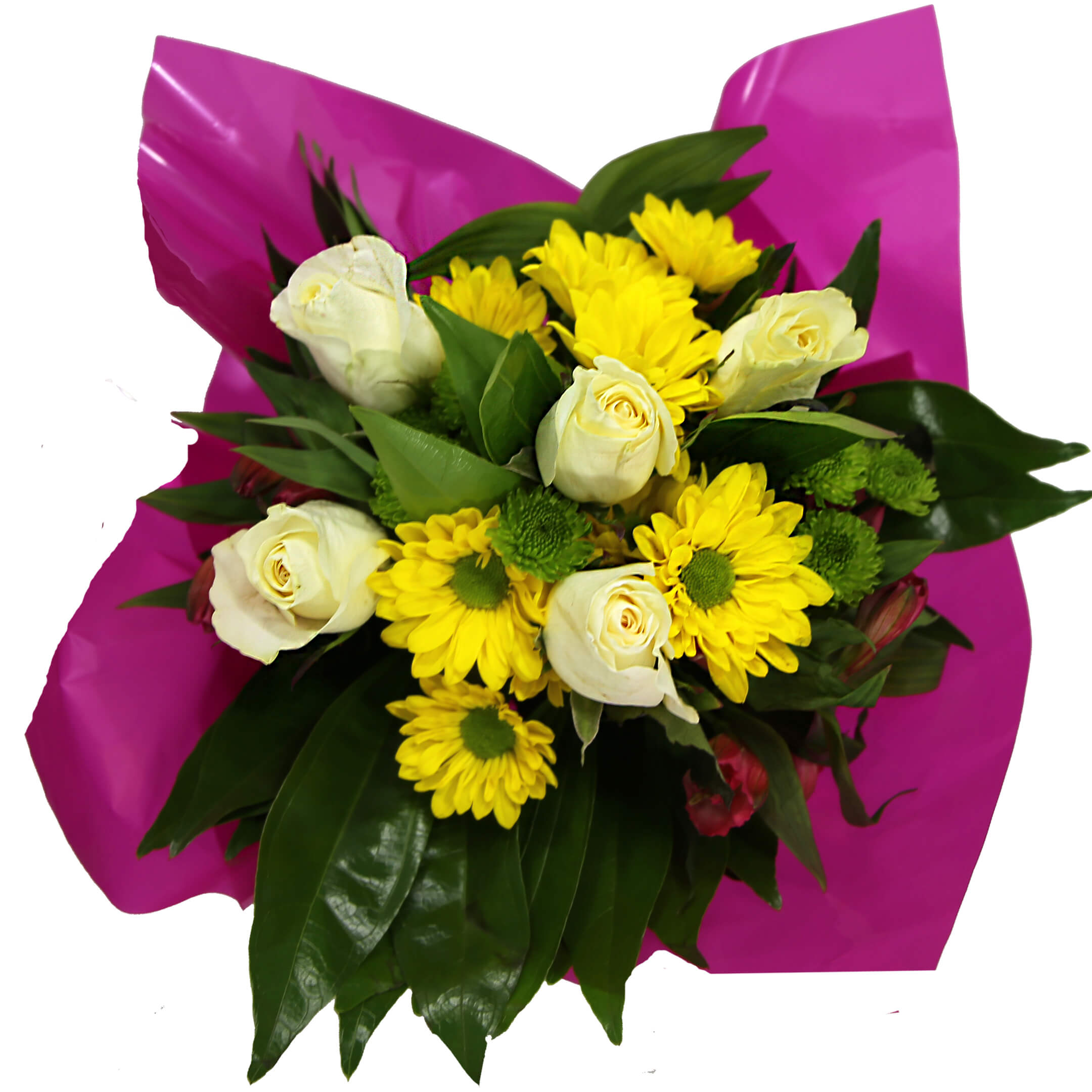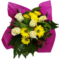 5 Roses, 2 Daisy/Cushion, 2 Novelty Poms, 3 Alstroemeria, 5 Premium Greens, Wrap+Clear sleeve+UPC+Flower Food