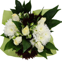5 Roses, 2 Daisy/Cushion, 2 Novelty Poms, 3 Alstroemeria, 5 Premium Greens, Wrap+Clear sleeve+UPC+Flower Food