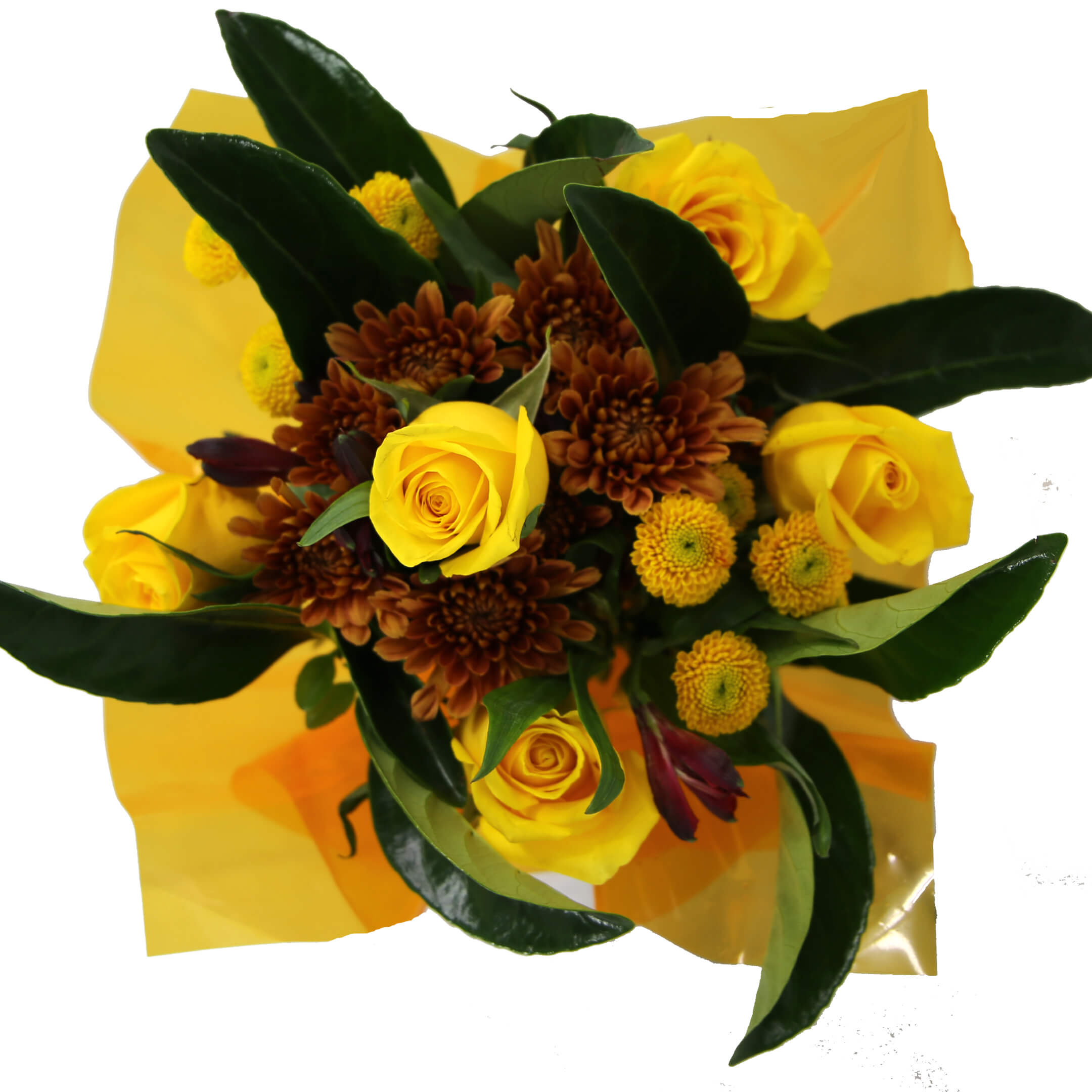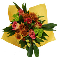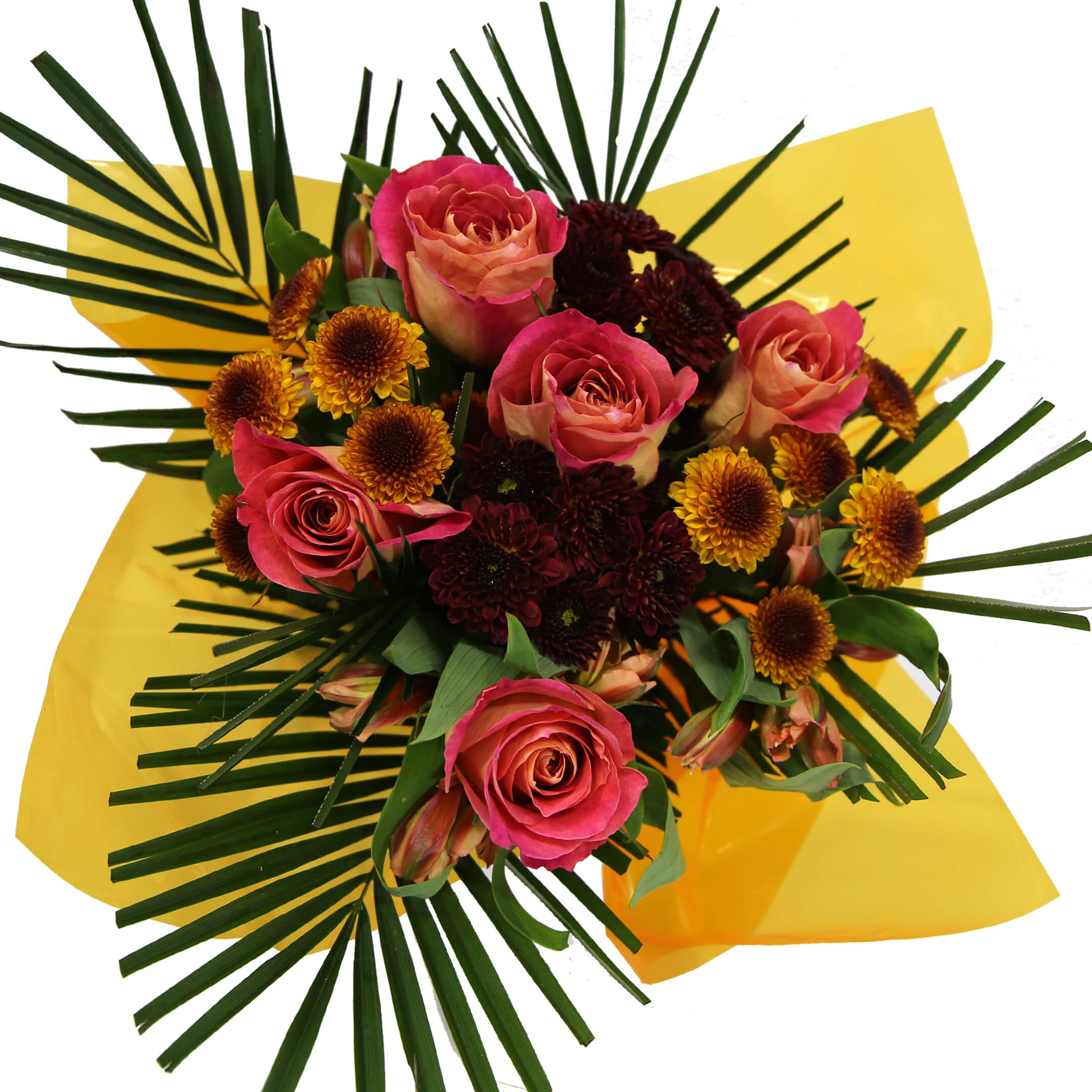 5 Roses, 2 Daisy/Cushion, 2 Novelty Poms, 3 Alstroemeria, 5 Premium Greens, Wrap+Clear sleeve+UPC+Flower Food