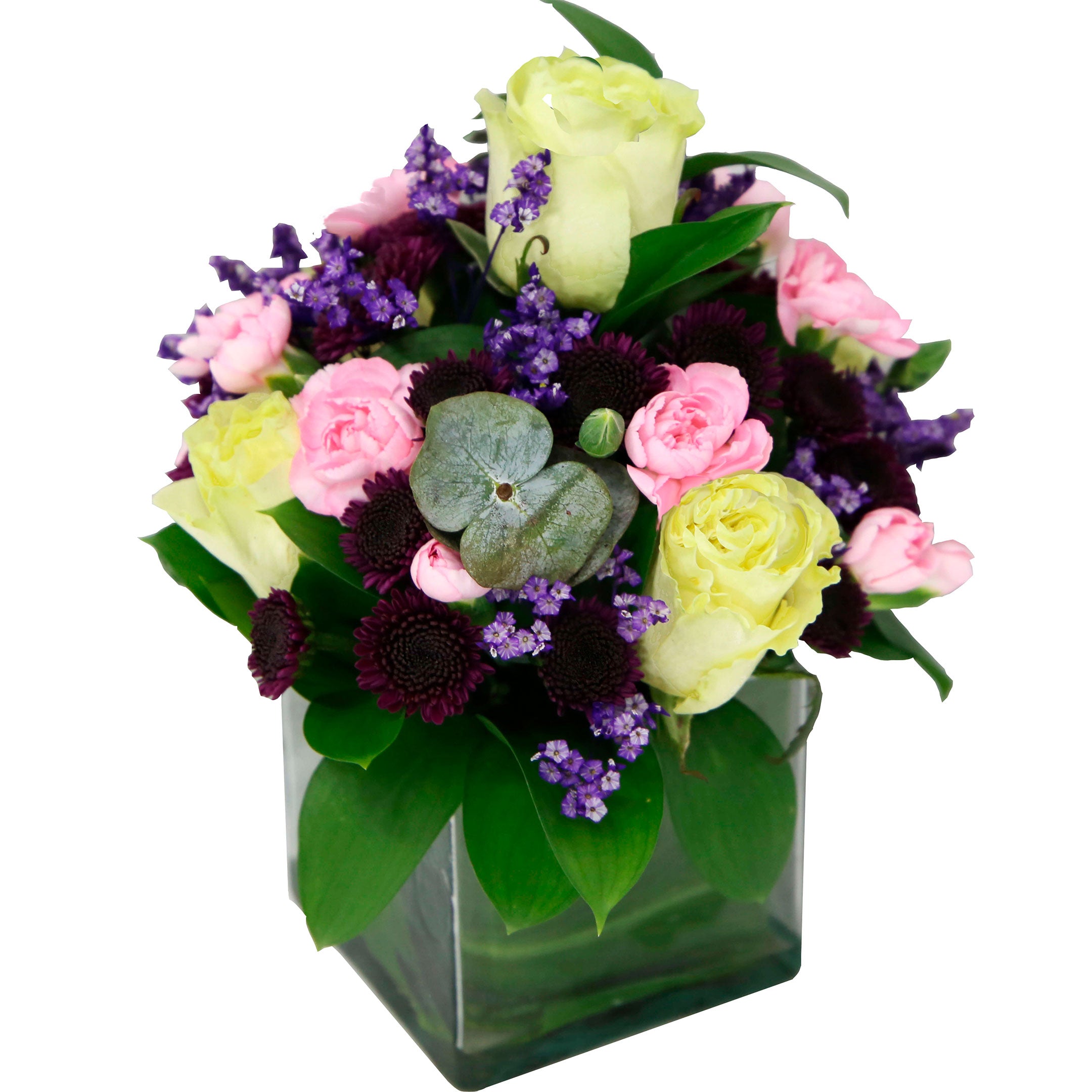 5 Roses, 16 Laterals Buttons/Novelty Poms, 8 Laterals Mini Carnations, 7 Laterals Limonium/Caspia/Gyp/Solidago Natural, 12 Laterals Ruscus & 0.5 Aralia (to cover foam). Glass Container.
